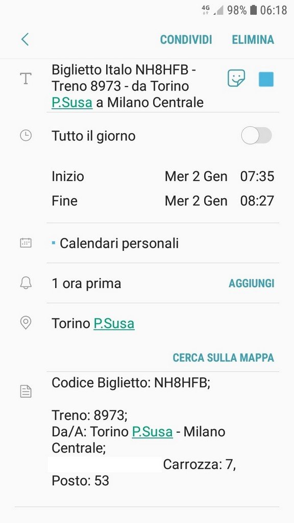 La prima parte del viaggio prevede di raggiungere Milano da Torino, utilizzando un treno ad alta velocità Italo. Acquisto il biglietto online due giorni prima della partenza al prezzo di 13 euro per la sistemazione in ambiente Smart, l'ambiente di viaggio più economico. Per raggiungere la stazione di Milano Centrale utilizzo il treno Italo per Venezia Santa Lucia, in partenza dalla stazione di Torino Porta Nuova alle 7:25.