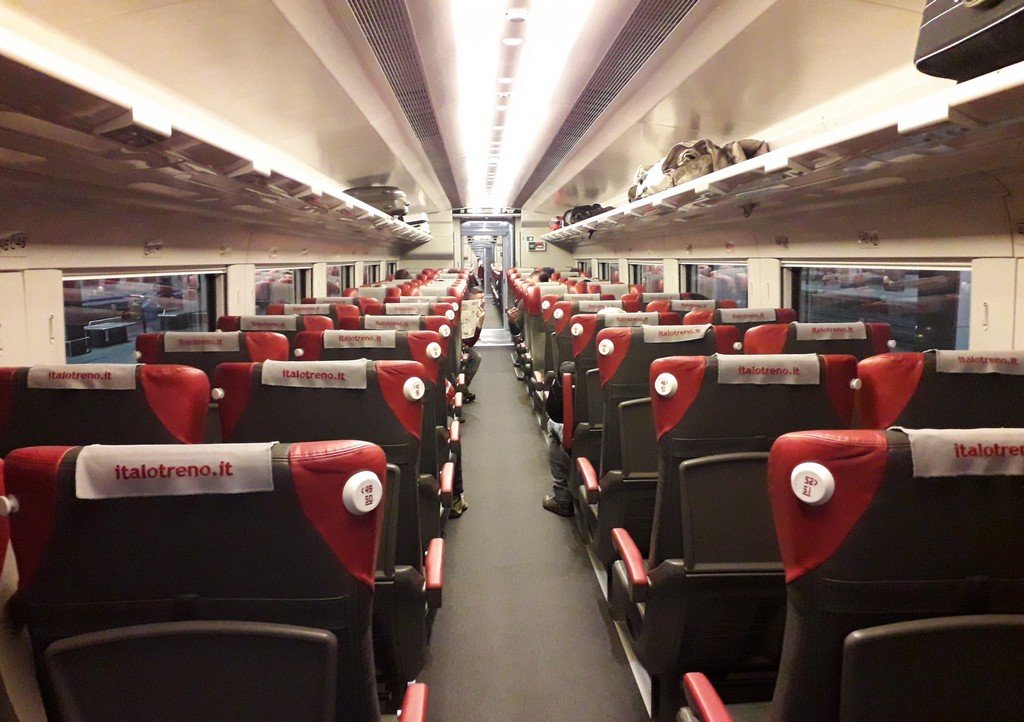 Salgo a bordo e prendo posto nella vettura 7, dove ho assegnato il posto. Italo non prevede la possibilità di scelta del posto in fase di acquisto per i biglietti in ambiente Smart, ma rende possibile la scelta solo per gli ambienti Prima e Club Executive, quindi mi è stato assegnato il posto in maniera automatica. La disposizione dei posti è su file di due, per la maggior parte a correre. Tutto il treno si presenta in ordine e pulito, sono disponibili prese elettriche a tutti i posti, connessione wifi e monitor informativi a bordo. I sedili sono abbastanza comodi, mentre lo spazio attorno agli stessi è sufficientemente ampio. Alcuni posti non sono allineati con i finestrini, lo spazio per i bagagli è ricavato al di sopra dei sedili in apposite rastrelliere oppure in appositi vani a terra che però sono presenti solo nei vestiboli di alcune carrozze. Il treno non dispone di un area bar, ma sono disponibili distributori automatici di snack e bevande.