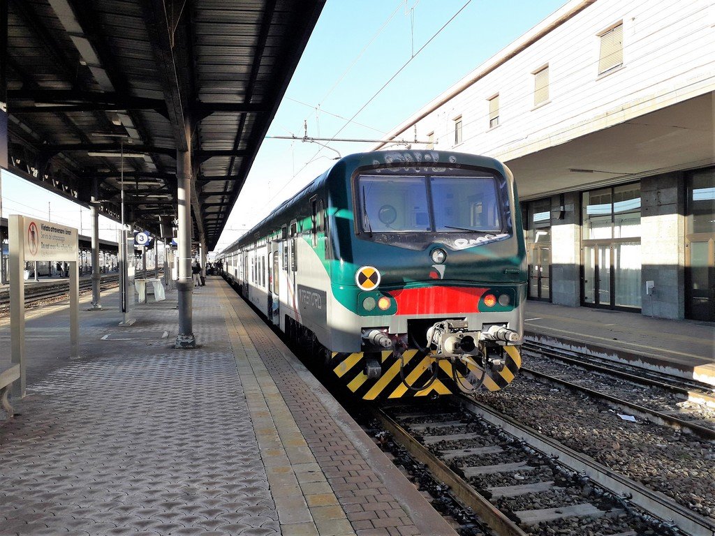 Il treno è fermo al binario 2 della stazione da parecchio tempo e le porte vengono aperte circa 10 minuti prima dell'orario di partenza previsto. Salgo a bordo del treno, che si presenta in discrete condizioni di ordine e pulizia. Le vetture sono del tipo ristrutturato, ma non sono disponibili a bordo prese elettriche né monitor informativi, mentre sono disponibili annunci audio su prossime fermate ed itinerario del treno. Il climatizzatore mantiene a bordo una temperatura adeguata, anche se è abbastanza rumoroso. Le carrozze Piano Ribassato sono vetture costruite appositamente per il traffico pendolare vicinale tra gli anni 1965 e 1982 e sono poi state ristrutturate a partire dalla metà degli anni 2000. La velocità massima ammessa è di 140 km/h e possono ospitare fino a 170 passeggeri suddivisi in tre comparti. Devono il loro nome al piano di accesso basso,a livello del marciapiede, esempio unico al momento della loro immissione in servizio.