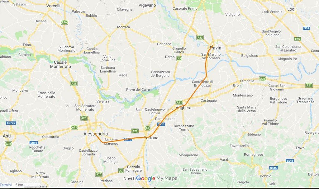 La tratta tra Piacenza e Pavia ha richiesto un ora e 14 minuti per una percorrenza di 63 km con fermate a S. Nicolò, Rottofreno, Sarmato, Castel San Giovanni, Arena Po, Stradella, Broni, Barbianello, Pinarolo Po, Bressana Argine, Bressana-Bottarone e Cava Marnara.