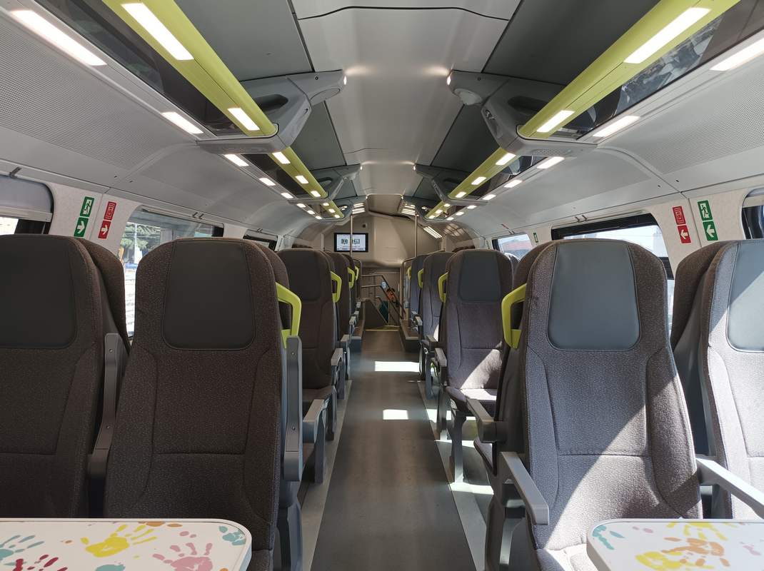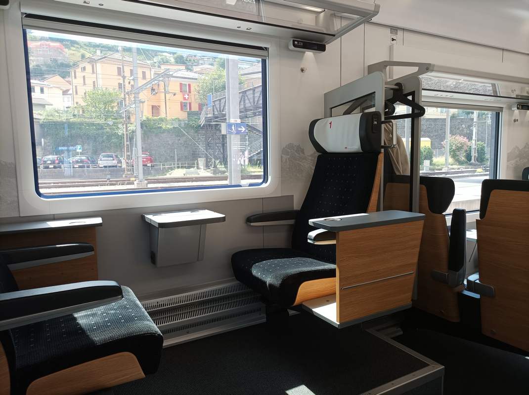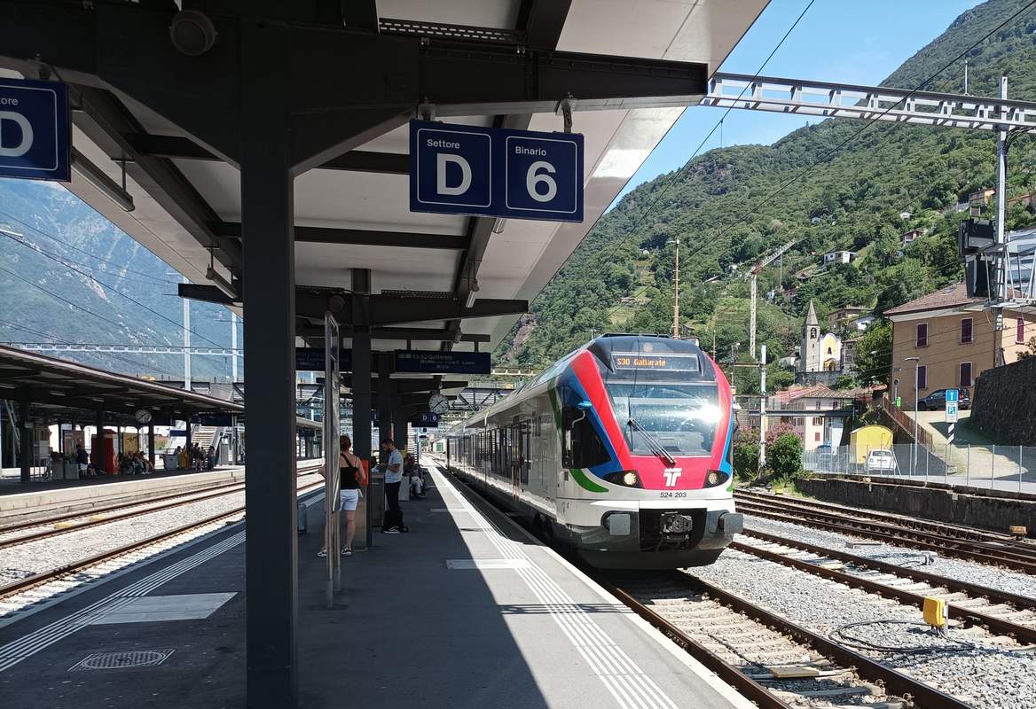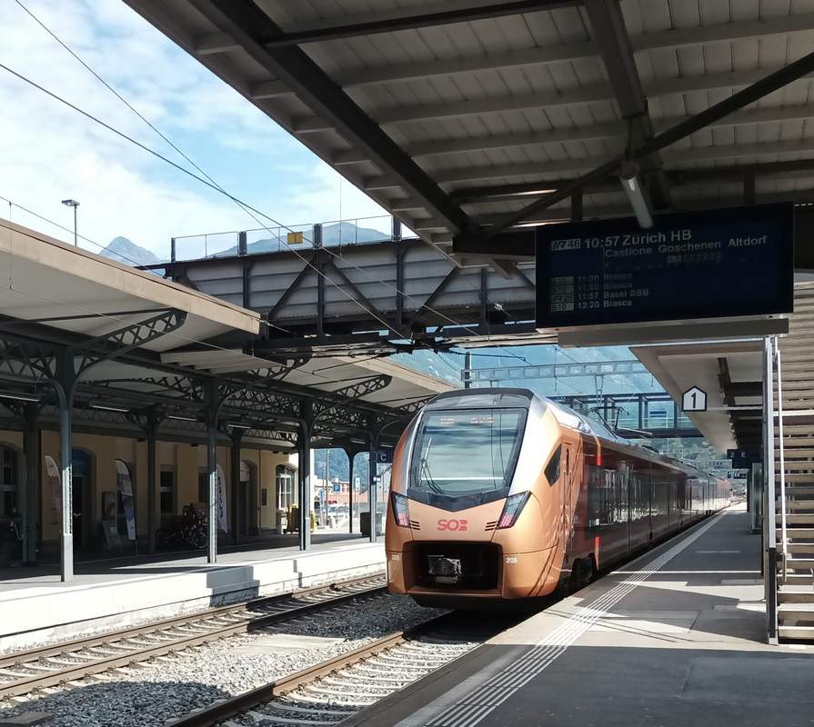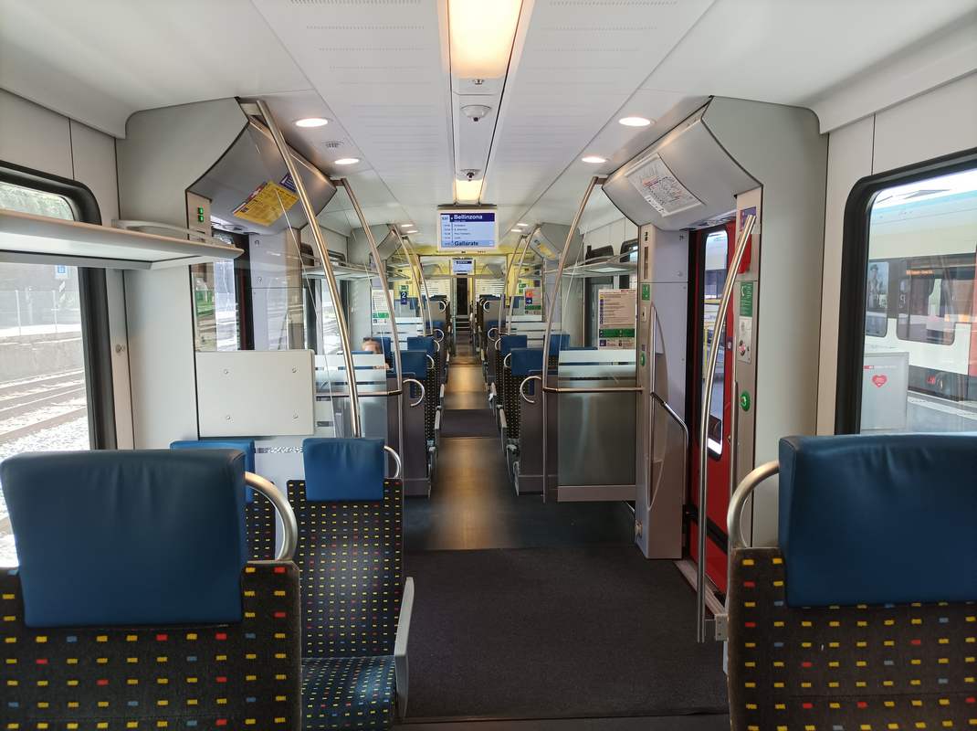 A Bellinzona attendo il treno InterRegio 26 per Locarno, espletato con un treno Stadler Flirt "Traverso", versione per la lunga percorrenza del treno Flirt 3. Il treno effettua servizio di prima e seconda classe, a bordo sono disponibili distributori automatici di snack e bevande, connessione wifi e prese elettriche ad ogni posto. Il treno è silenzioso e stabile, gli arredi funzionali e piacevoli, anche se si nota la derivazione da un treno nato per servizi regionali. Questi treni, dell'operatore svizzero SOB (Südostbahn), collegano Basilea e Zurigo con Locarno attraverso la linea storica del San Gottardo. Lo stesso operatore effettua diversi altri servizi a lunga percorrenza in tutta la Svizzera.