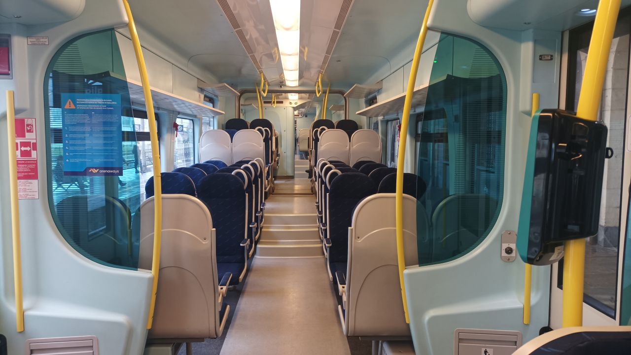 Il mezzo è l' ATR 220-037, che è pronto alla partenza al binario 1. Si tratta di un treno diesel costruito dalla polacca Pesa nel 2009, che dispone di due motori diesel MAN da 382 kW e trasmissione idraulica Voith. I mezzi sono abbastanza diffusi in Italia e prestano servizio per Trenitalia, Ferrovie Emilia Romagna, Ferrovie del Sud Est e sono stati anche in servizio con Ferrovie Nord Milano sulla linea Brescia-Edolo. Attualmente Arenaways dispone di tre ATR 220, tutti provenienti dalla ex-flotta di Ferrovie Emilia Romagna, che li ha dismessi per via della elettrificazione di numerose ferrovie su cui questi treni erano utilizzati. Esternamente il treno presenta una livrea caratterizzata da diversi toni di giallo, blu e verde, mentre internamente l'allestimento prevede 155 posti a sedere disposti in parte su moduli vis-a-vis da quattro posti oppure sedili a correre. L'accesso al treno avviene a raso, sono disponibili due servizi igienici e i sedili, così come lo spazio a bordo, garantiscono un sufficiente livello di confort. Il treno è climatizzato, non sono disponibili monitor informativi ne prese elettriche ai posti.