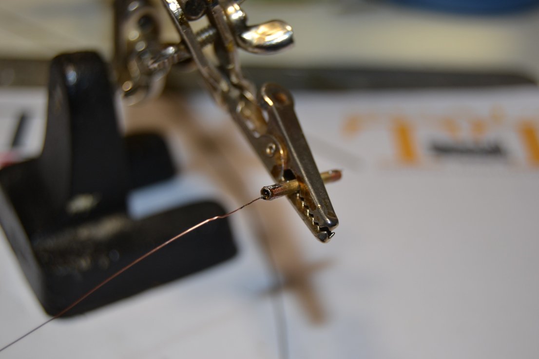 Dopo avergli praticato un foro da 0,5 mm al centro, vi ho fatto passare un filo di rame da 0,4 mm "prestagnato" (ovvero già ricoperto di stagno fuso) edf arrotolato da un lato.