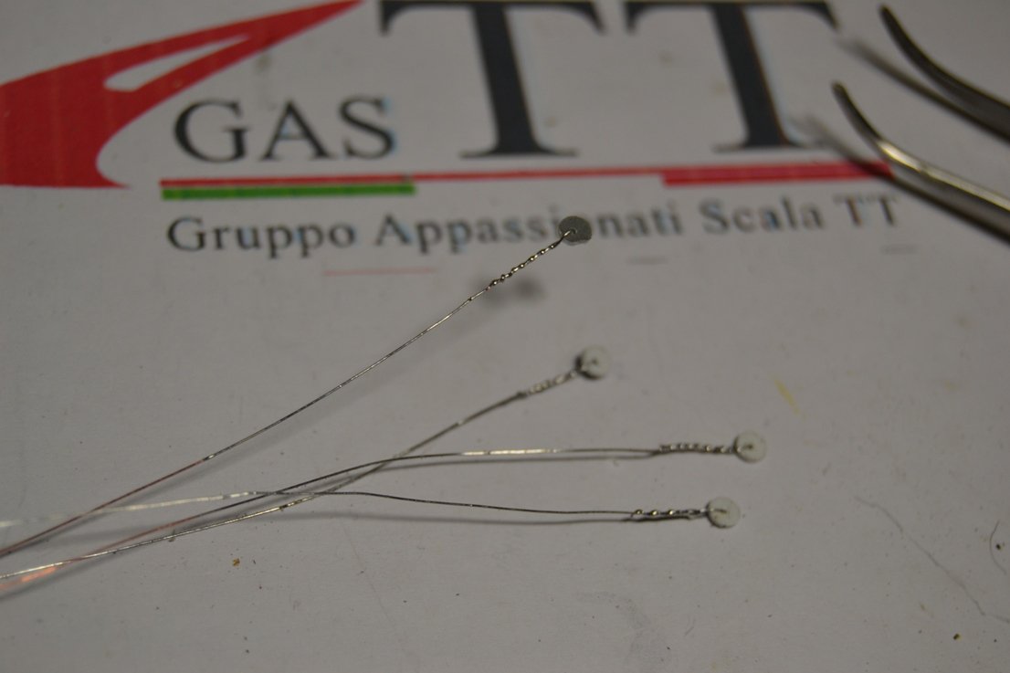 Quindi, oltre che ad avere costruito i pali (vedasi pagine precedenti), ho iniziato a saldare i fili della catenaria. Prevista come "Art. 444 Sommerfeldt" da scheda tecnica. Ma l'ormeggio non è previsto..... :wink: