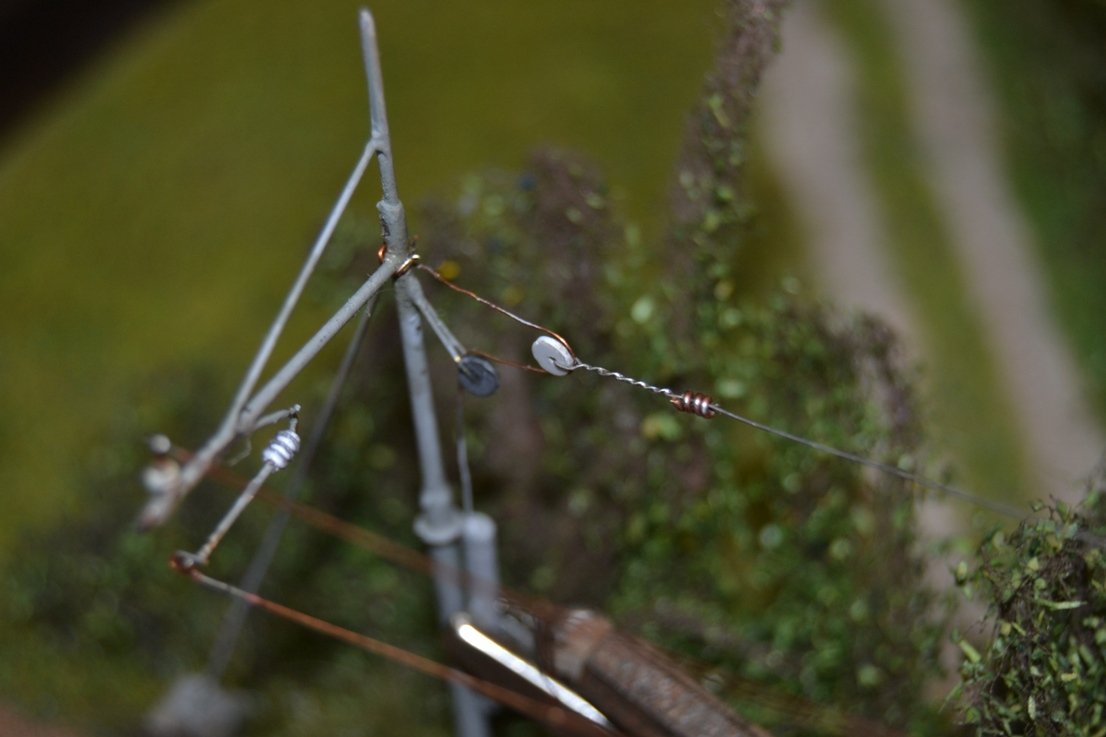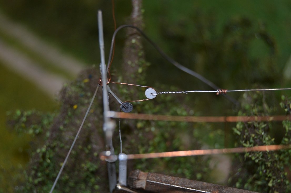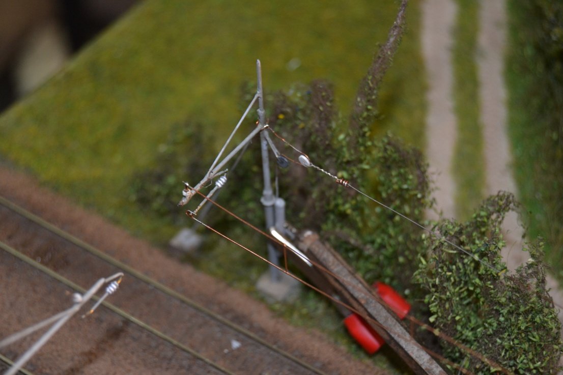 Ho usato i filini di rame in quanto hanno lo stesso diametro del filo da tensionare (in scala 1:120) e perché sono lavorabili con facilità (anche se estremamente delicati). Anche l'ultima parte del filo di contatto (quella che dal penultimo braccio va alle carrucole) sarà costruita con tali fili e tensionata realmente dal contrappeso....