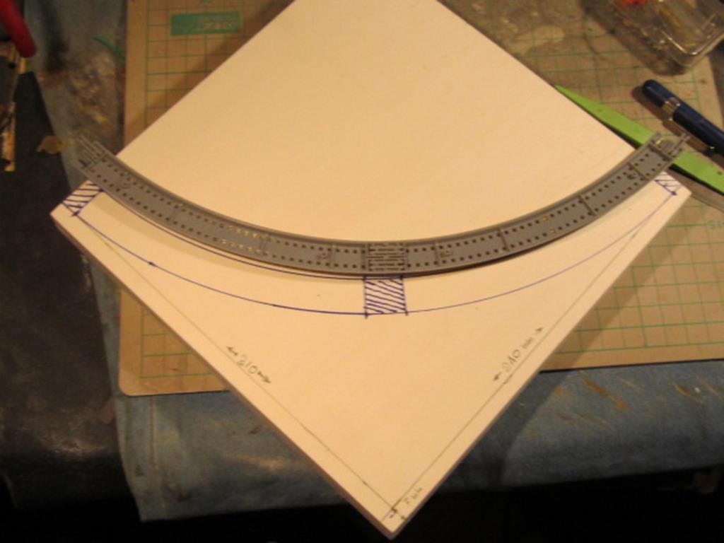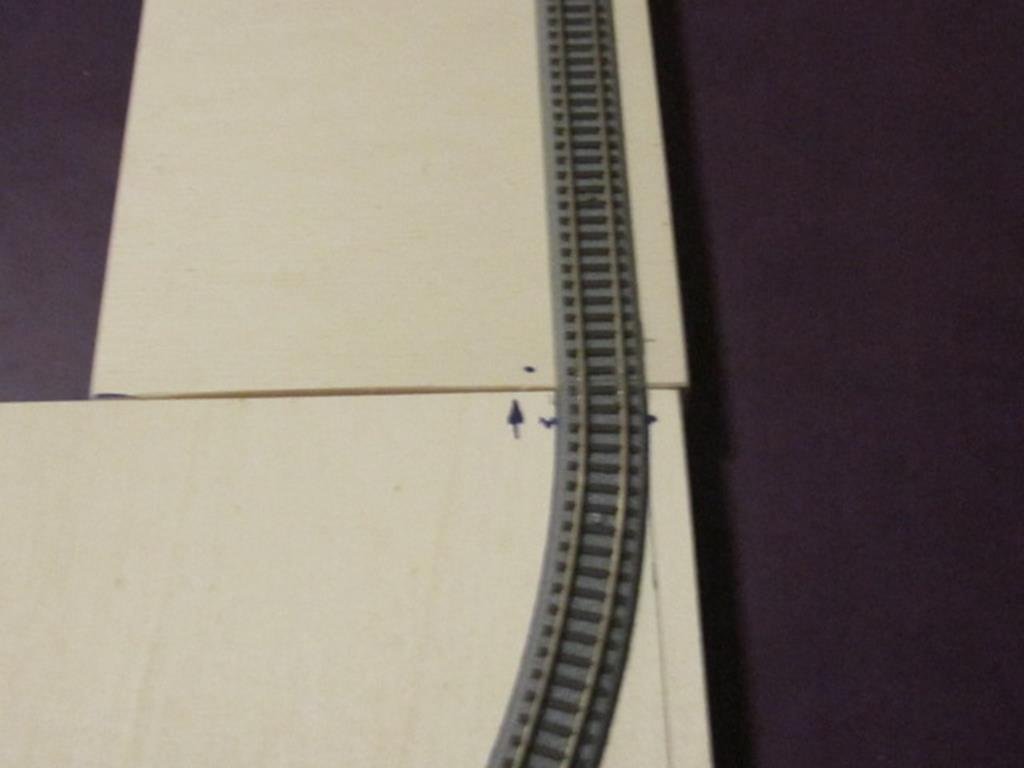 Dopo aver tracciato le linee a 7 mm dal bordo esterno ho posizionato i due binarvi curvi in modo che i due spigoli esterni della massicciata combaciassero sulla line e quindi tracciato la sagoma.