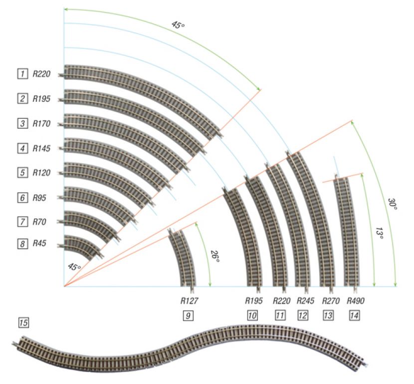 NOCH 97039 / 40 Rokuhan R039 - interruttore elettrico, sinistra/destra, R490mm, 13 °, 110mm + binario sezionato, dritto, 110mm, traversine di legno