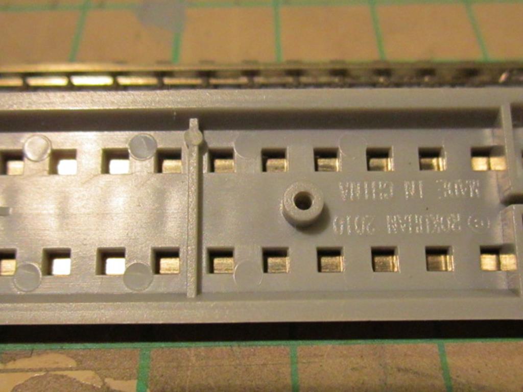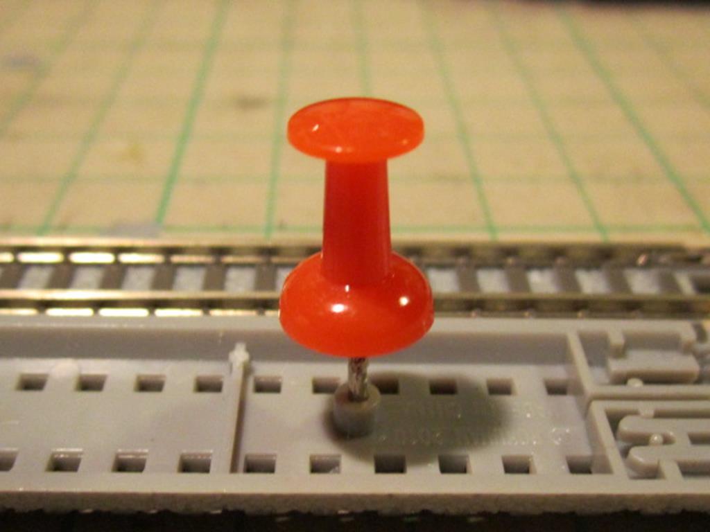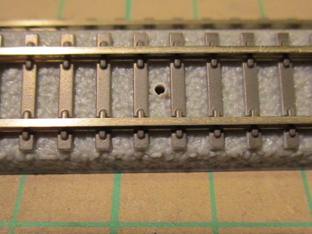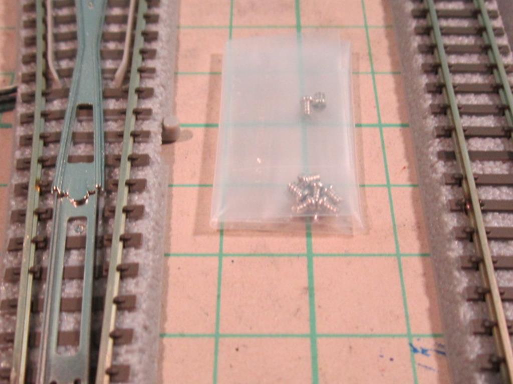 Nella parte inferiore sono presenti 2 cilindretti con la parte centrale cava per permettere l'inserimento di una punta da trapanino, ma grazie allo sottile spessore della massicciata basta una puntina da disegno con piolo per perforare il sottile strato in plastica. Una volta creato il foro potremo inserire la vite o il chiodino ( stranamente non ho trovato la referenza Rokuhan, appena riesco provo con chiodini in N o HO delle comuni case )