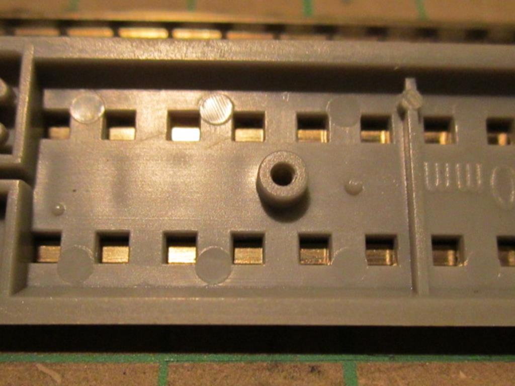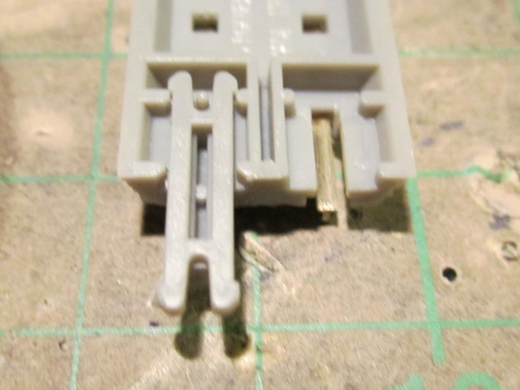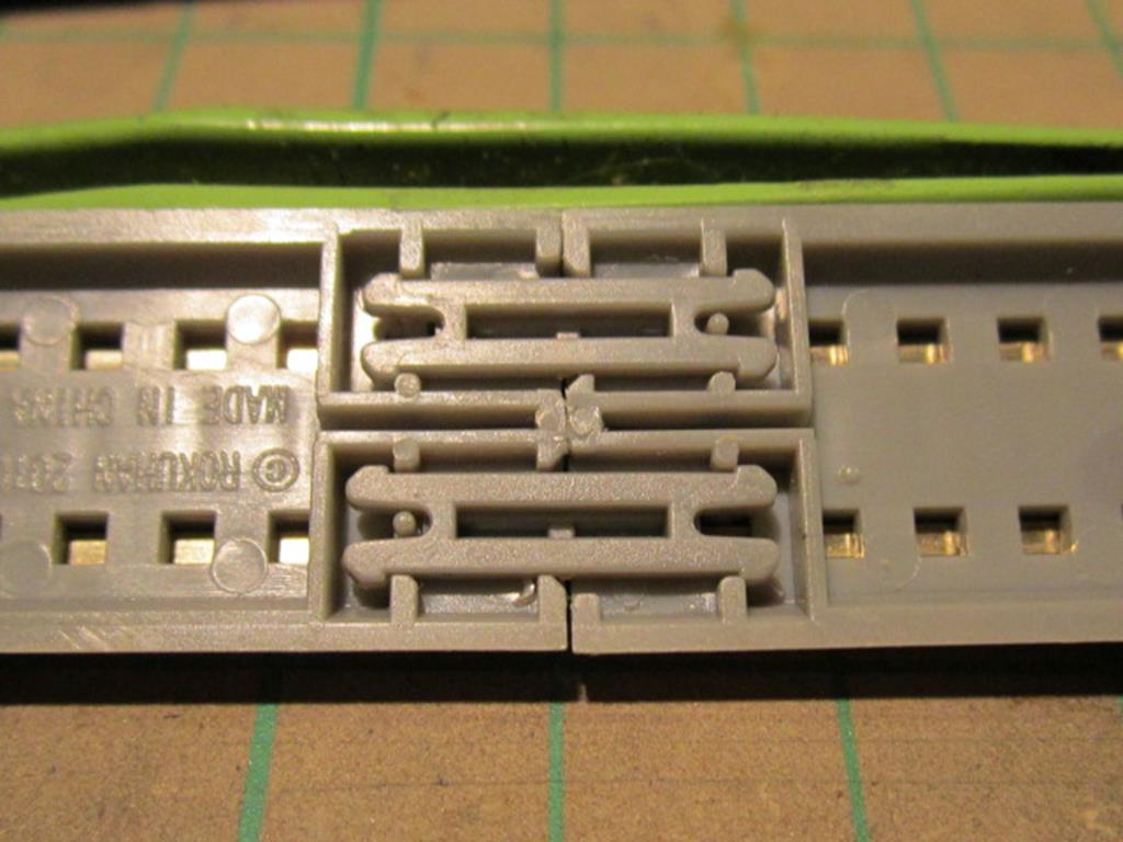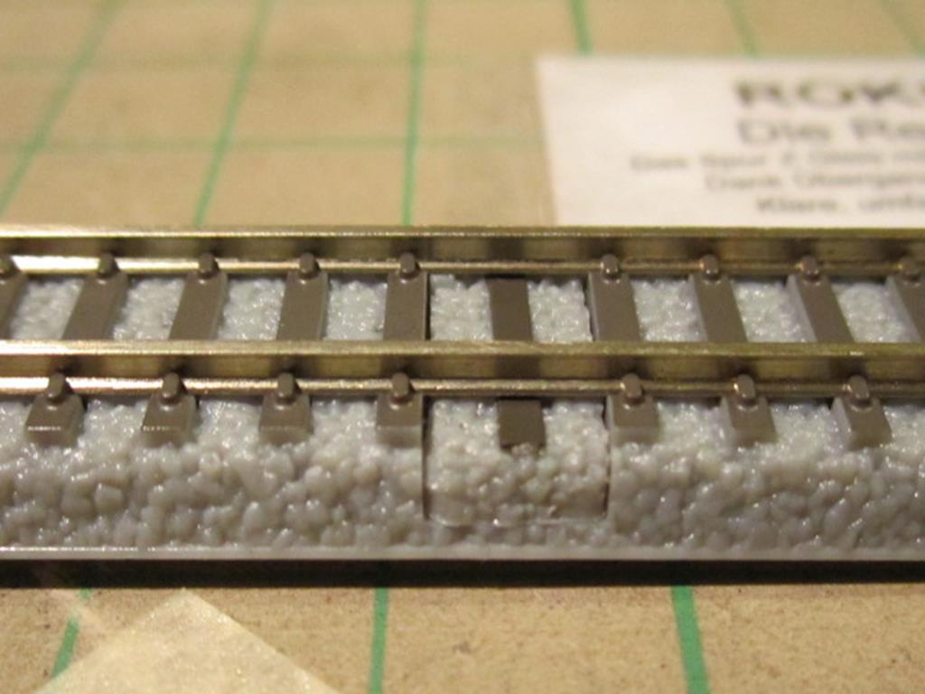 Nella parte inferiore sono presenti 2 cilindretti con la parte centrale cava per permettere l'inserimento di una punta da trapanino, ma grazie allo sottile spessore della massicciata basta una puntina da disegno con piolo per perforare il sottile strato in plastica. Una volta creato il foro potremo inserire la vite o il chiodino ( stranamente non ho trovato la referenza Rokuhan, appena riesco provo con chiodini in N o HO delle comuni case )