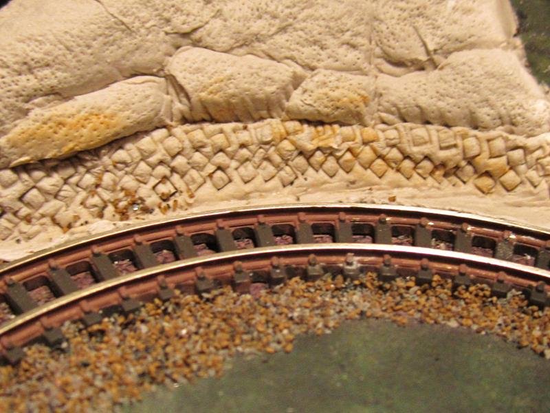 Steso alcuni colori di fondo è costruito la piccola porzione di collinetta utilizzando il solito DAS testurizzato in vario modo. Ho anche dovuto creare il rilievo a rombi dei tipici muraglioni di contenimento giapponesi. La trama di questi muraglioni varia moltissimo in base al posizionamento e scopo un particolare talmente tipico che non può mancare. Per fare questo motivo ho utilizzato un profilato in ottone a sezione quadra.
