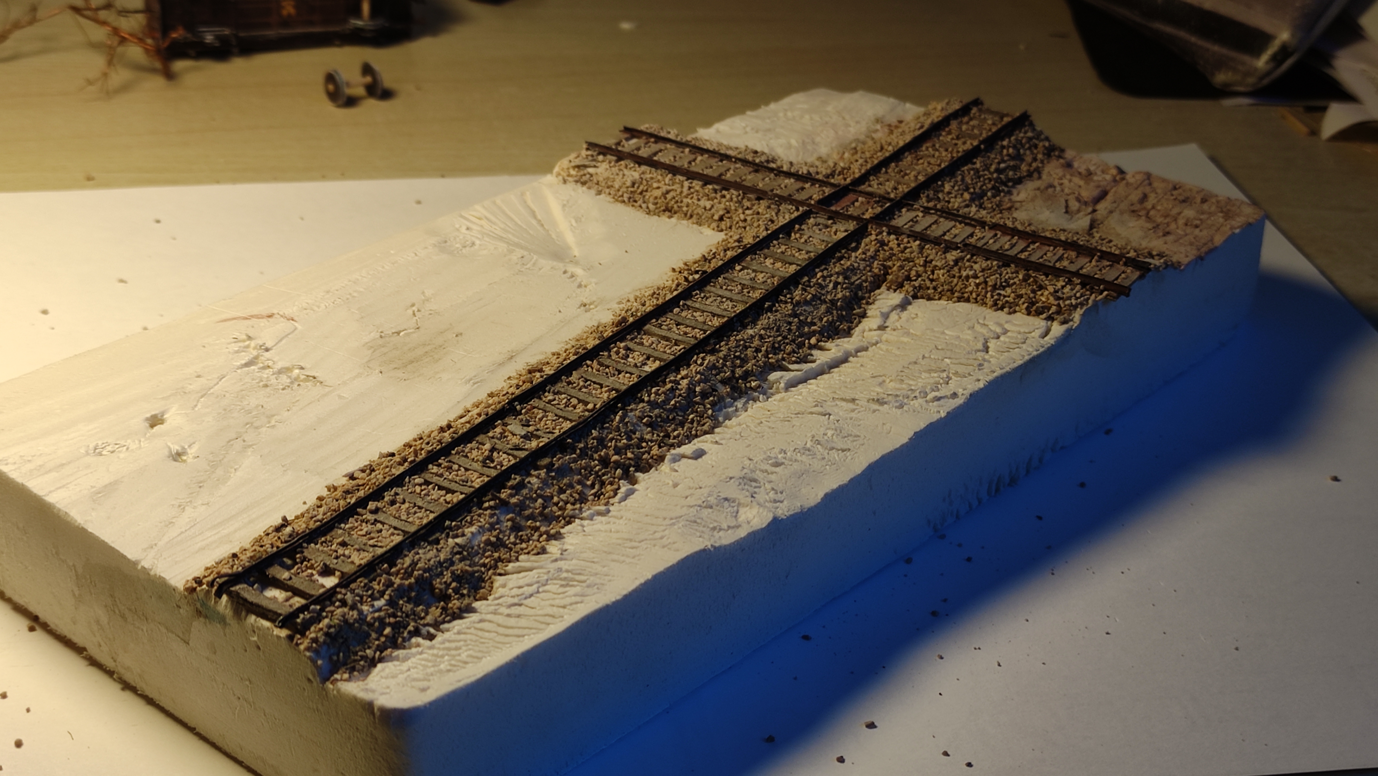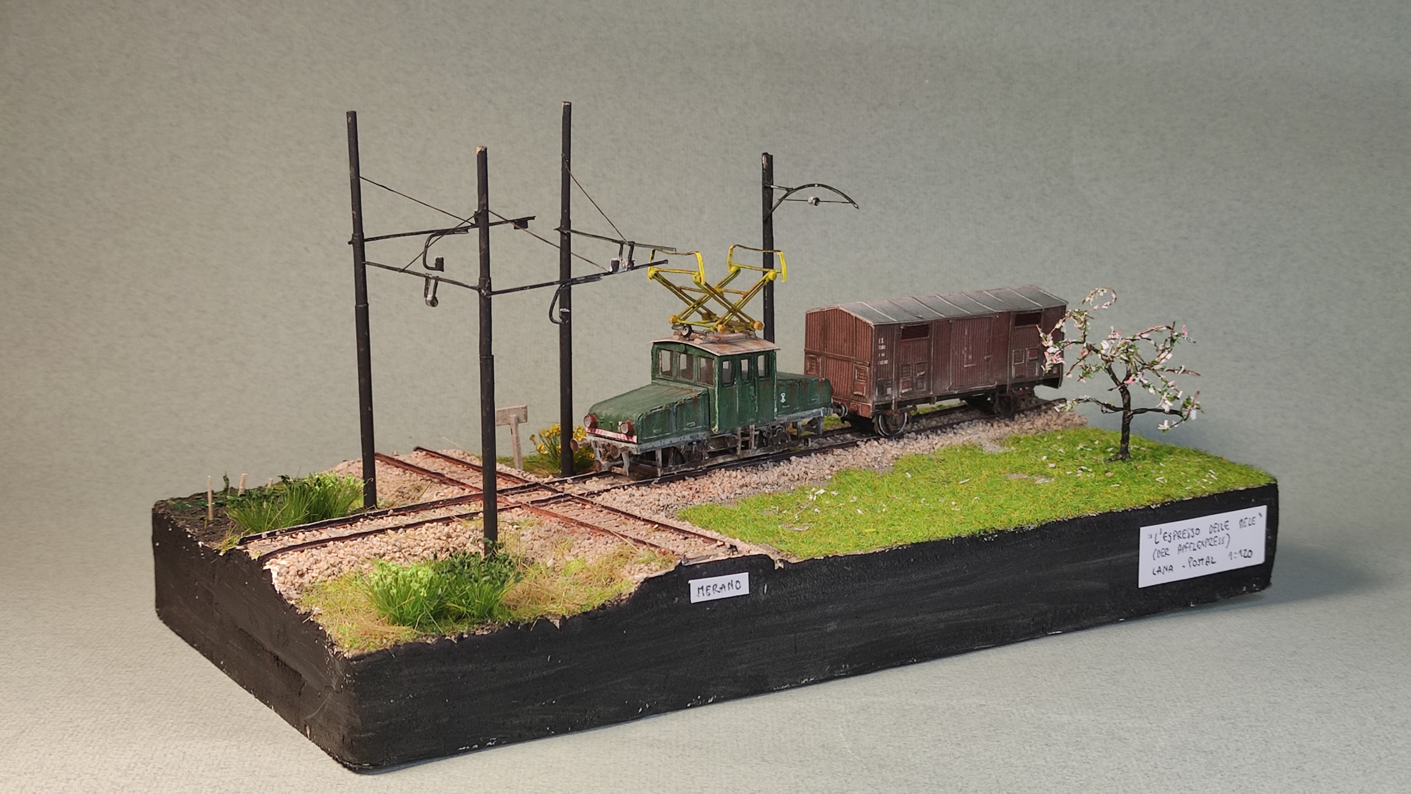 Il piccolo diorama è finito. Rimane il punto in sospeso della catenaria, che ho pensato di non riprodurre: i cavi sarebbero sottilissimi, in questa scala, e soprattutto è difficile replicarli in maniera convincente in modo che non stiano a penzoloni ai lati. Nel diorama del trenino delle Dolomiti avevo usato del filo da cucito, ma non ero rimasto soddisfatto.
