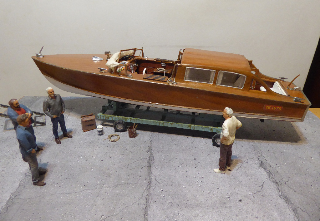 lo scorso anno aquistai un kit in un negozio di Venezia di modellismo specializzato in imbarcazioni tipiche veneziane , il proprietario Gilberto Penzo, oltre che modellista, è il massimo esperto in tal senso con una sua attività di ricerca e scritto numerosi volumi in oltre quarant'anni di attività e ha realizzato modelli di perfezione assoluta ! Il kit che mi ha venduto di questo taxi degli anni 60, era composto da due sole tavole in compensato pretagliato al laser, per cui mi sono impegnato tantissimo nel montaggio per realizzarlo al meglio, ma alla fine pensato per ambientarlo in una scena di cantiere, non accontentandomi del solo modello come generalmente tutti fanno, inoltre avevo reperito dei files 3D da stampare con la mia stampante , di figurini ben dettagliati che si sono rivelati perfetti nelle pose e che una volta ridotti in scala, li ho dipinti pazientemente, creando così in dialogo chiacchericcio tra loro ; avevo fatto anche ricerche sui tipici taxi veneziani, ormai non è rimasto molto come documentazione fotografica, mentre quelli attuali moderrni sono totalmente diversi e molto più eleganti ; Venezia è l'unica città al mondo servita da taxi marini, il traffico di ogni giorno di questi motoscafi è senza sosta e servono principalmente a fine turistico in particolare per gli hotel e la spola verso l'aeroporto di Tessera .