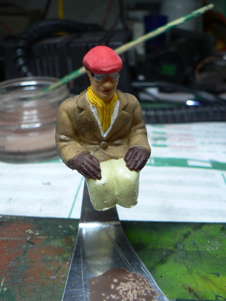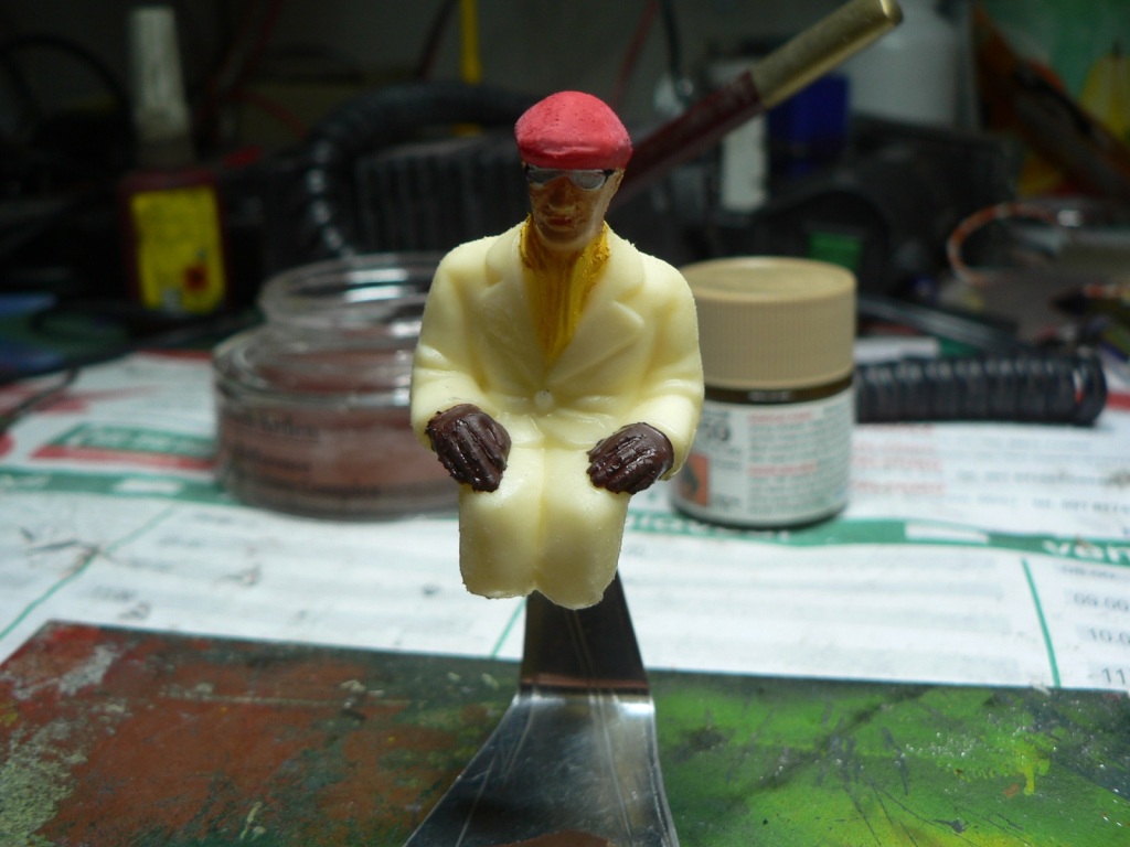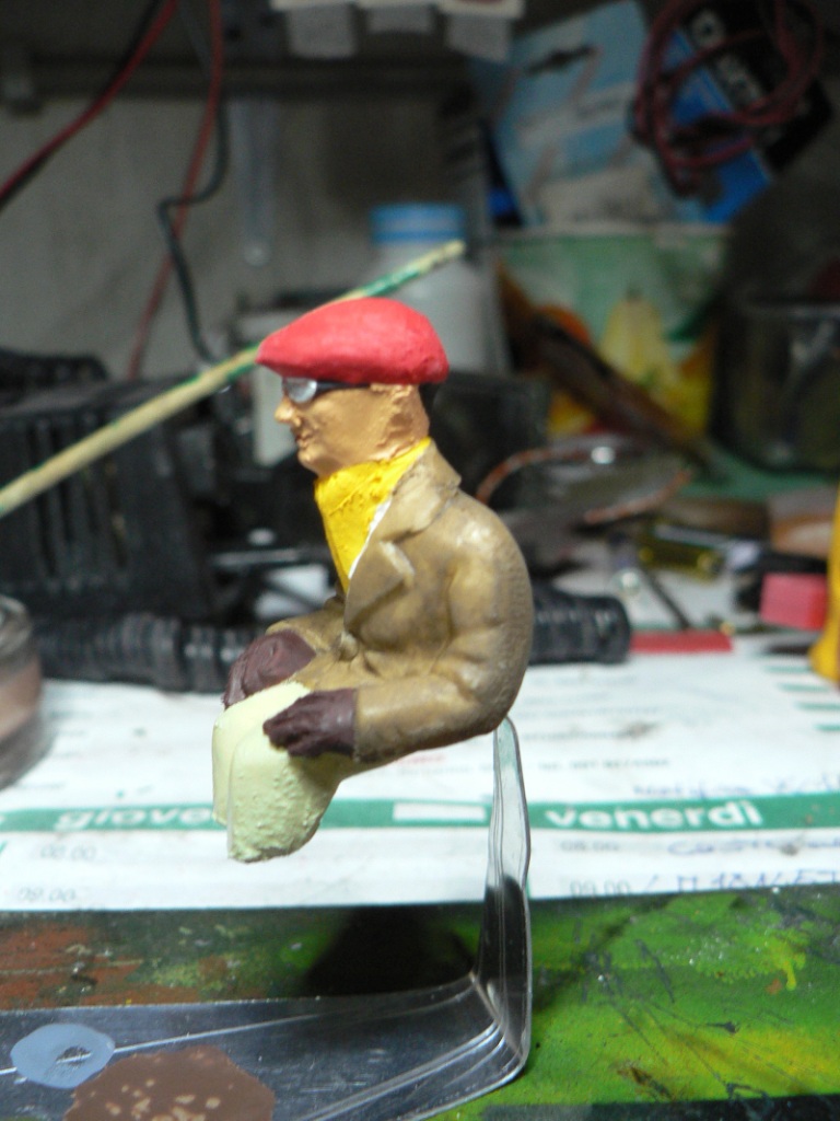Dopo diversi passaggi, posso completare l’abbigliamento del pilota… chissà che freddo doveva fare alla guida di queste auto, senza il cappotto!