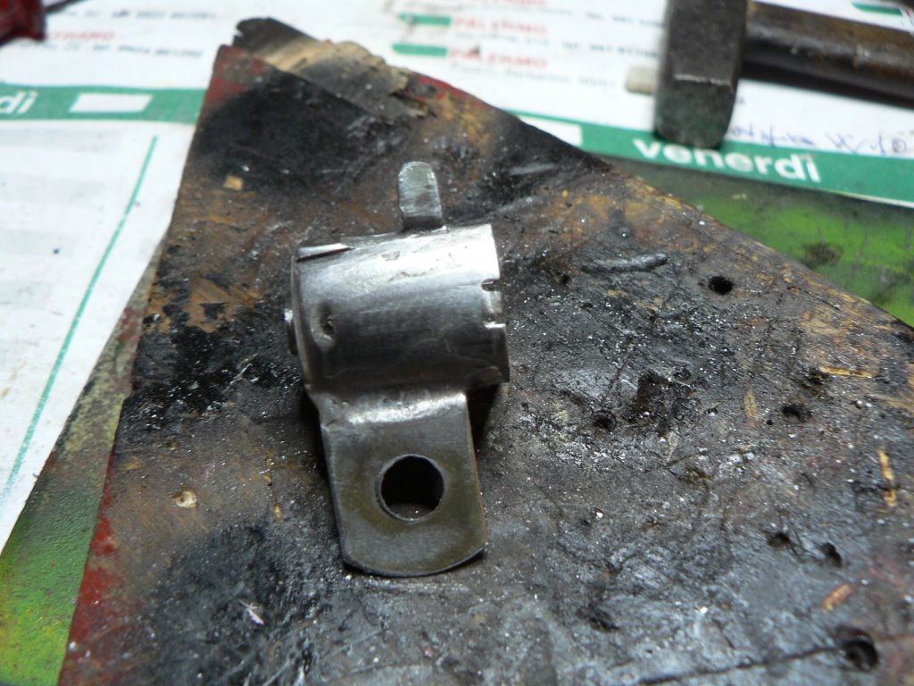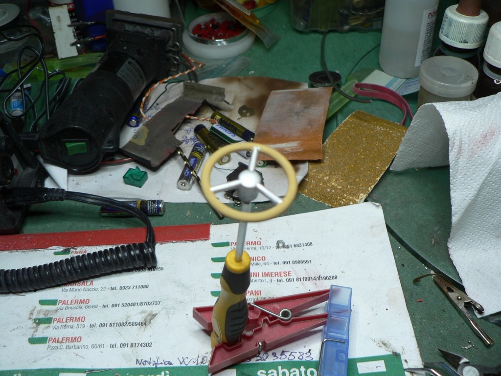 Recuperato un motore elettrico che avevo conservato da una ventina d'anni e sagomato un cavallotto metallico per tubo plastico, eseguo la seguente lavorazione.