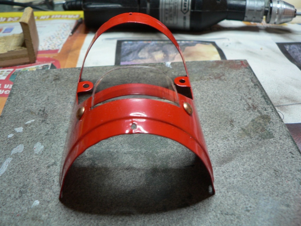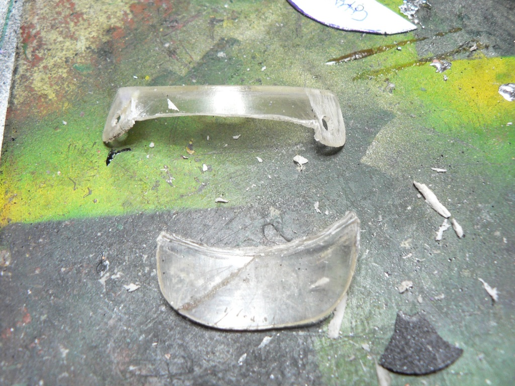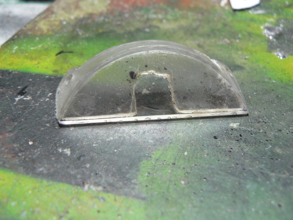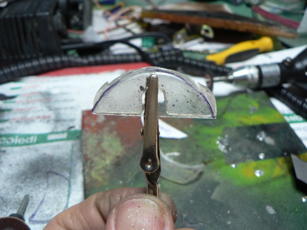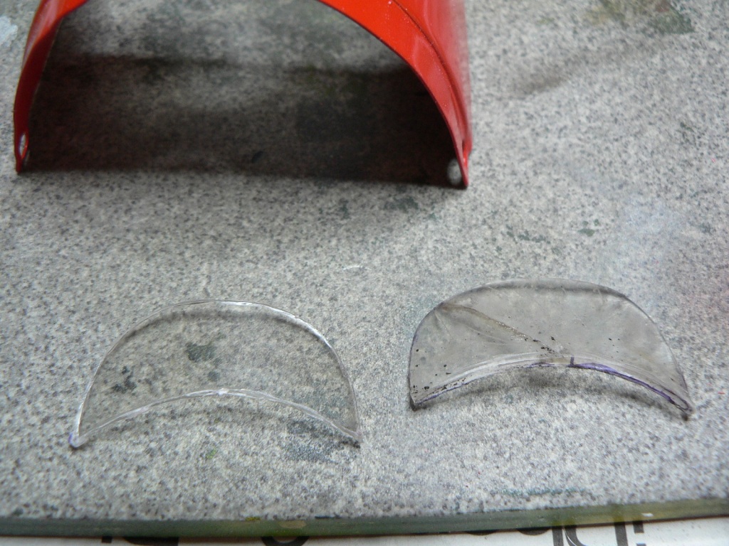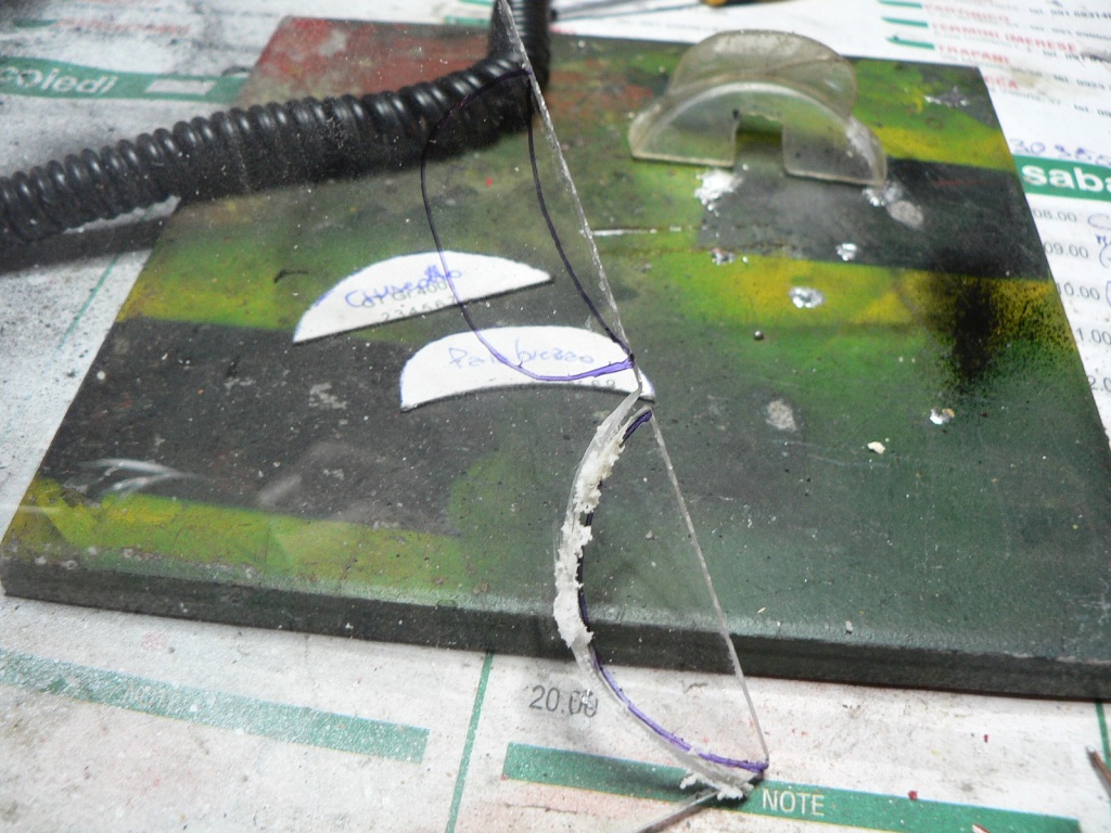 Nella serie di foto precedenti, dopo aver costruito delle sagome in cartoncino, aver “scucito” il parabrezza dal cruscotto originariamente costituito da un unico pezzo trasparente ed inserito un nuovo elemento di policarbonato sul supporto originale tagliato; occorre sagomare alla perfezione il parabrezza con la sua particolare forma.