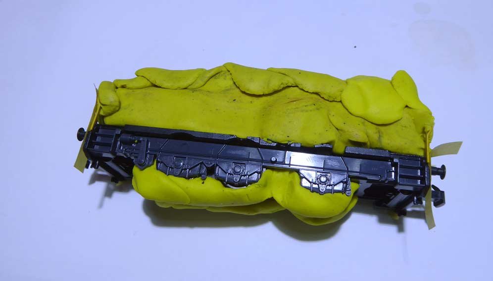 ad aerografo anche le ruote e le parti meccaniche poichè facilmente si infiltrerebbe subito ; pensai a questo metodo molto tempo fa, proprio per le parti difficili o impossibili da mascherare mediante l'uso del nastro adesivo ; l'esperienza si è dimostrata validissima e priva di cointroindicazioni , l'importante è che non si presenti troppo molle per non lasciare residui alla fine, meglio tenerne un po in frigorifero per mezzoretta prima dell'uso, forse le ruote che sono il punto più delicato, conviene sgrassarle e pulirle per toglire le eventuale tracce di unto che la plastilina potrebbe riasciare.