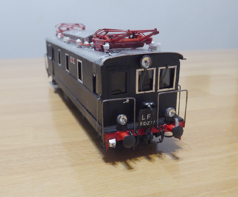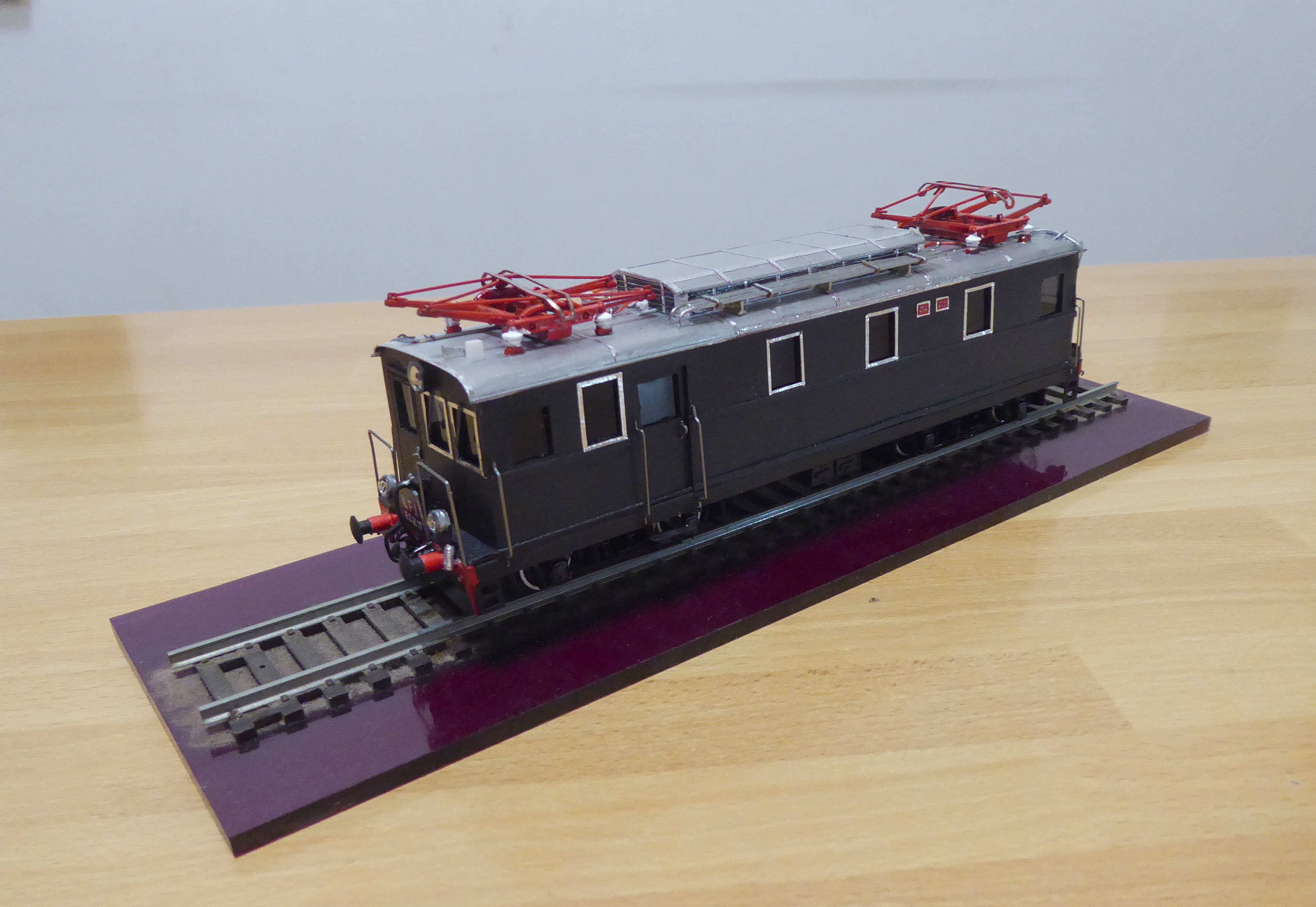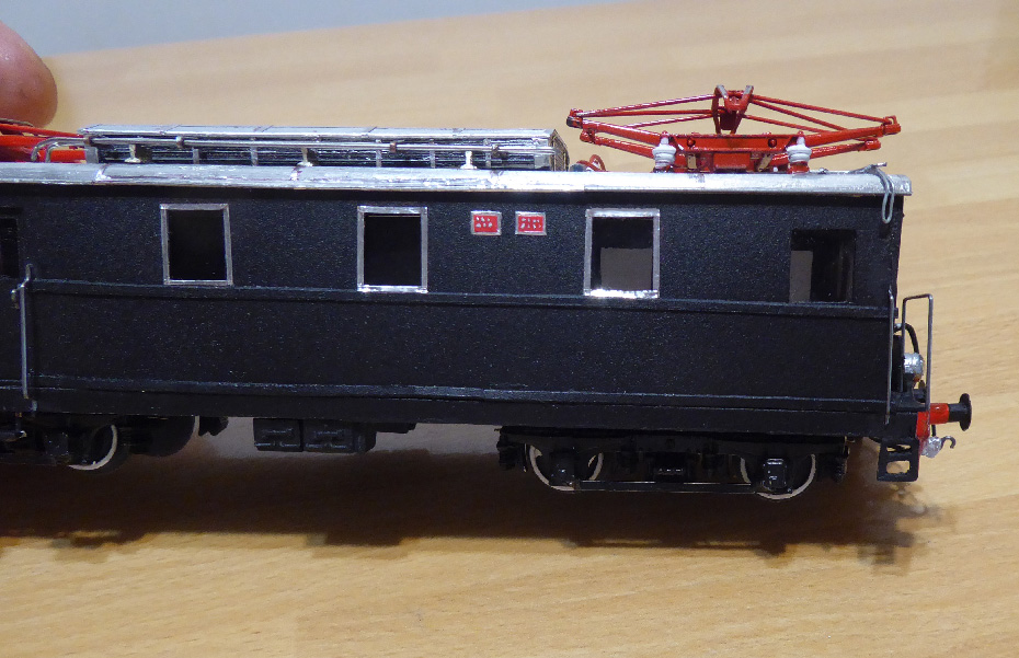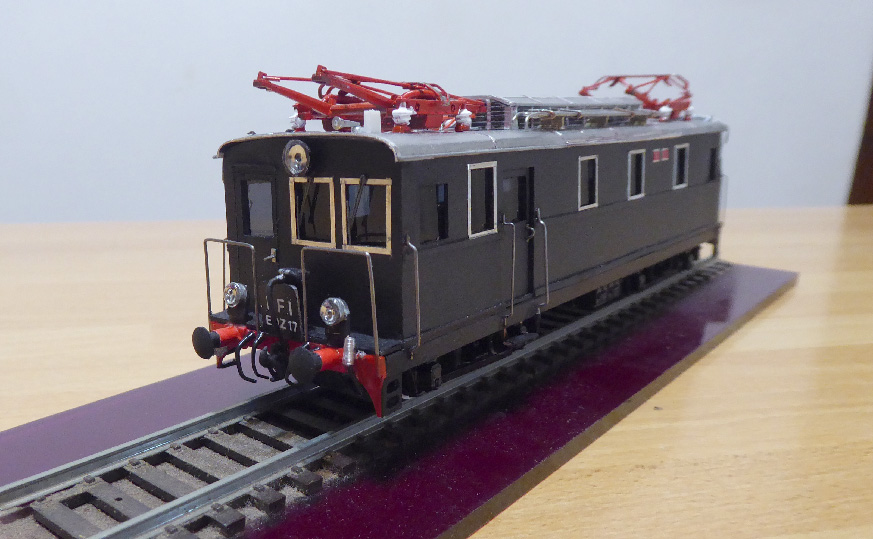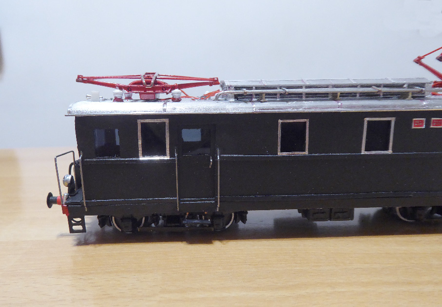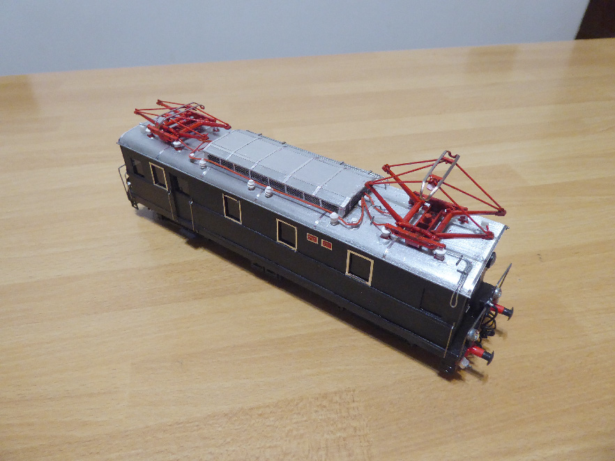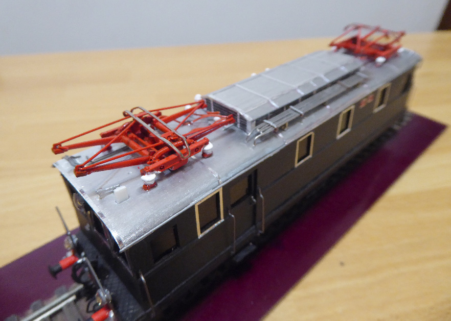 Il metodo del nastro di alluminio mi ha permesso di simulare le varie giunture sul tetto e sul reostato, questo poi ho preferito lasciarlo in metallo naturale non verniciato, come rotabile appena uscito da officina, l'effetto lo ritengo personalmente valido, del resto la foto nella rivista, anche se in B.N, lo dimostra sufficientemente a nuovo . Per i pantografi ho utilizzato quelli che avevo di una vecchia E 444 lima, una volta aerografati , si sono rivelati inaspettatamente molto buoni, mentre alcuni isolatori li ho creati al tornio in ottone ; da notare che da un lato ho creato la serpentina presso il reostato con filo di acciaio ripiegato a misura di piatto ; il tetto ho dovuto curvarlo con quanta più attenzione possibile ; in verità non l'ho ancora fissato poichè devo fare un rinforzo interno, comunque si adagia bene . Ho realizzato i tergicristalli sulle cabine di guida, i REC maschio e femmina in alluminio ; le ruote sono di diametro adeguato , infatti l'altezza complessiva dal piano ferro al tetto, secondo i disegni, è corretta .