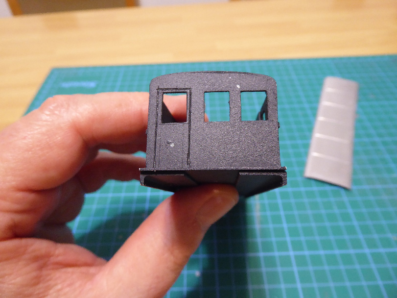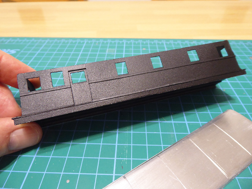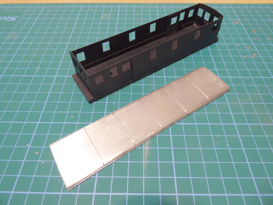 Osservando i disegni, , troviamo che i finestrini non rispettavano tutti la medesima altezza quelli del lato cabina macchinista erano leggermente più basse e prive di cornici ; a proposito qui , si presentava il problema di come appunto eseguirle che sono in rapporto scala meno 0,2 mm di largezza !!! pochè le fotoincisioni non fanno parte delle mie tecniche, l'unica soluzione che trovai fu di realizzarle tramite nastro adesivo in alluminio per idraulica, utilissimo tra l'altro per eliminare micro fessure e risolvere vari fastidiosi inconvenienti , un metodo che consiglio caldamente..ma... ritagliare finissime striscioline di tale larghezza , ha richesto pazienza e precisione estrema ! [105] Ho iniziato ritagliando le fiancate , assicurandole nel'assembalaggio , su di una piastrina in acciaio da 1 mm di spessore , che ha conferito anche un discreto peso finale al modello oltre alla eccellente tenuta dell'insieme visto questo spessore, forando poi le sedi per i carrelli, questi, provenienti dalle Corbellini Hachette, che si sono rivelati quasi uguali, con una piccola modifica, averli rifatti in alluminio come al mio solito, sarebbe stato parecchio complicato .