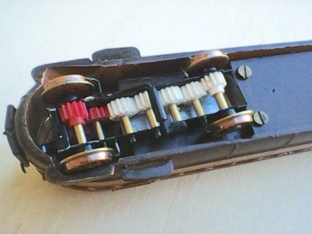 Trasmissione e carrelli sono realizzati ex-novo, con il solito doppio giunto omocinetico. Avevo pochi ingranaggi e ne ho clonato qualcuno. Le ruote le ho realizzate, sfruttando dei cerchioni surplus che avevo tornito tempo fa. Sono un po’ più piccole del dovuto (9,5 mm e non 10,5) con bordini da 0,8 mm, non hanno trattamento superficiale, ma presentano otto fori sulla vela e sono strette al limite, 19 mm tra i bordi dei cerchioni, con superfice di rotolamento dell’ordine di 1,5-1,7 mm.