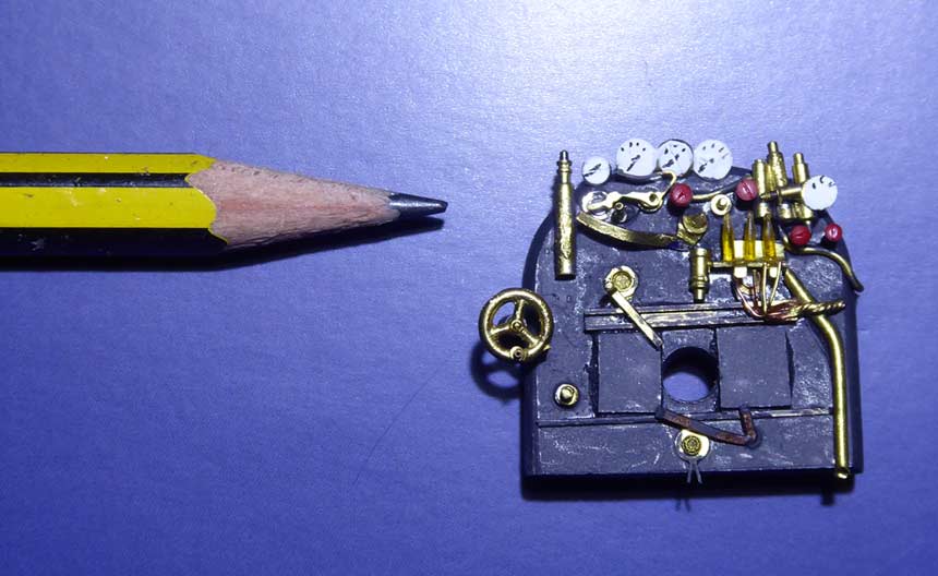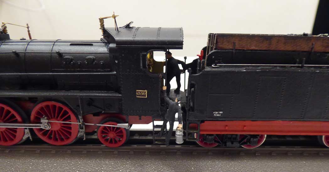 Avrete visto anche che ho realizzato anche il piccolo portellino di aereazione sul tetto cabina, nel modello era chiuso, ho forato la sede e riportato ; volendo avrei potuto anche illuminarla internamente, forse lo farò . Come mia prassi, ho modificato anche le pose dei figurini, sempre con tornitura, ho realizzato il bottiglione del petrolio che sta nella mano del