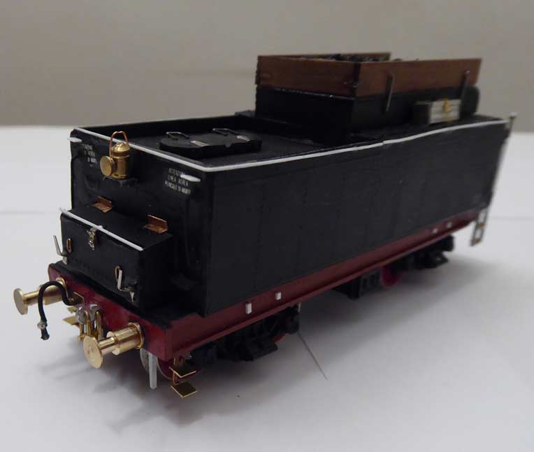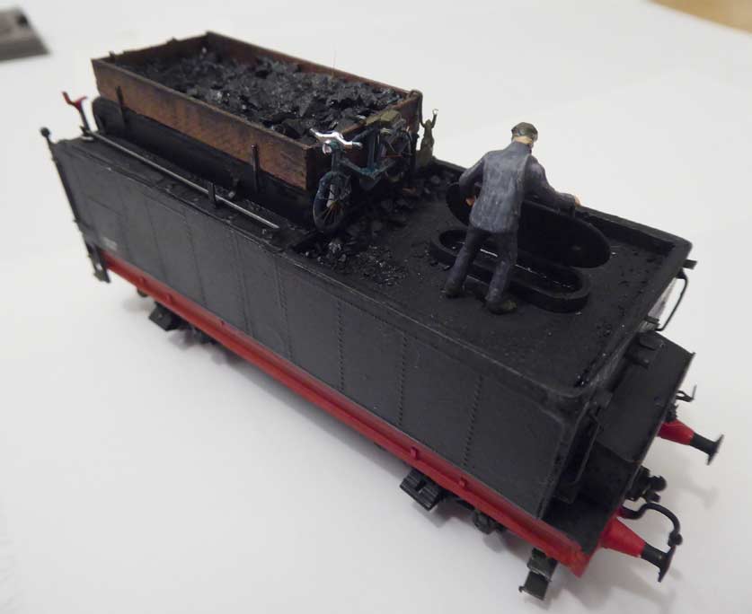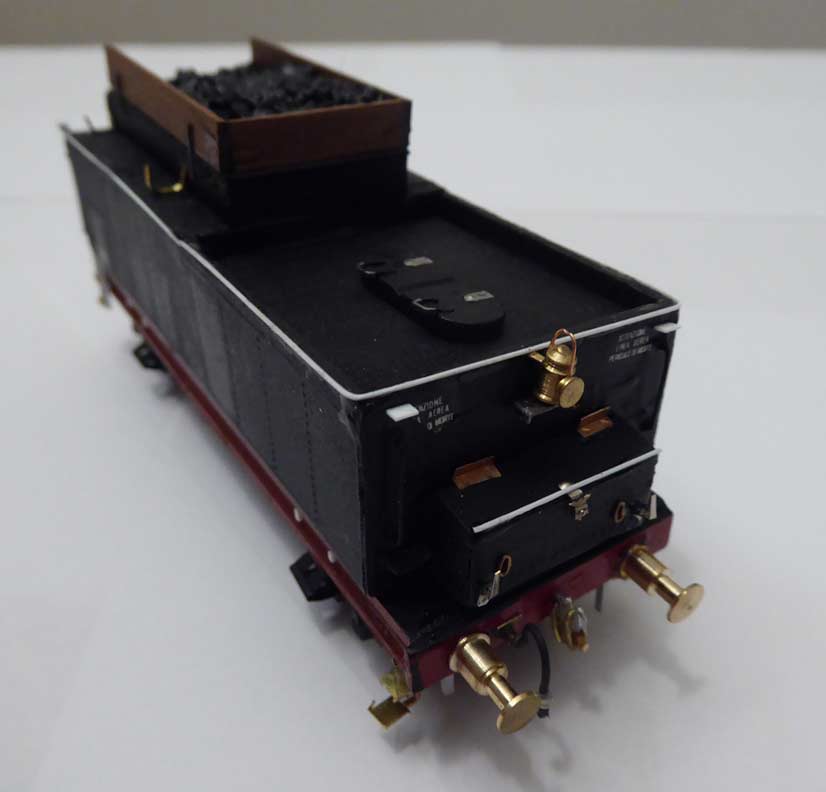 fuochsta. Il tender è la seconda laboriosa fase che mi ha occupato per un po ; le ruote innanzitutto, erano errate in quanto con numero esagerato di razze, ho sostituito gli assi con un tipo corretto , sempre di Rivarossi ; dopo averlo caricato di carbone e rifatta integralmente la botola per l'acqua, ho aggiuto le paratie di rialzo in cui vi è appesa anche una bicicletta, rielaborata anch'essa con l'aggiuta dei raggi sulle ruote !!..(microscopici fili di ottone )..Talvolta infatti anche una bicicletta del macchinista o fuchista, poteva essere sistemata in tal modo, per vari motivi . E' l'unico modello che possiedo in questa scala e che ho rielaborato e che sinceramente, abituato all' H0 puro come sono abituato , non consideravo molto, sebbene io abbia grandissima stima per quanto la Rivarossi abbia prodotto e che mi ha permesso di apprezzarla ulteriormente, nonchè di imparare molte altre cose in caso di altre rielaborazioni .