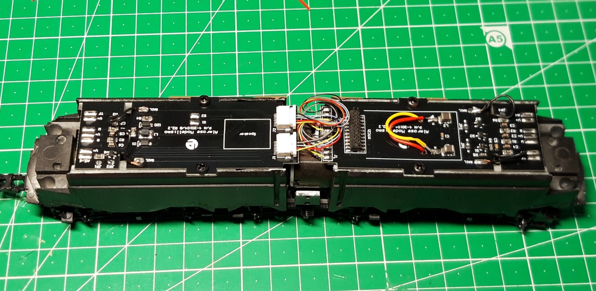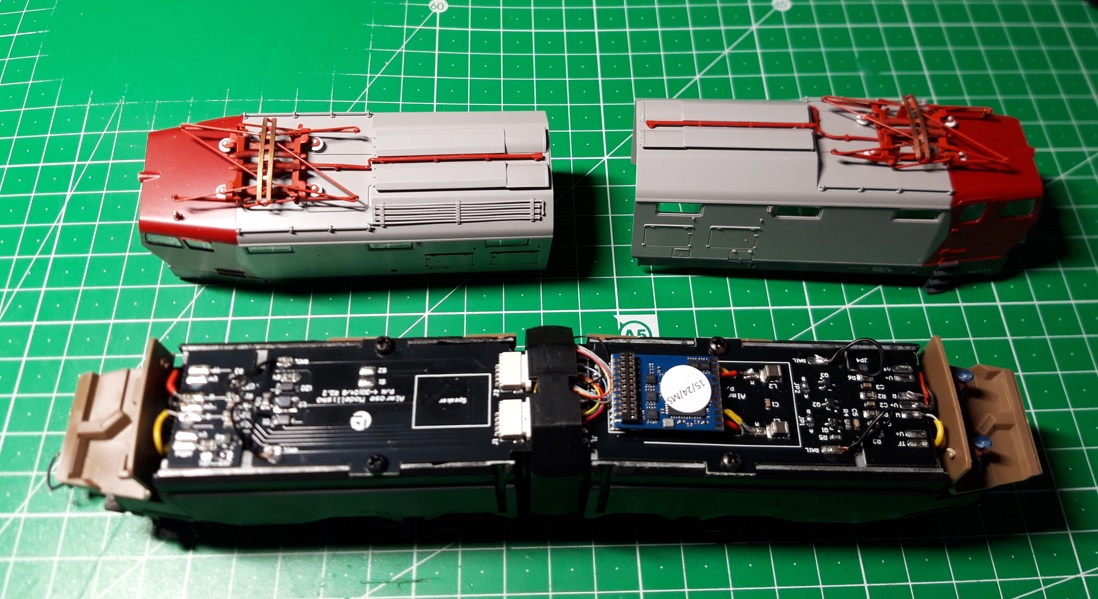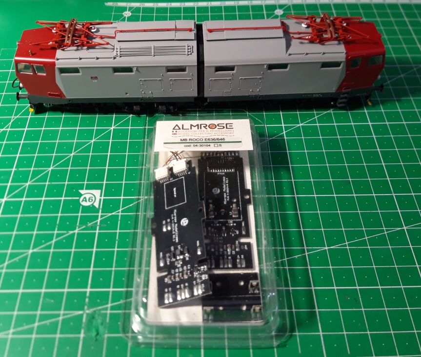 Come nuovo PCB ho scelto quello specifico proposto da Almrose (art.04-30104) per tutte le E636/E645/E646 di Roco, dotato di interfaccia Nem per decoder a 21 pin, powerpack e alloggiamento per il diffusore per gli effetti sonori. Come decoder userò un Esu Lokpilot 5 21MTC codice 59629.