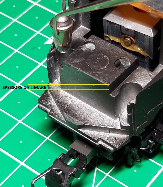 Sotto alla cabina, in alcuni modelli, è presente uno spessore di plastica di 1 mm che andrà tolto; in questo modello lo spessore è assente e quindi bisognerà limare di 1 mm circa il telaio, secondo le istruzioni presenti, altrimenti non sarà possibile riposizionare correttamente i respingenti.