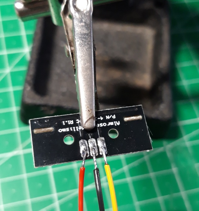 Si saldano tre corti spezzoni di filo elettrico ai contatti presenti su ognuna delle basette (molto utile la terza mano per i lavori di saldatura a pezzi di dimensioni così ridotte).