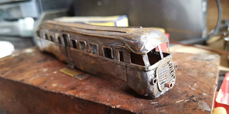 Ora manca Il tubo di scappamento sull' imperiale insieme con gli areatori, le luci di coda in alto sui frontali, l'impianto elettrico con le luci frontali e una completa pomiciatura, stuccatura, e verniciatura con i colori castano ed isabella.