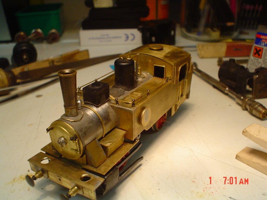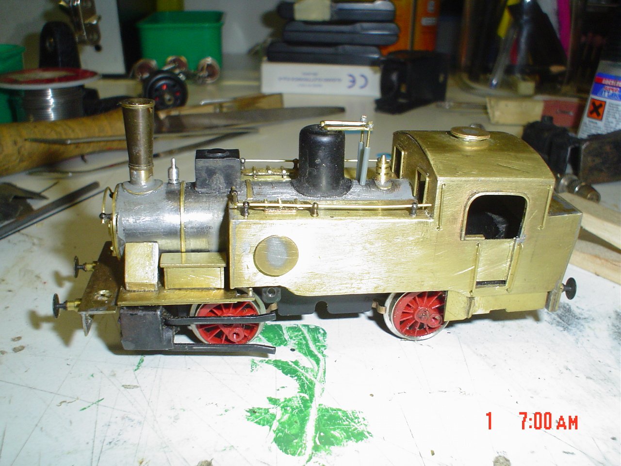La caldaia ricavata da un cilindro in ottone con un tappo frontale sagomato e brasato, il comignolo ricavato da vecchi pezzi di una Gr 835 saldato su un piccolo tubicino d'ottone ed una rondella alla caldaia stessa. Per la cabina e le casse d'acqua optai per due pezzi laterali uguali saldati al tetto, coperture posteriore ed anteriore finestrate. Il pancone posteriore è un rettangolino di lamiera forata per accogliere il gancio e i due respingenti saldato nella parte bassa della cabina stessa. Anche il lavoro di bombatura dello sportello anteriore della caldaia mi impegnò, dovetti trovare due tubi di diverso diametro che si innestassero uno dentro l'altro per costruire un punzone per piegare e bombare la lamiera del coperchio stesso
