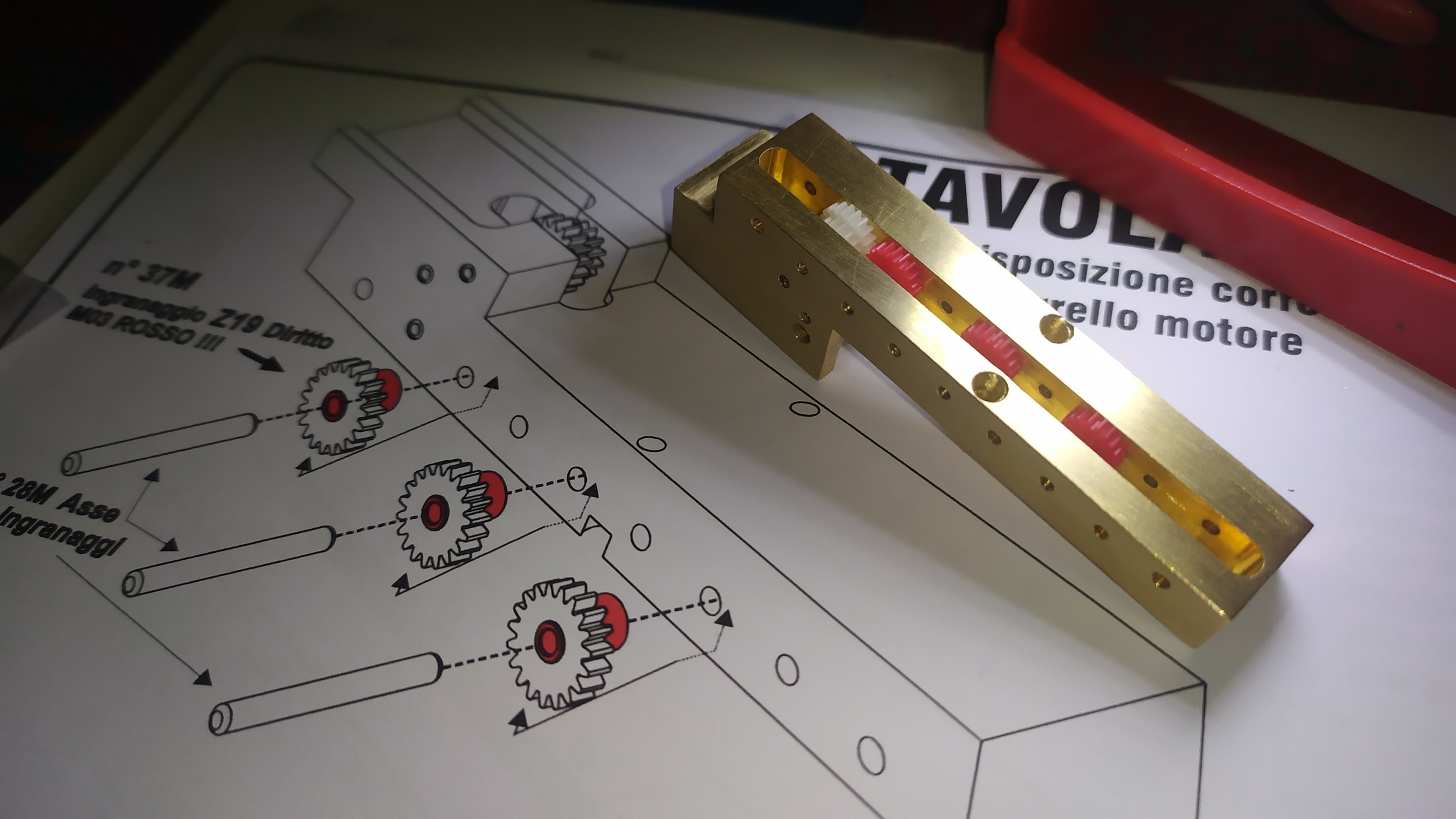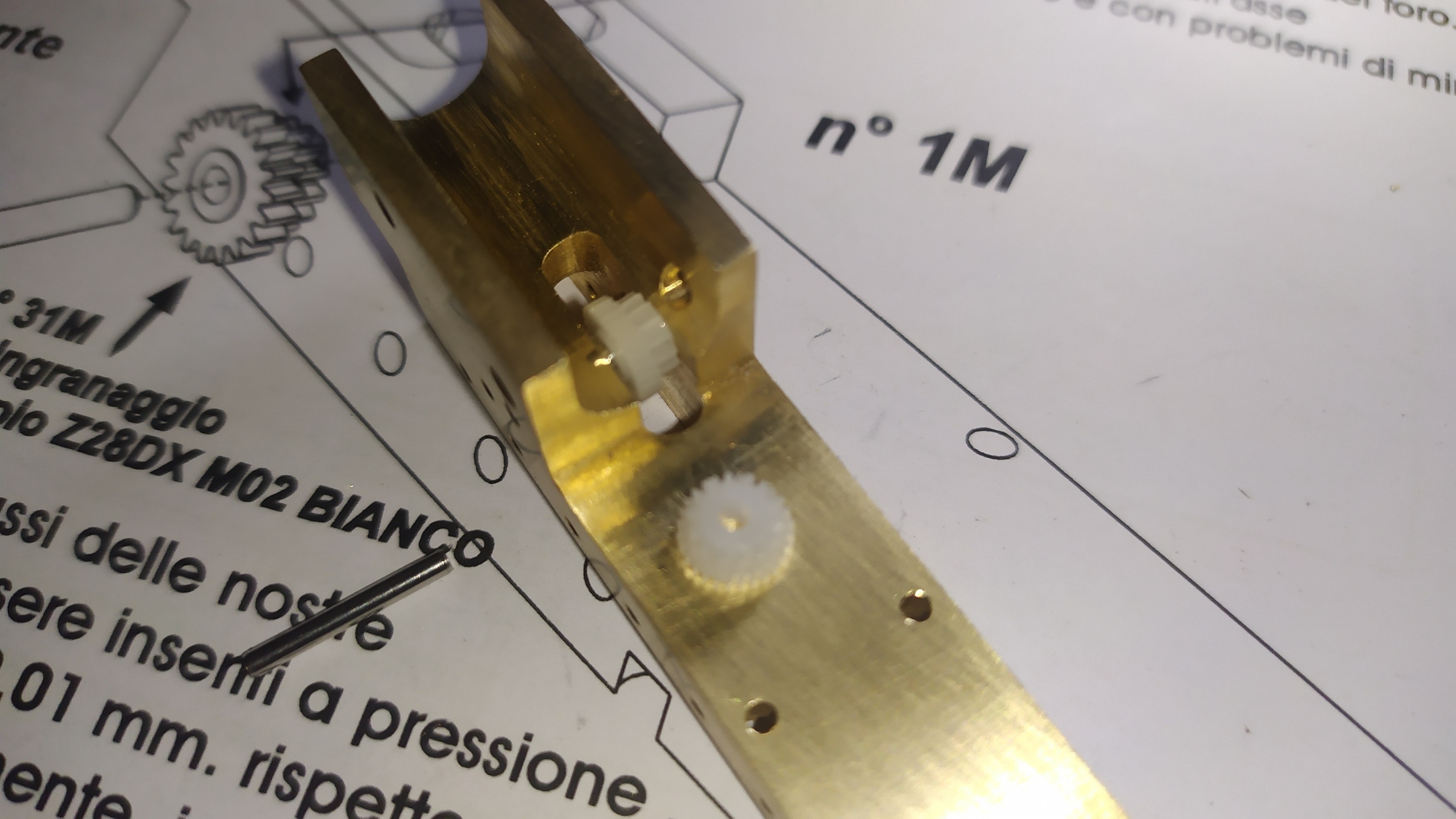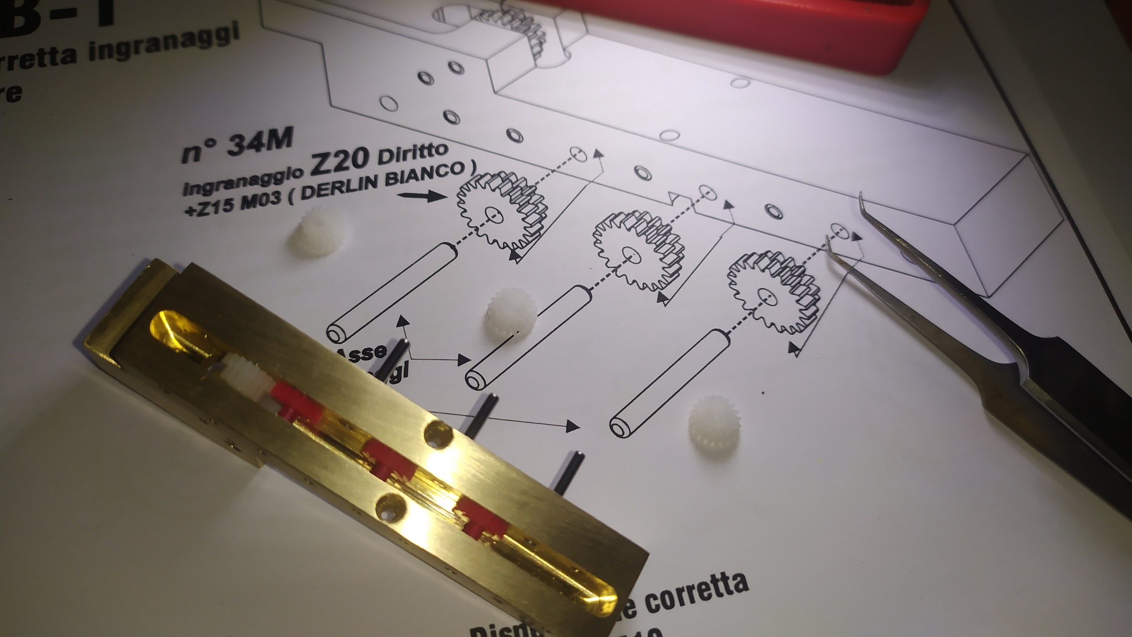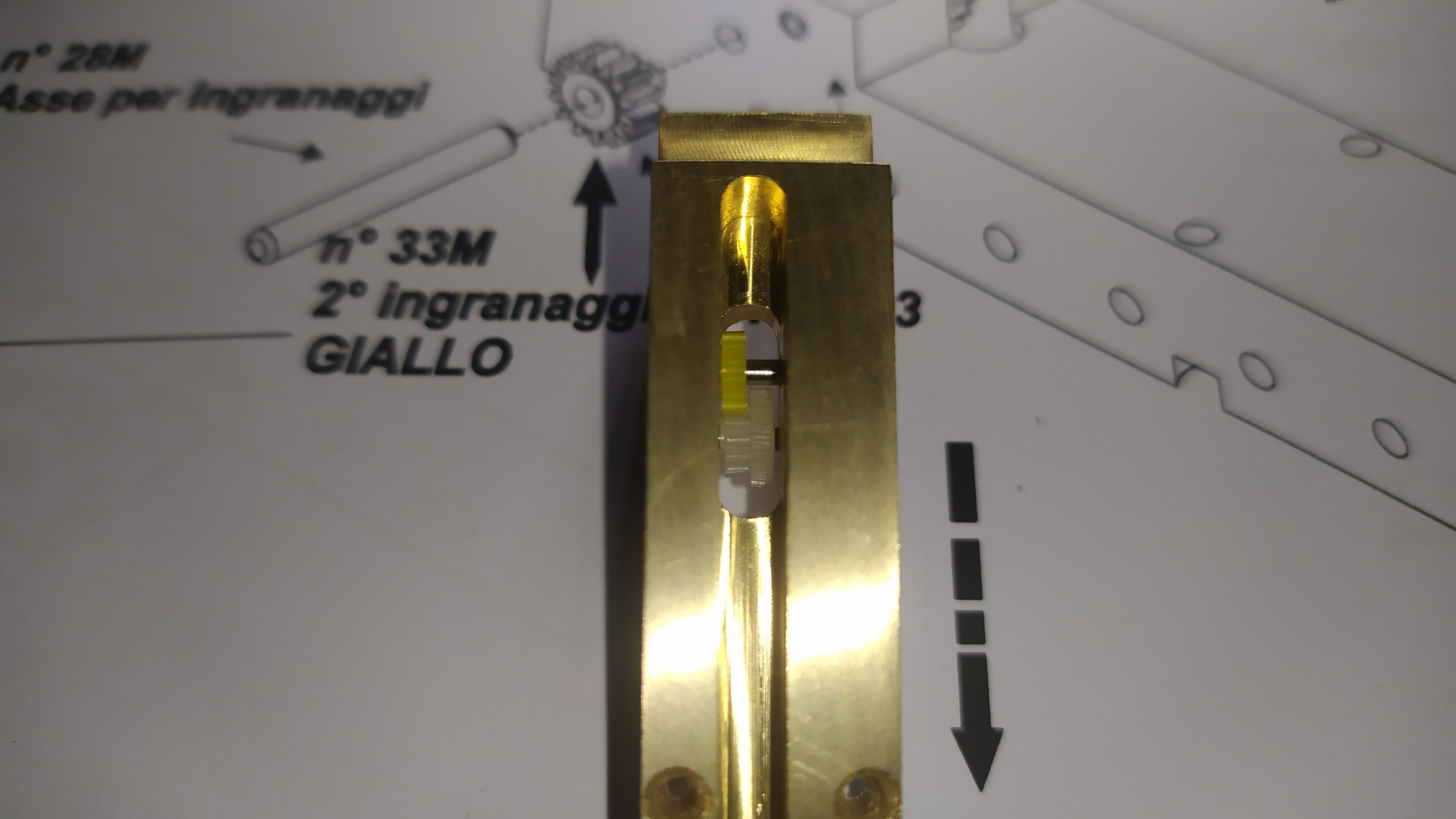 Un consiglio; prima di inserire gli ingranaggi provare i vari perni inserendoli nei fori per facilitare l'assemblaggio ed eliminare eventuali residui di lavorazione.