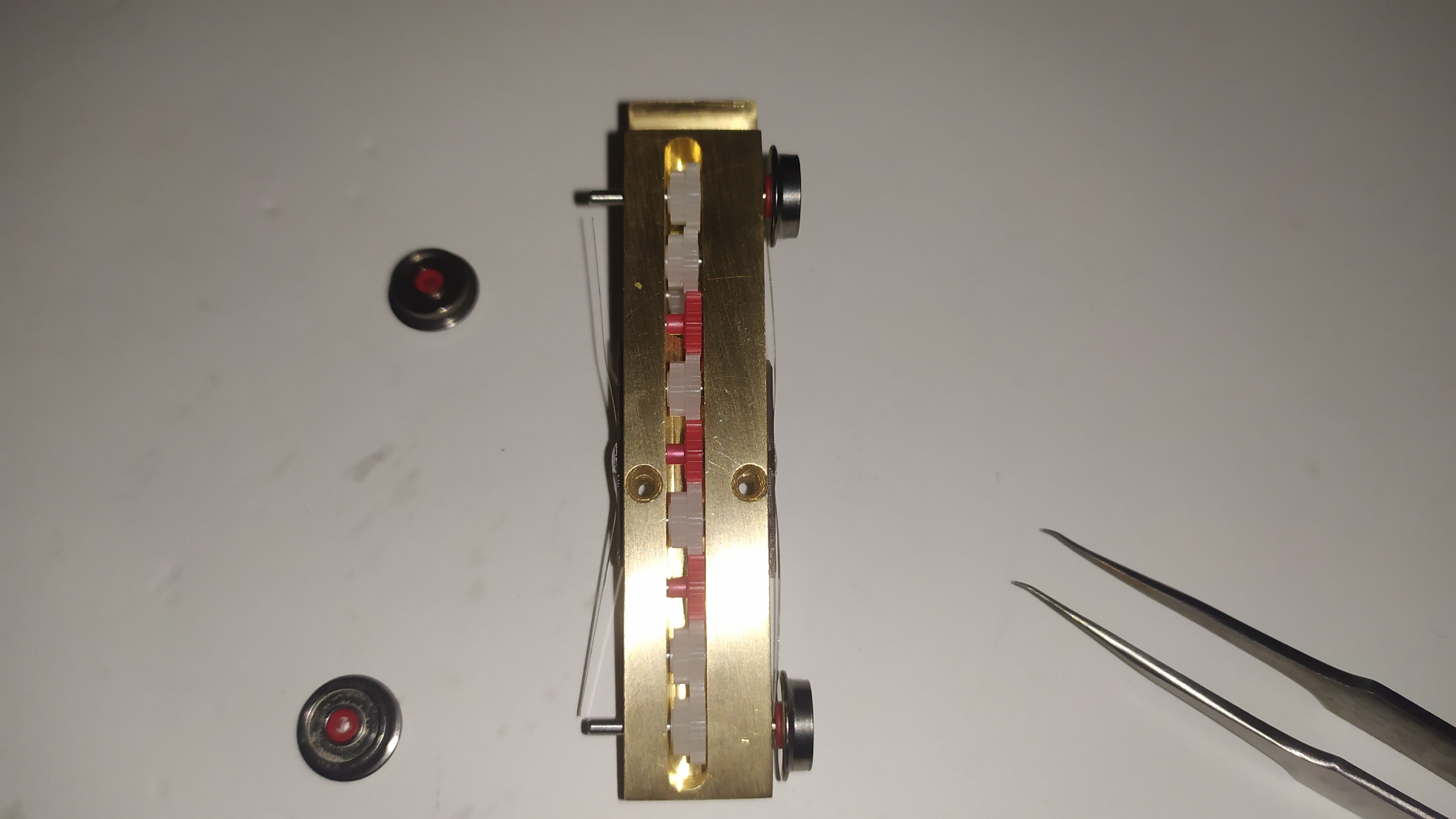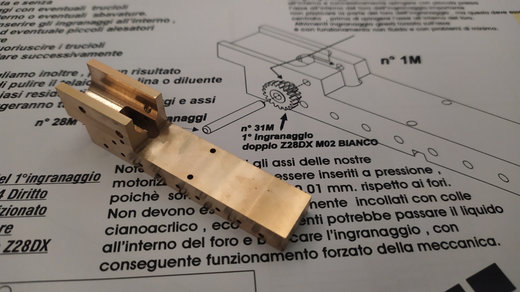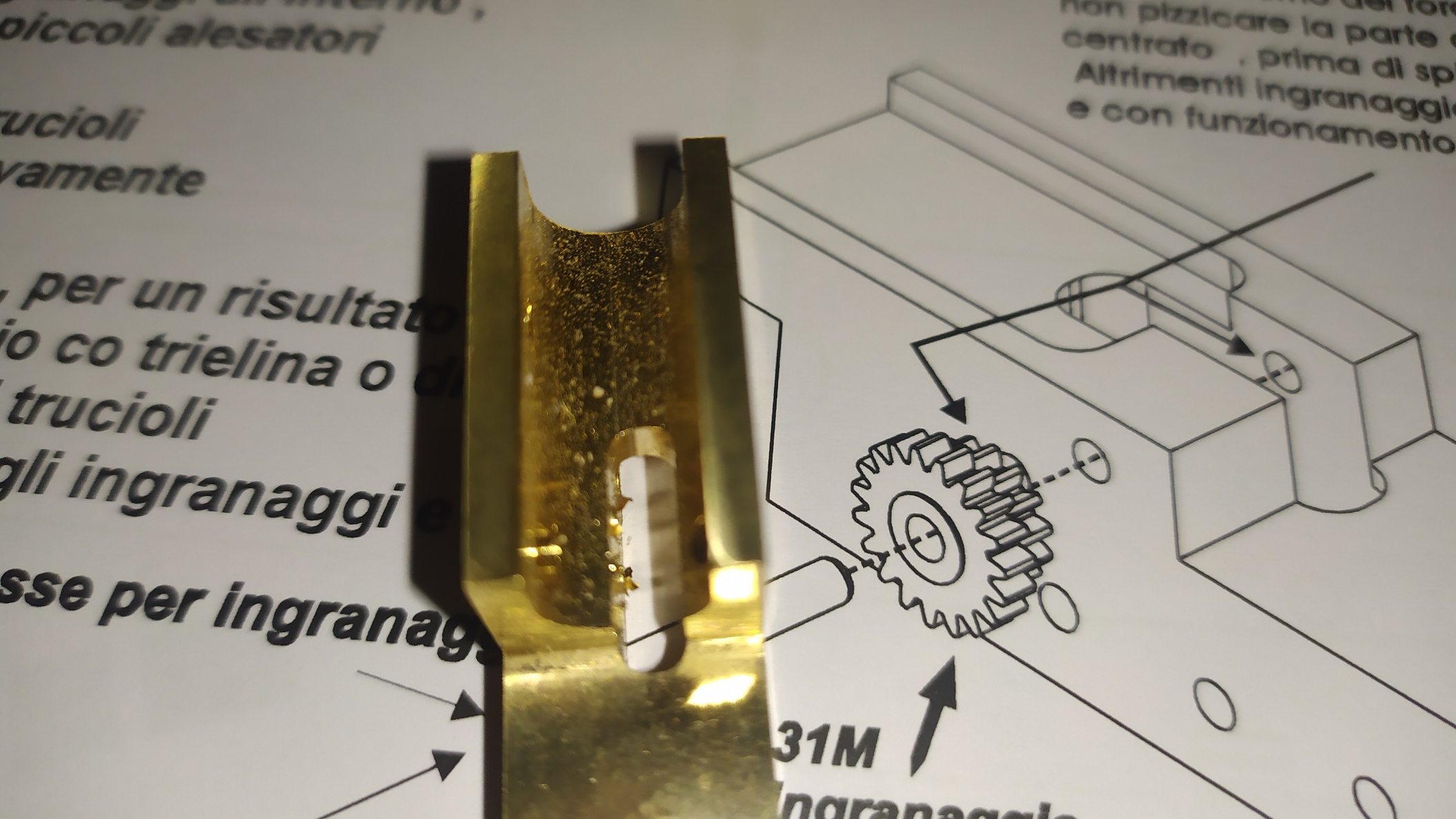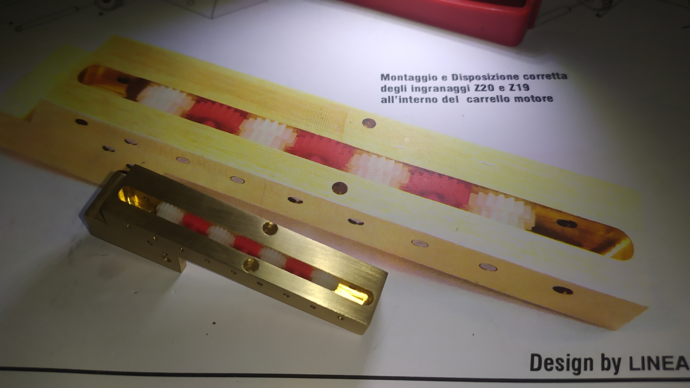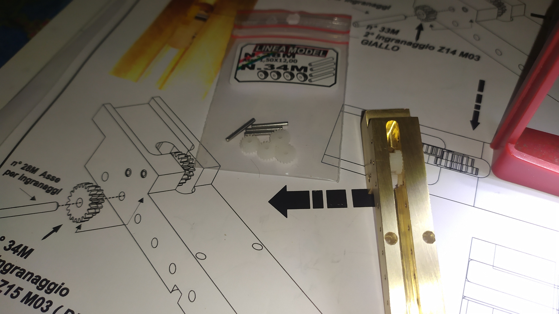 Un consiglio; prima di inserire gli ingranaggi provare i vari perni inserendoli nei fori per facilitare l'assemblaggio ed eliminare eventuali residui di lavorazione.