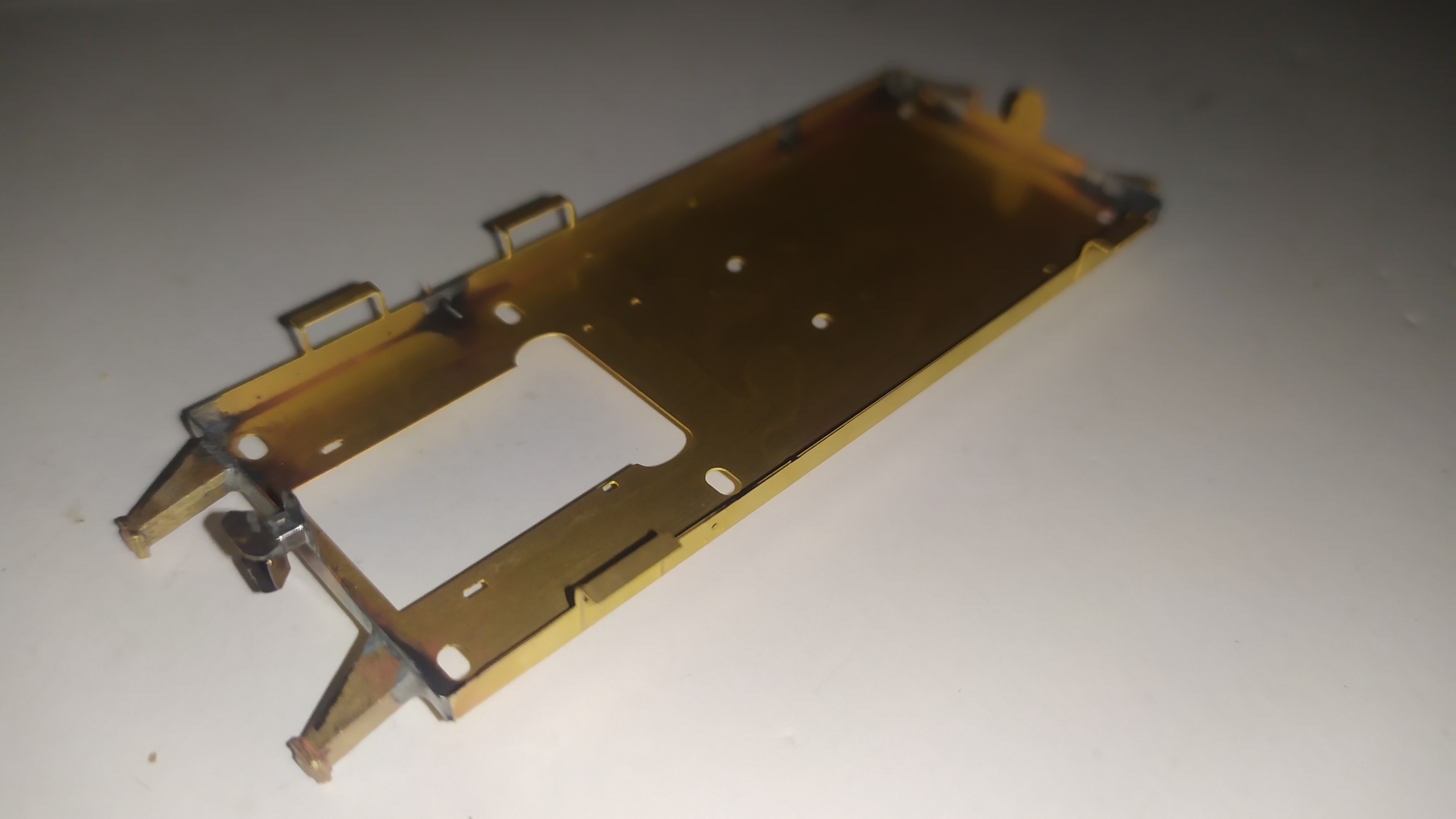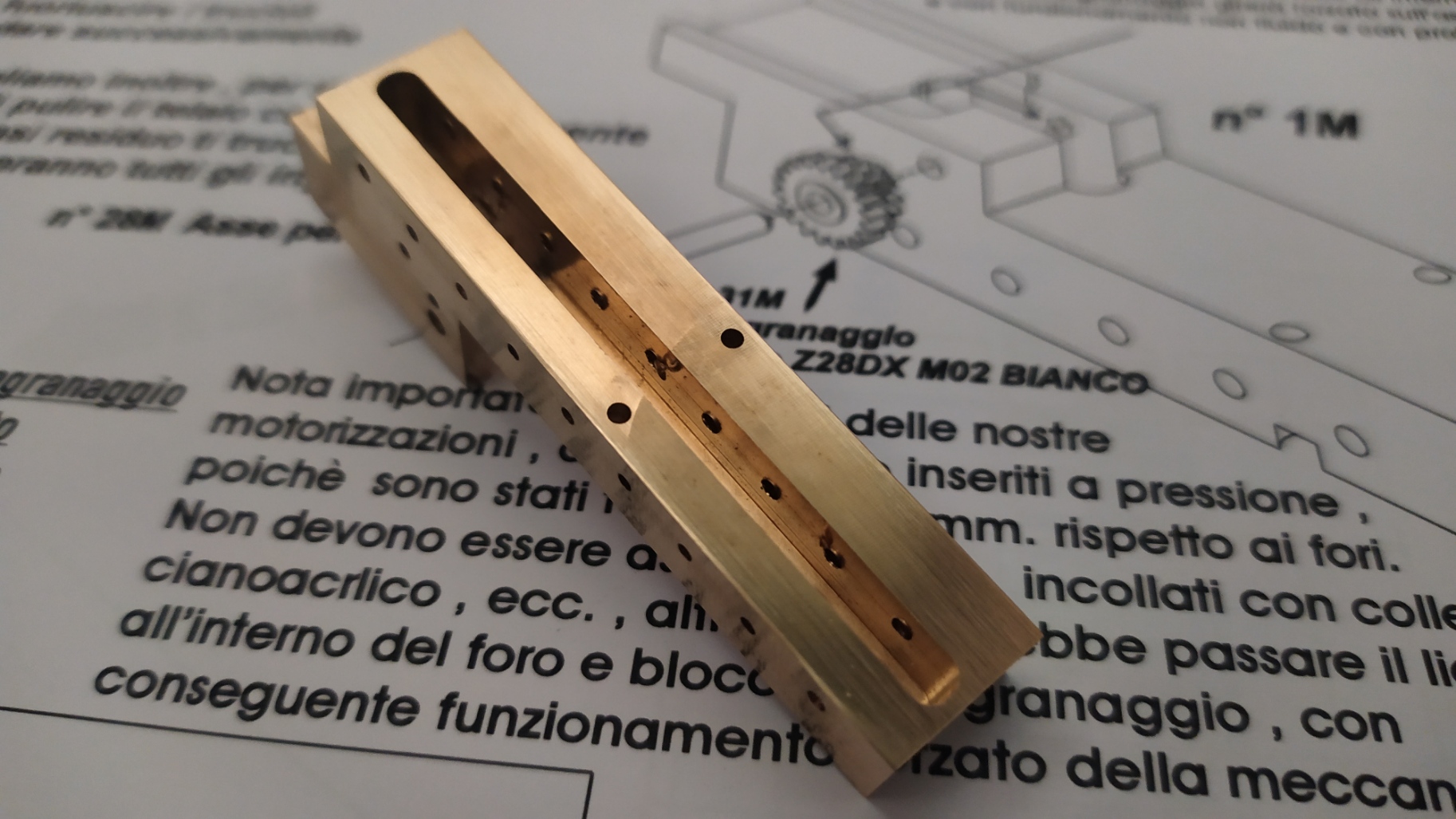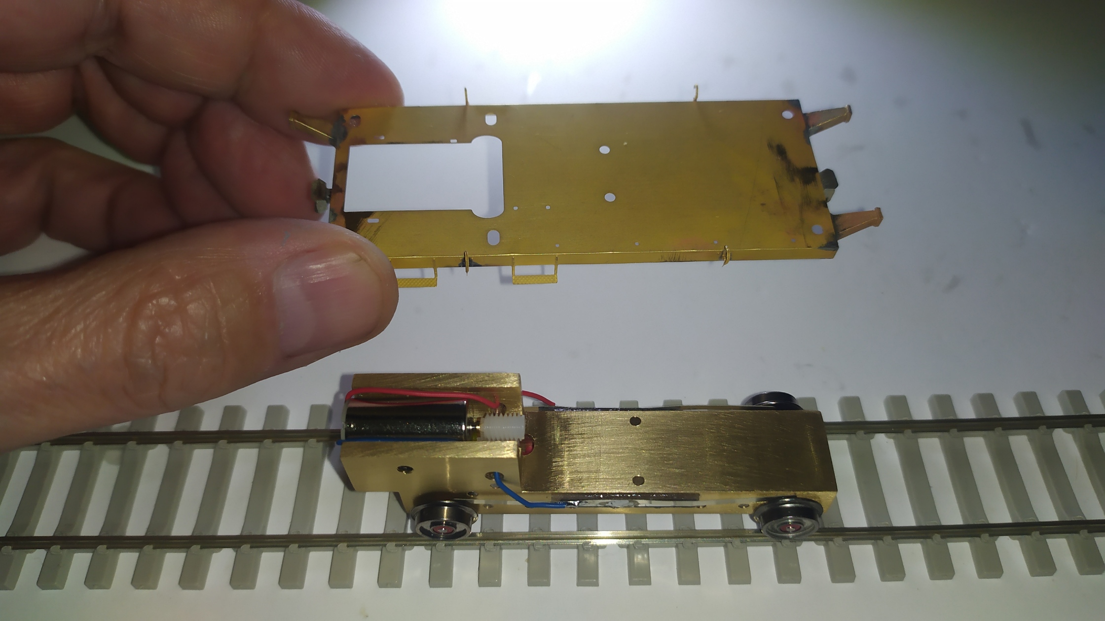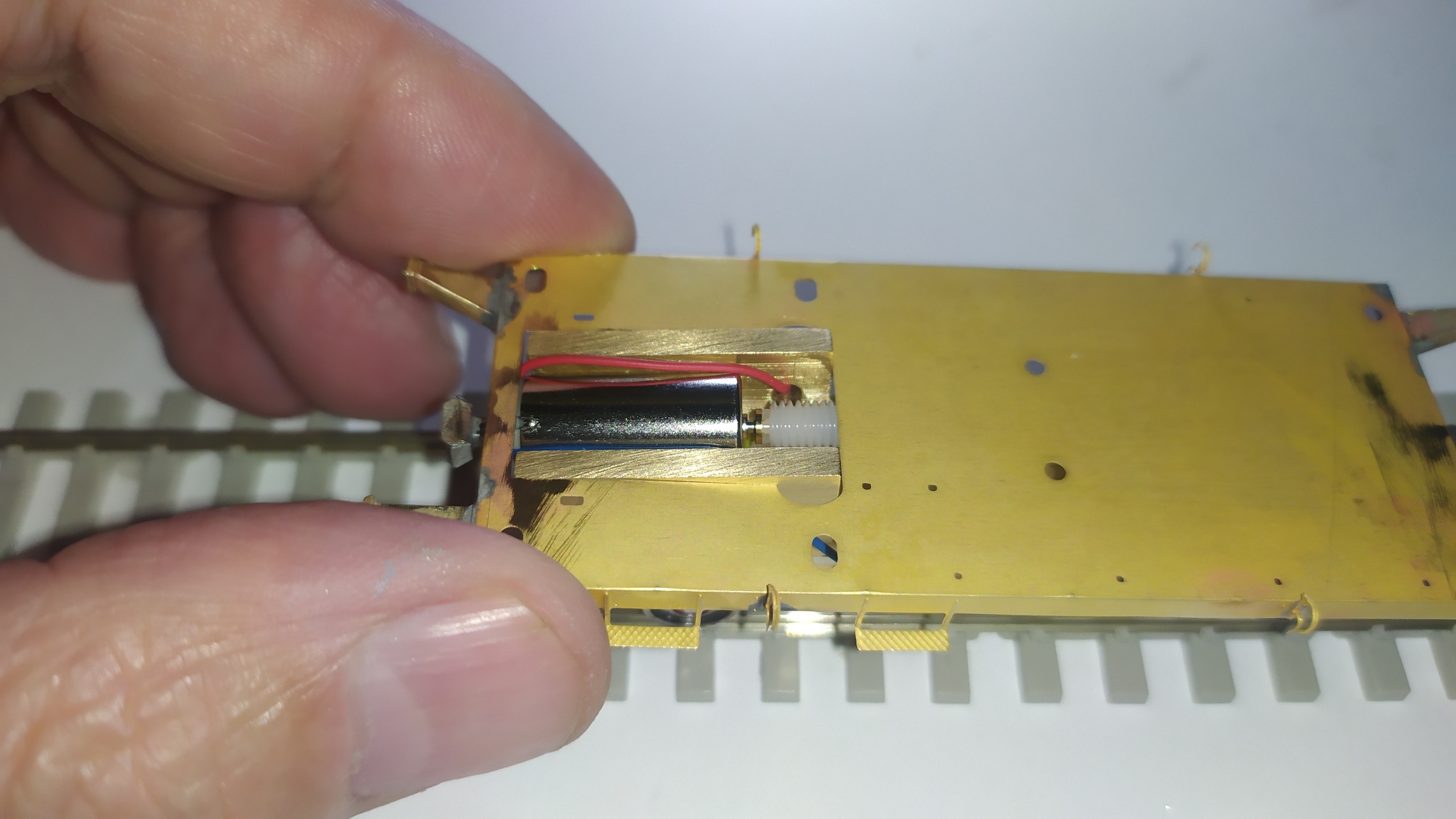 La motorizzazione di questo modello parte da un telaiio in ottone fresato in CNC fatto veramente bene: Il telaio si presenta da rifinire nelle superfici con lima e carta vetrata per eliminare eventuali sbavature e residui di lavorazione su tutte le superfici e gli spigoli. É necessario anche lavarlo con diluente o trielina pe eliminare qualsiasi impurità.
