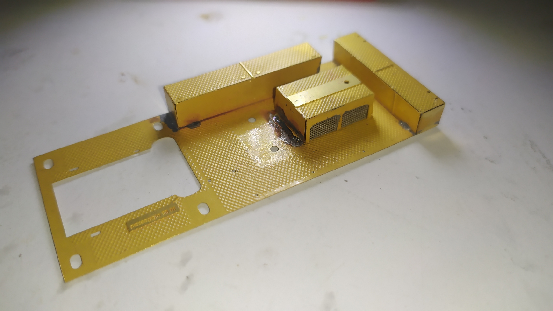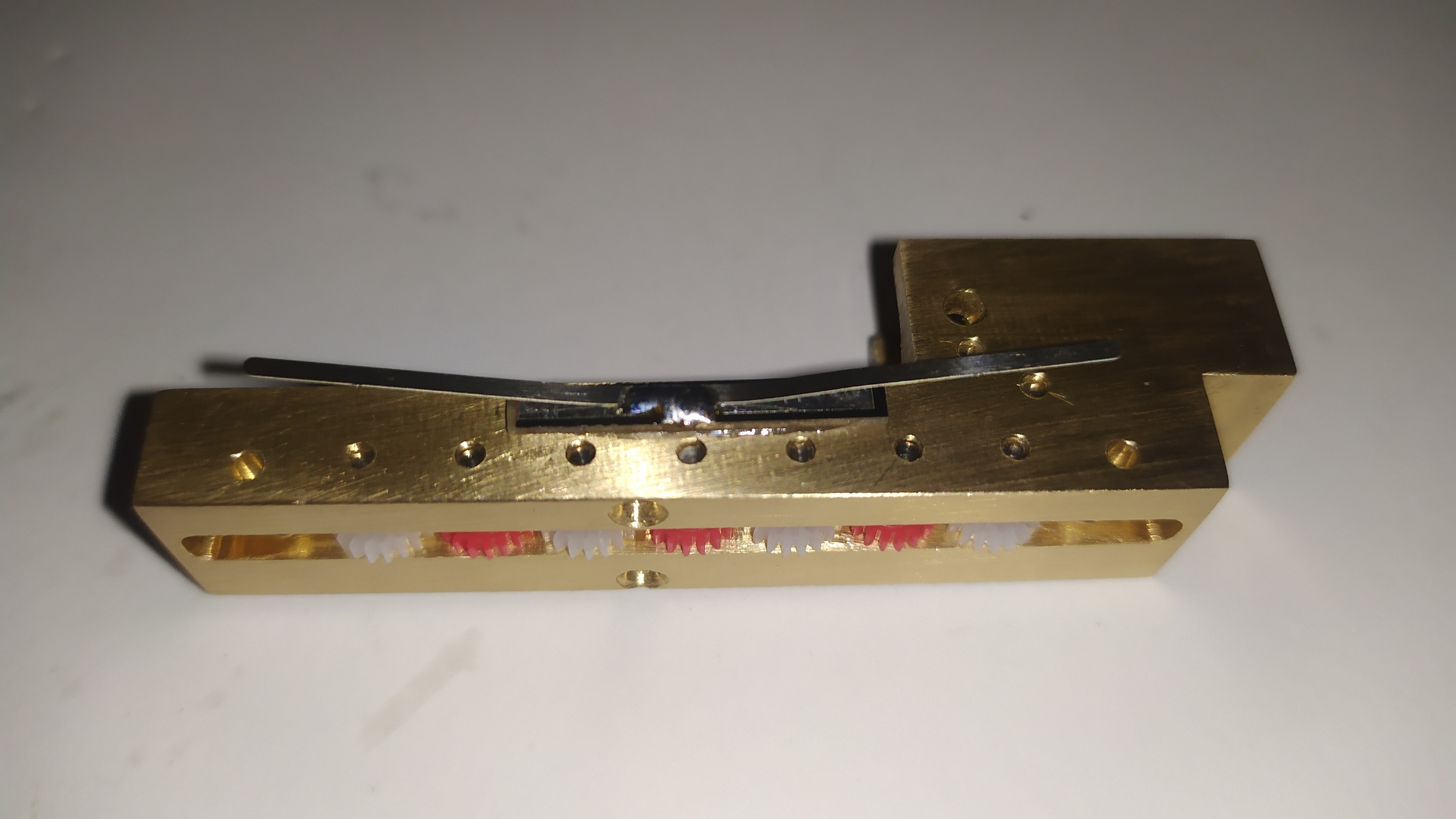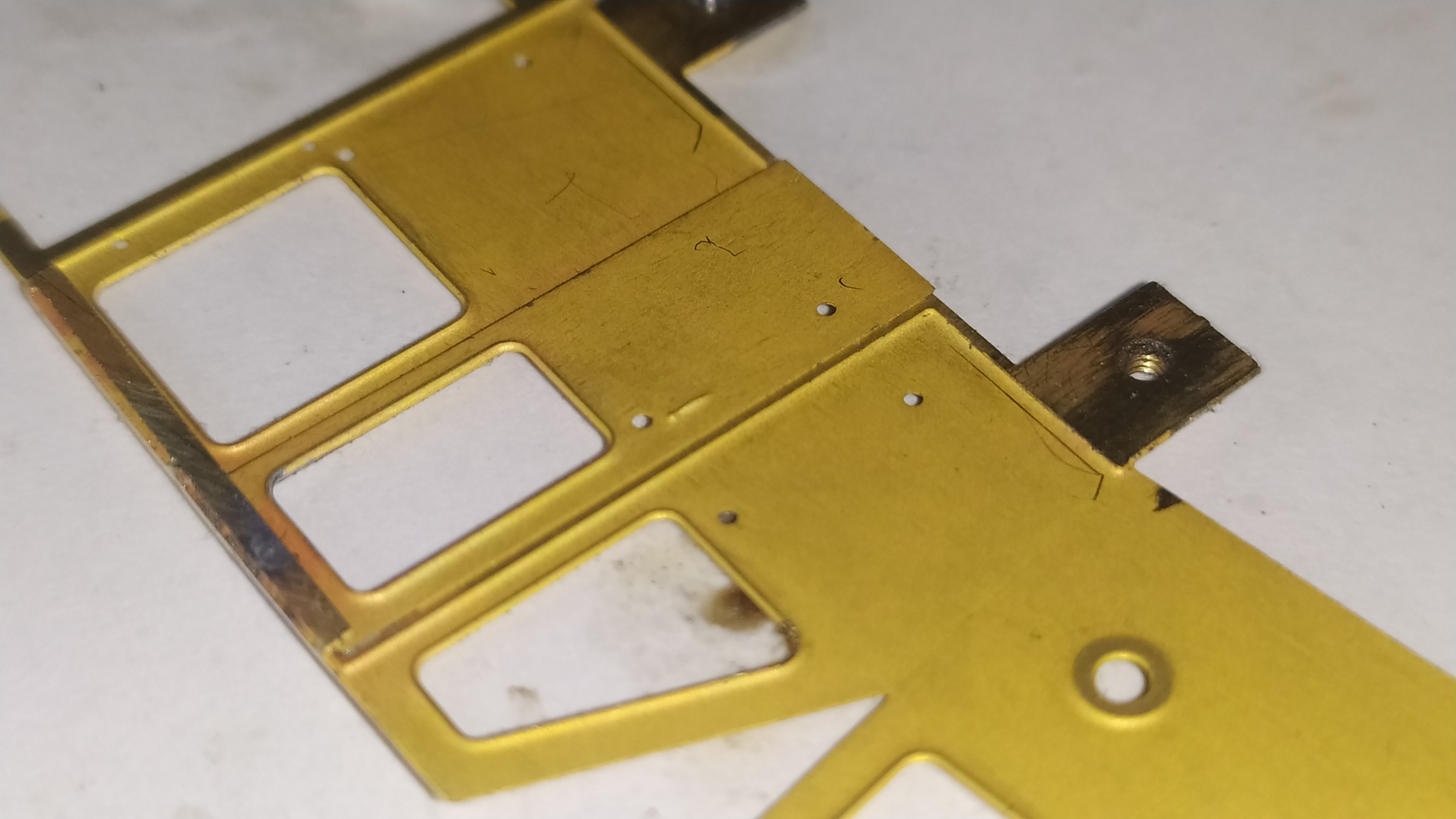 La motorizzazione di questo modello parte da un telaiio in ottone fresato in CNC fatto veramente bene: Il telaio si presenta da rifinire nelle superfici con lima e carta vetrata per eliminare eventuali sbavature e residui di lavorazione su tutte le superfici e gli spigoli. É necessario anche lavarlo con diluente o trielina pe eliminare qualsiasi impurità.