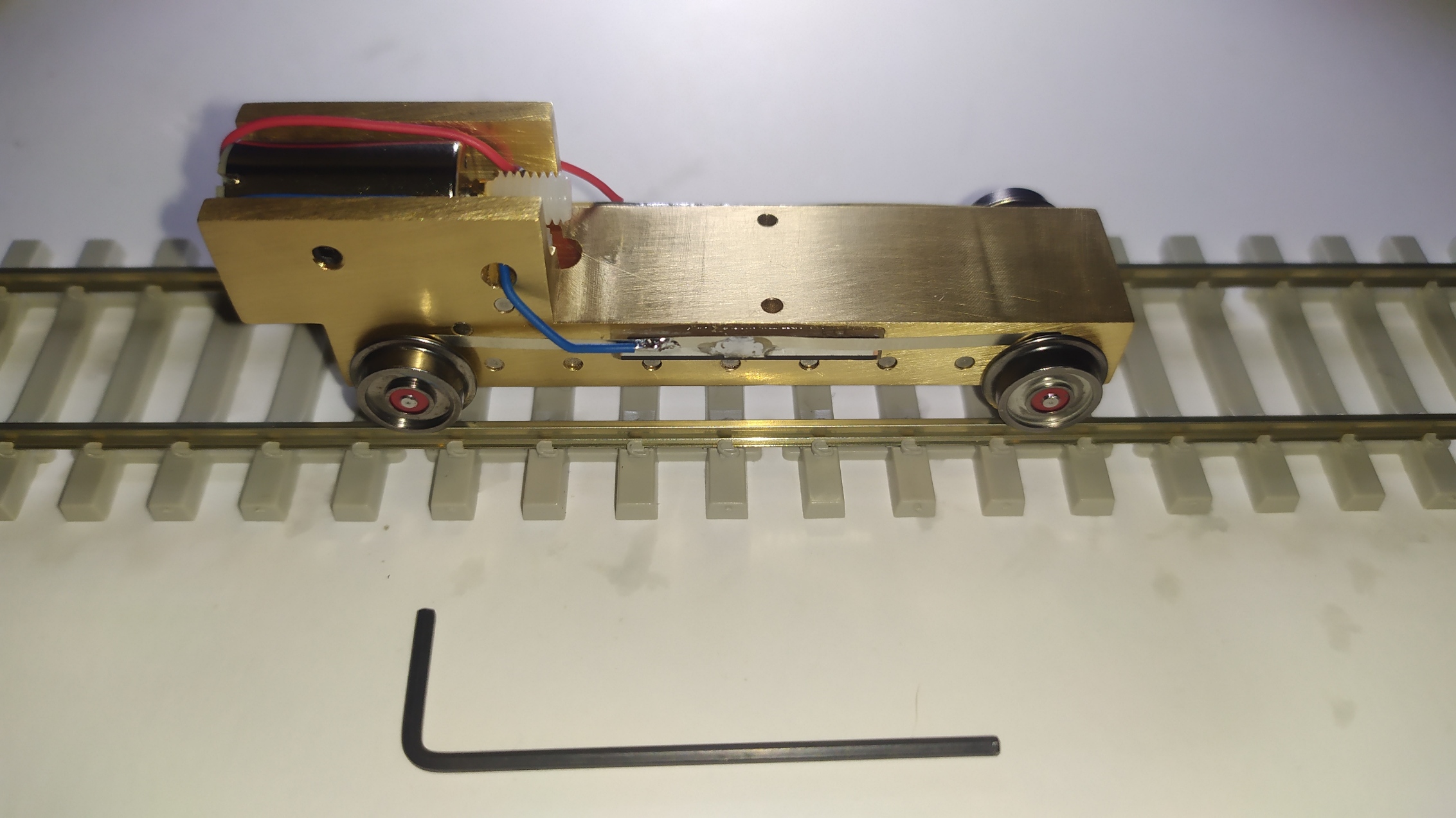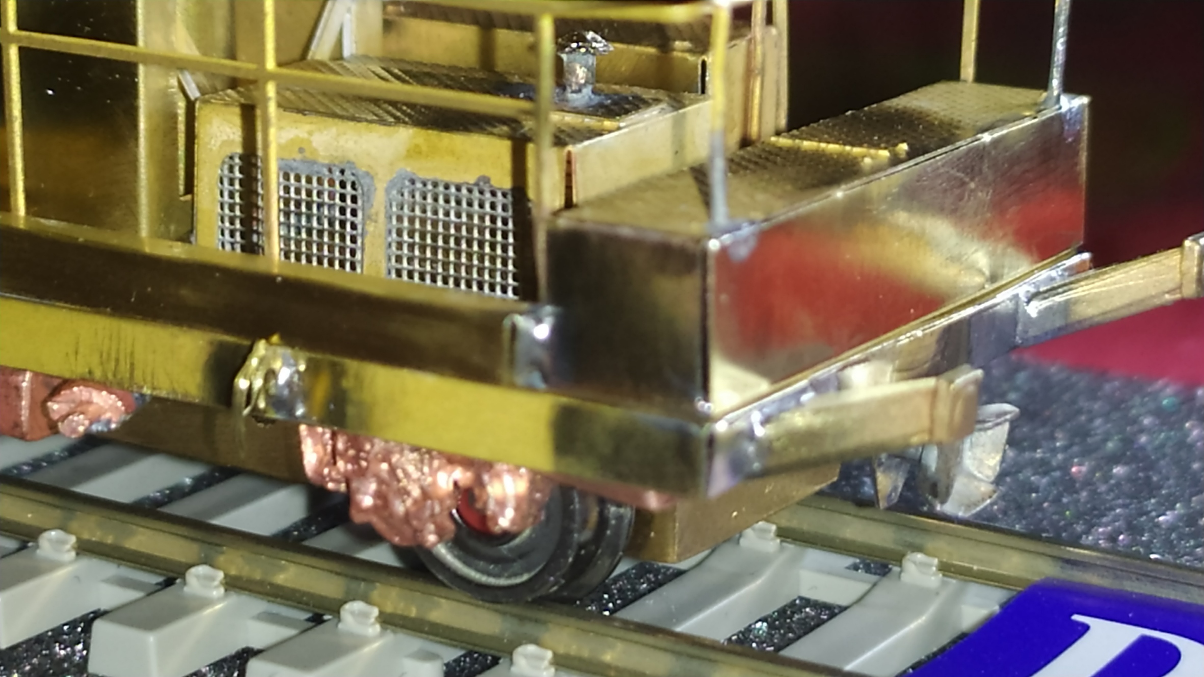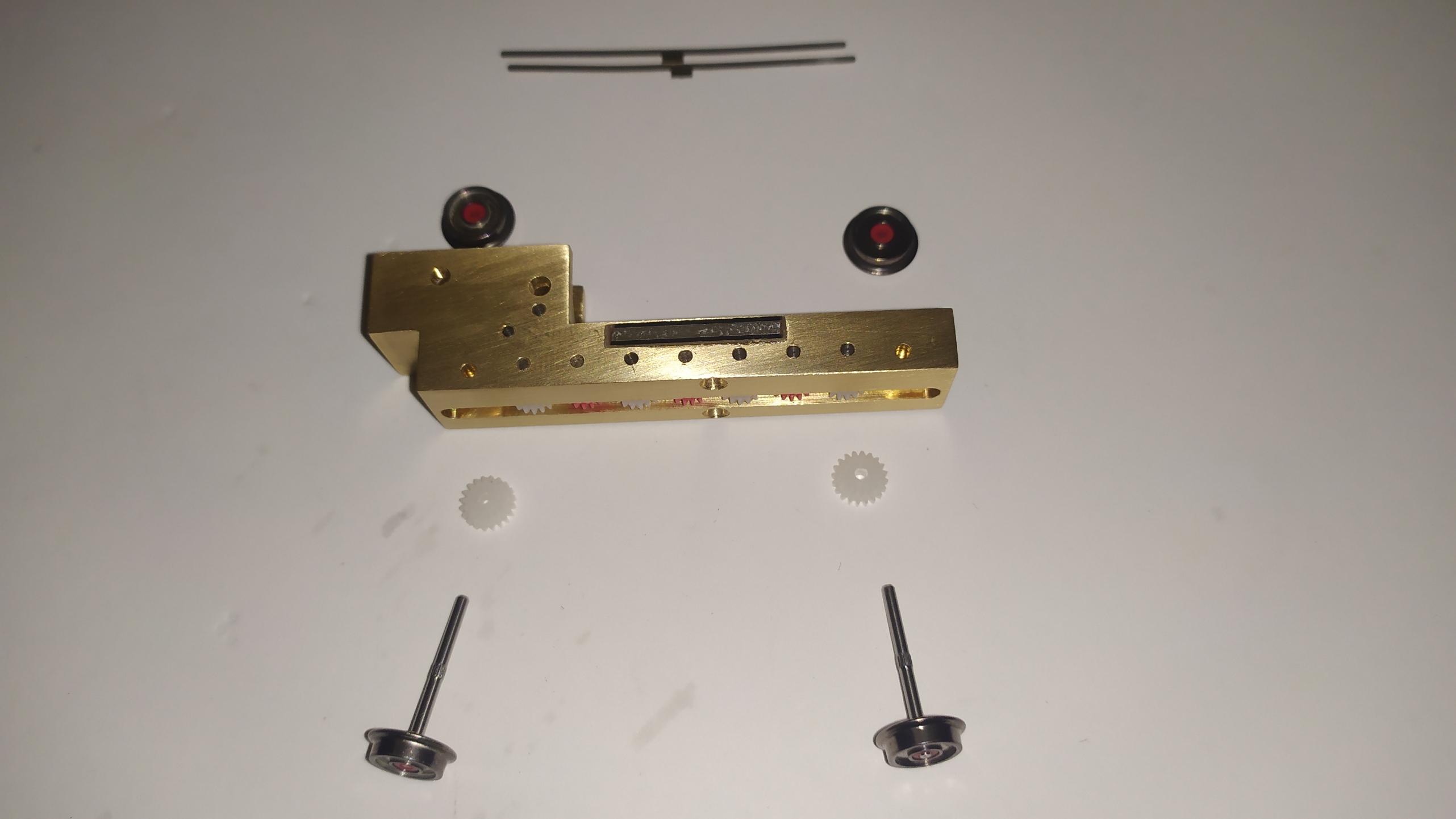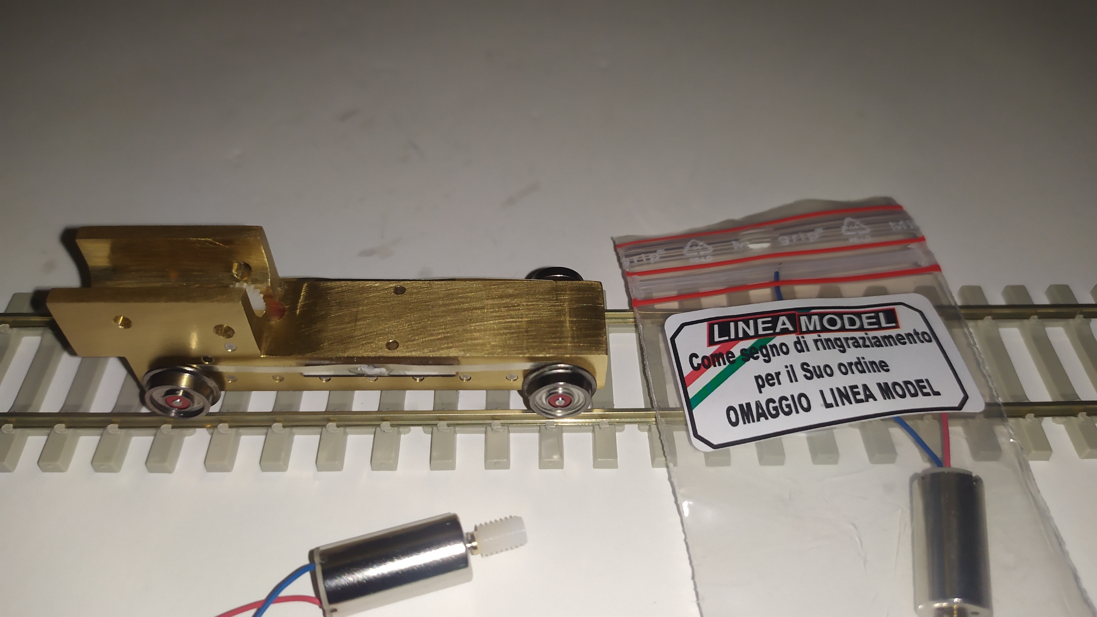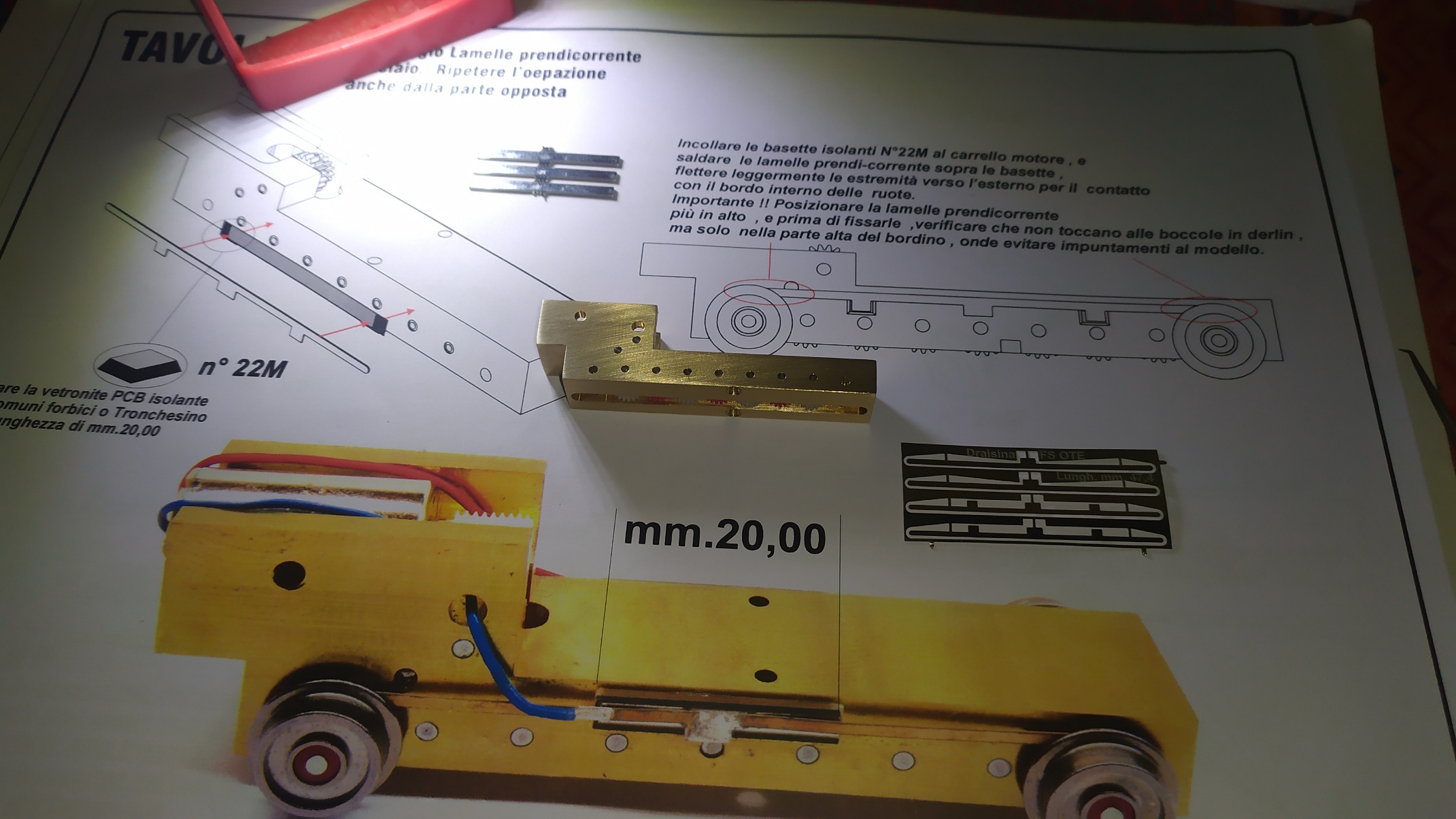 Nel kit sono presenti una lastrina in alpacca da 0,15 mm e degli spezzoni di circuito stampato doppia faccia. Per il montaggio delle lamelle è necessario tagliare i circuiti stampati ad una lunghezza di 20 mm e incollarli successivamente dulle fiancate del carrello motore. Nel frattempo installare le boccole isolanti nelle 4 ruote. Incollare con cianoacrilico i circuiti stampati e preparare gli assali con gli ultimi 2 ingranaggi. Saldare le lamelle prendicorrente e piegarle leggermente verso l'esterno. Infine inserire gli assali e gli ingranaggi. Ed il motore fissandolo con un grano inserito lateralmente. Collaudo: