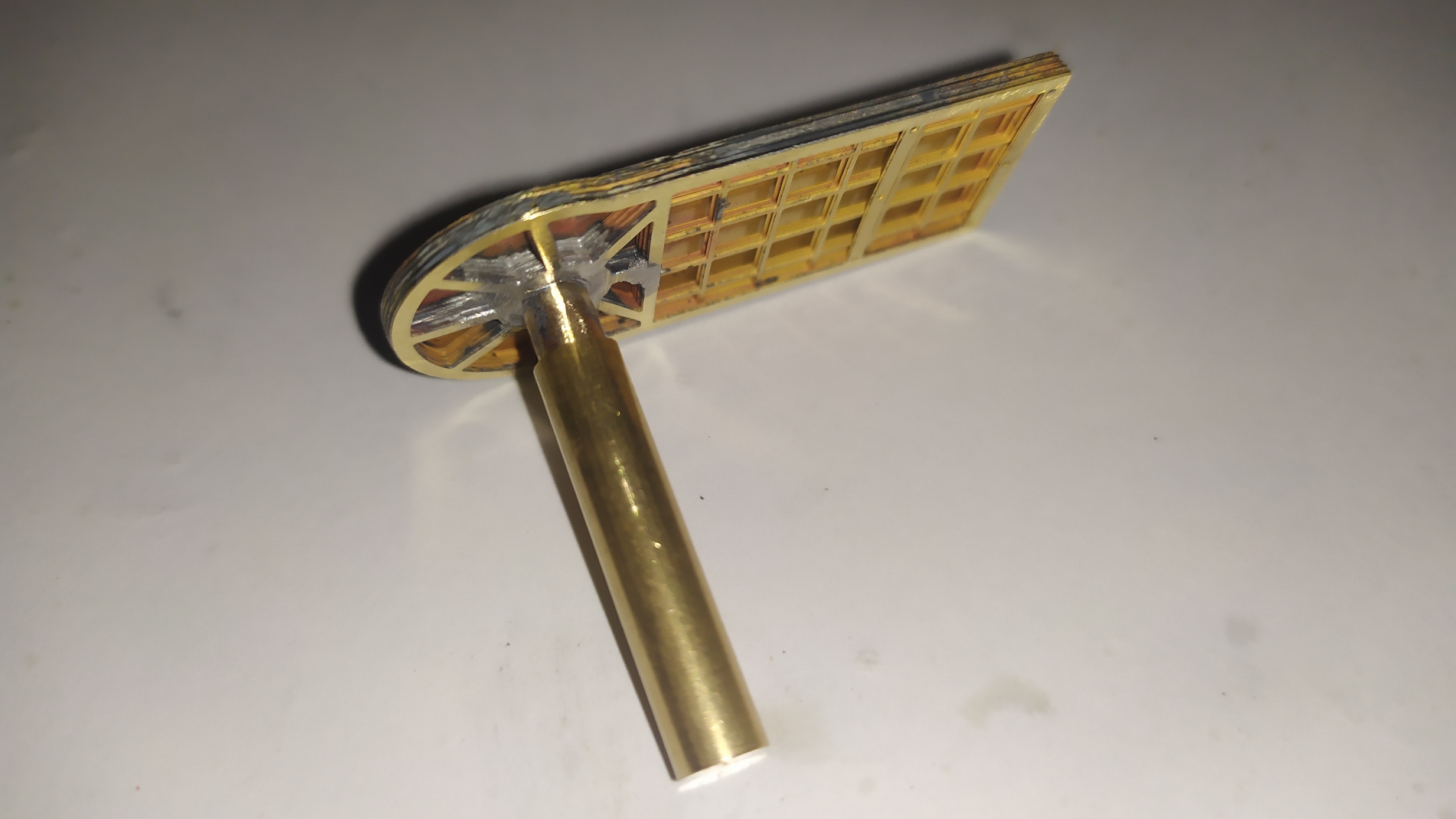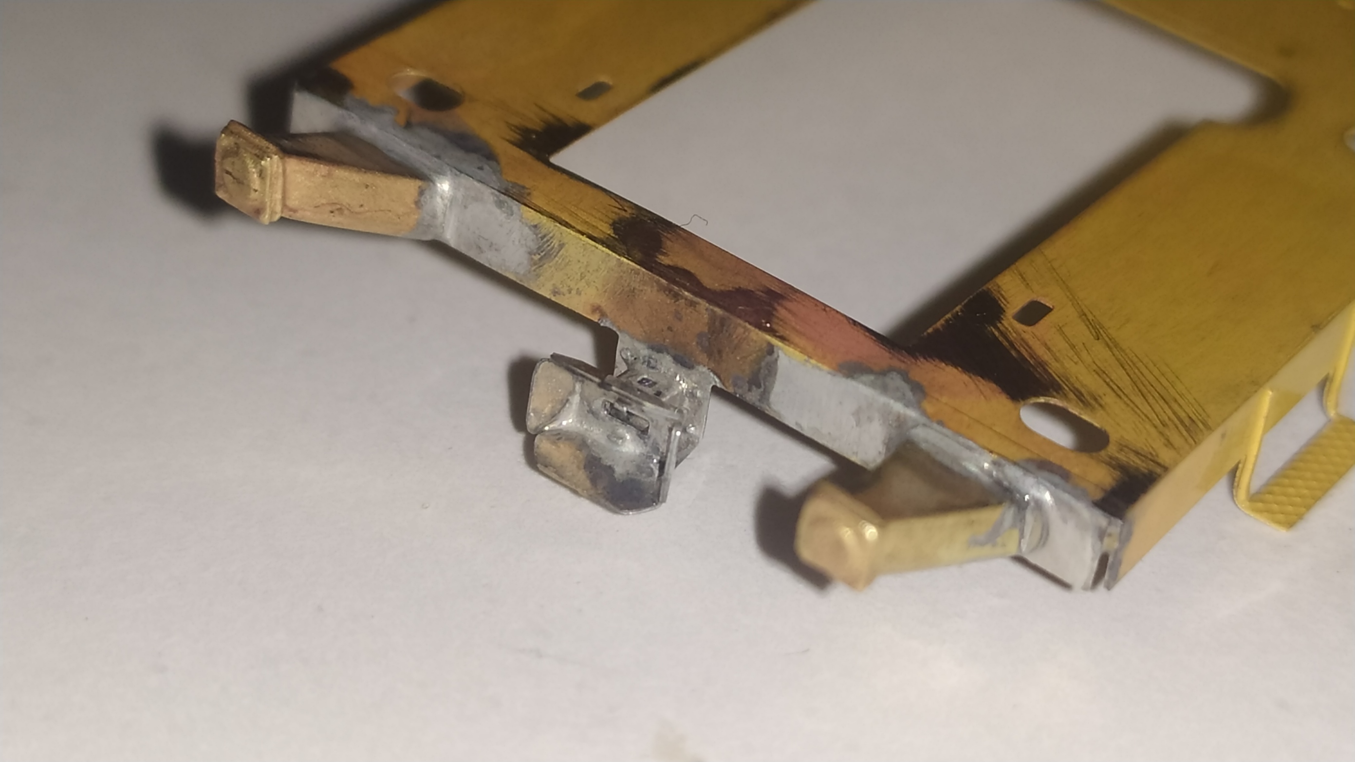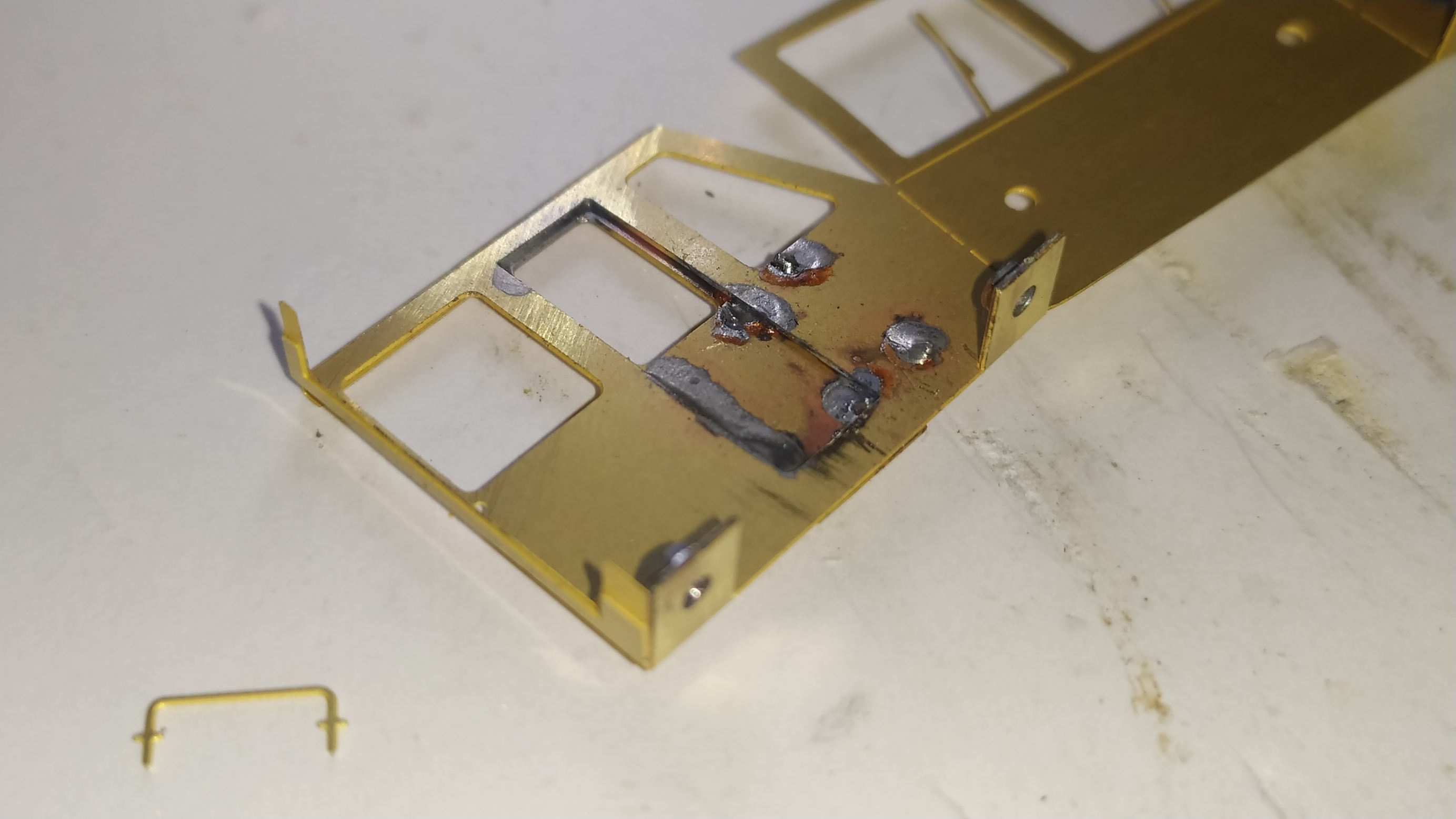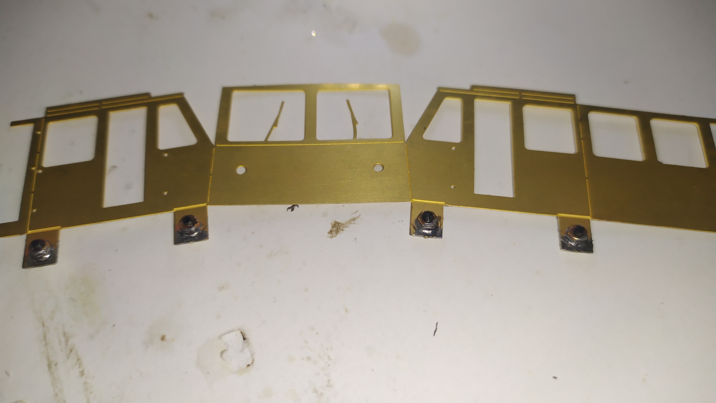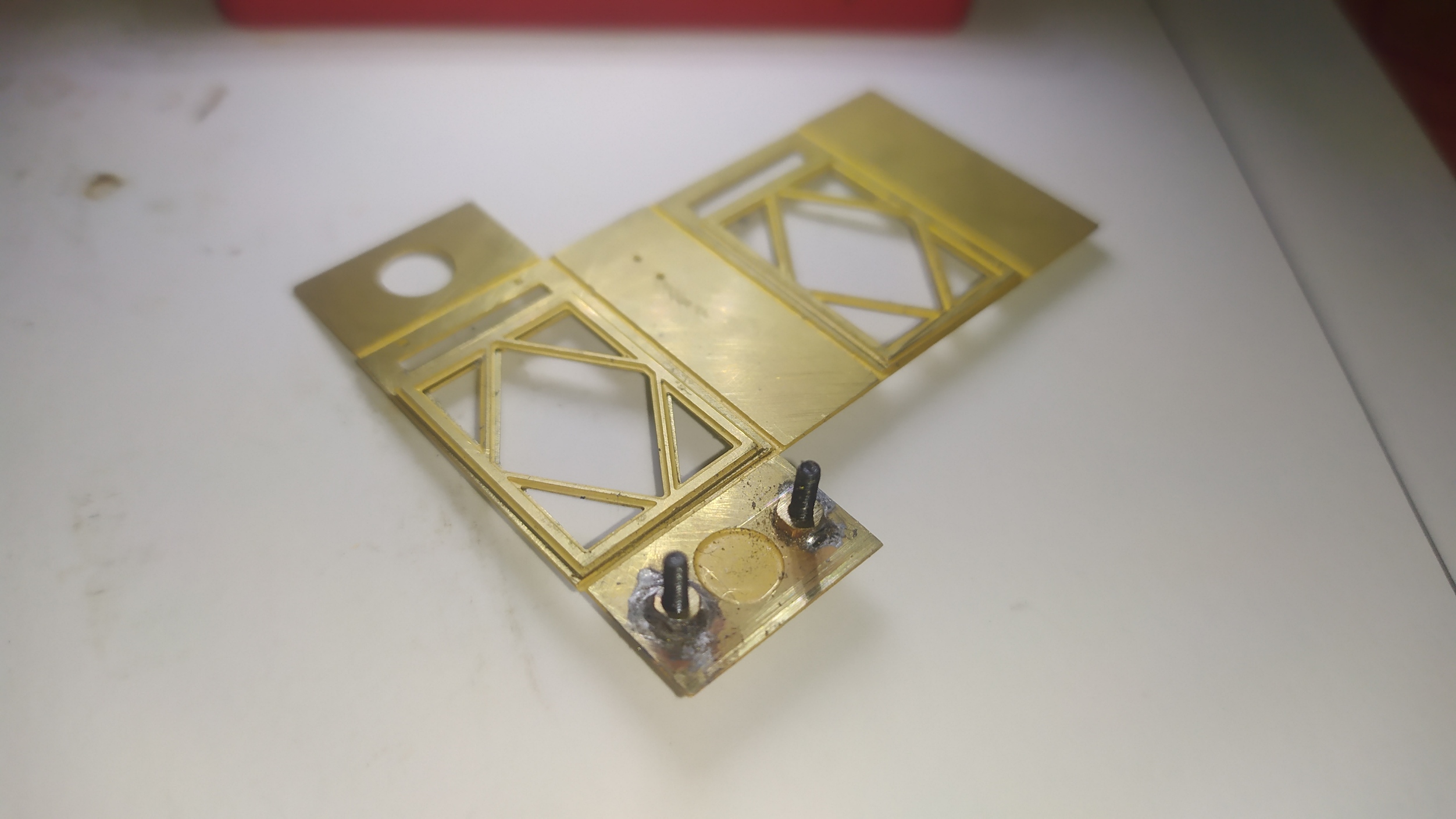L'assemblaggio di questa parte del modello inizia ad essere un po' più complessa: Sul particolare più grande a destra, sono stati icollati con cianoacrilico i particolari numero 27 (i rettangoli con il rombo) e saldati un paio di dadi. Quando si saldano i dadi su una lastrina, bisogna fare in modo che lo stagno non raggiunga i filetto interno dei dadi.