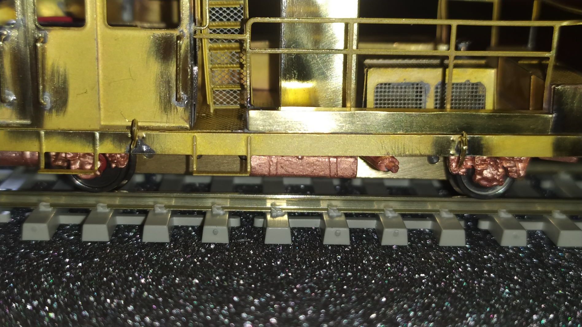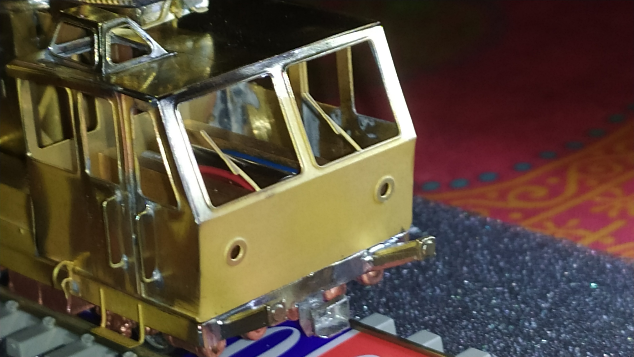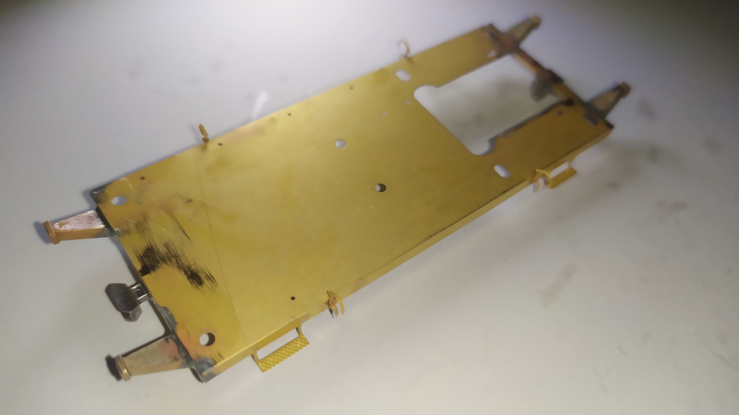 Saldiamo in posizione i 4 respingenti in microfusione di ottone, i ganci realistici e 4 particolari laterali. Sono stati piegati anche i 4 predellini. Prova di inserimento nel carrello motore. Il sottotelaio non entra, in quanto il motore sporge di cira 1 mm sul lato longitudinale. Le soluzioni possibili sono due: