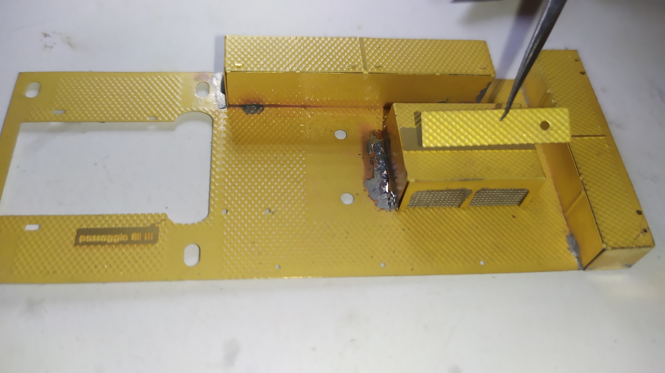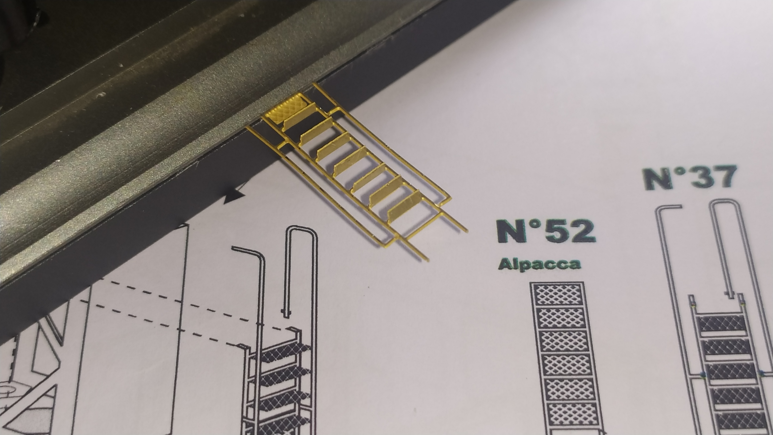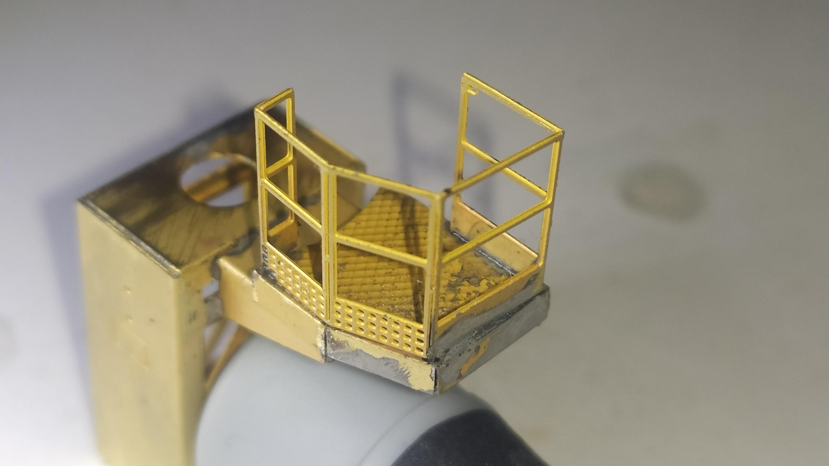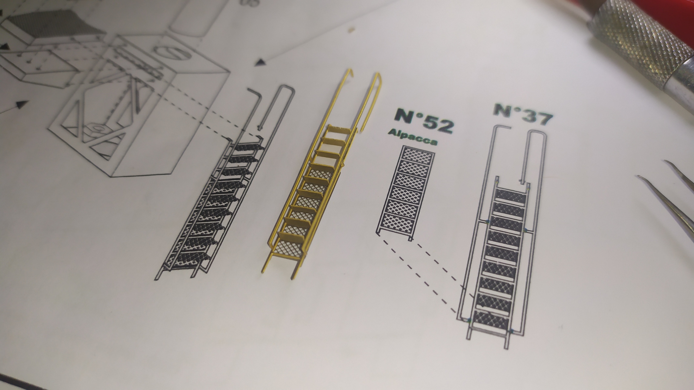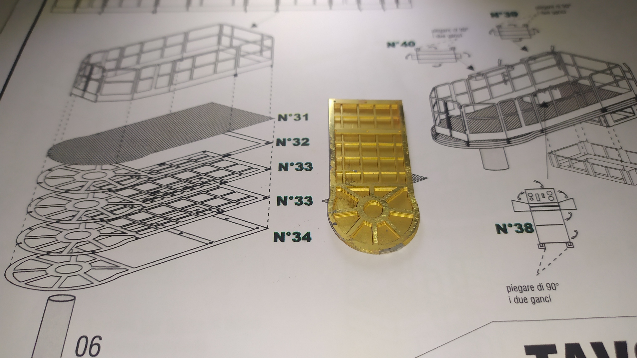 In questo caso ho risolto passando semplicemente le viti un paio di volte. Una volta saldati i dadi possiamo chiudere il supporto dell'elevatore sui 4 lati aiutandoci con del nastro carta. Altri particolari vengono piegati e montati sull'elevatore. Ringhiera elevatore. Prima prova di montaggio. Peparazione della scaletta. Questa operazione è molto delicata.