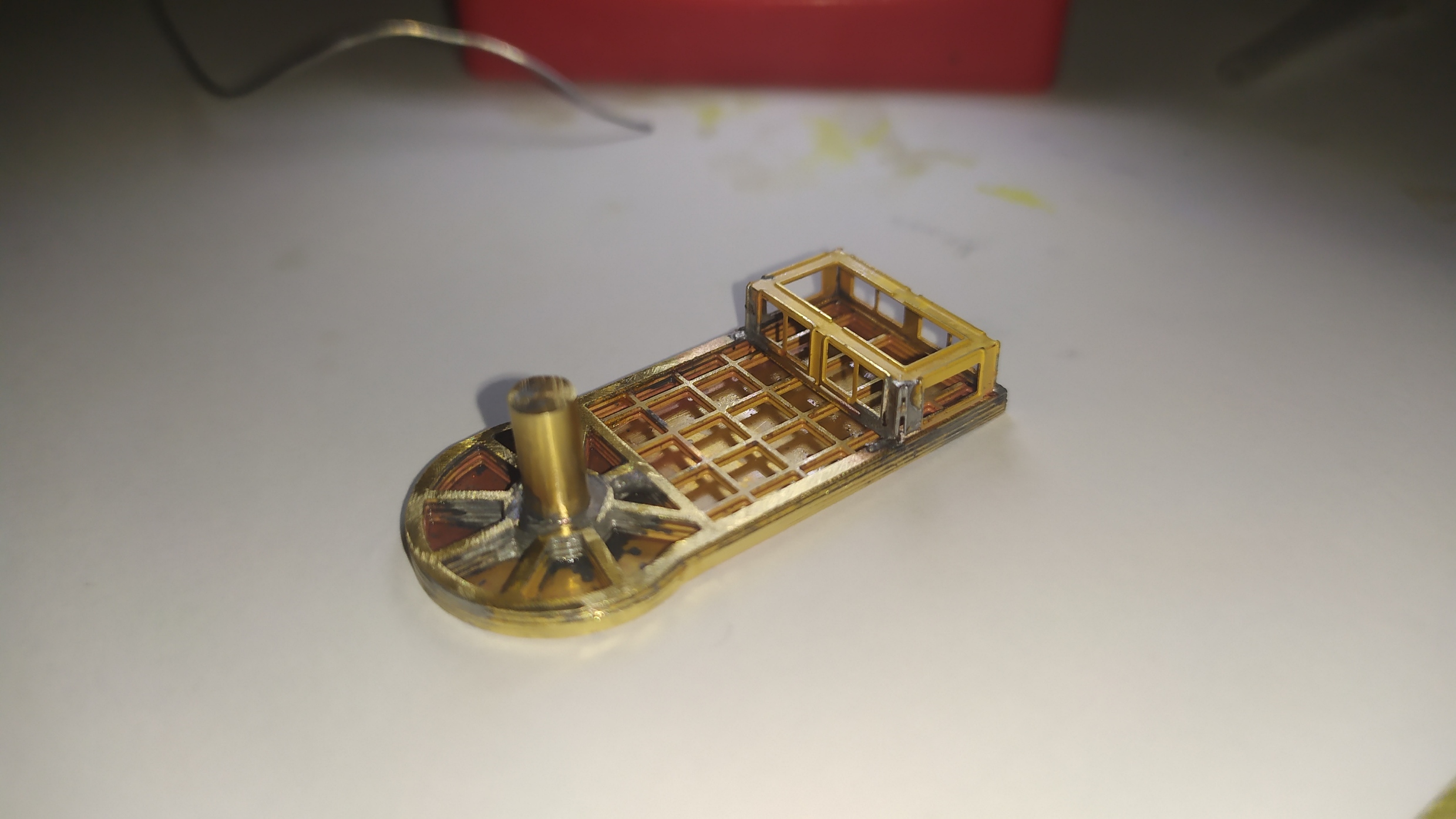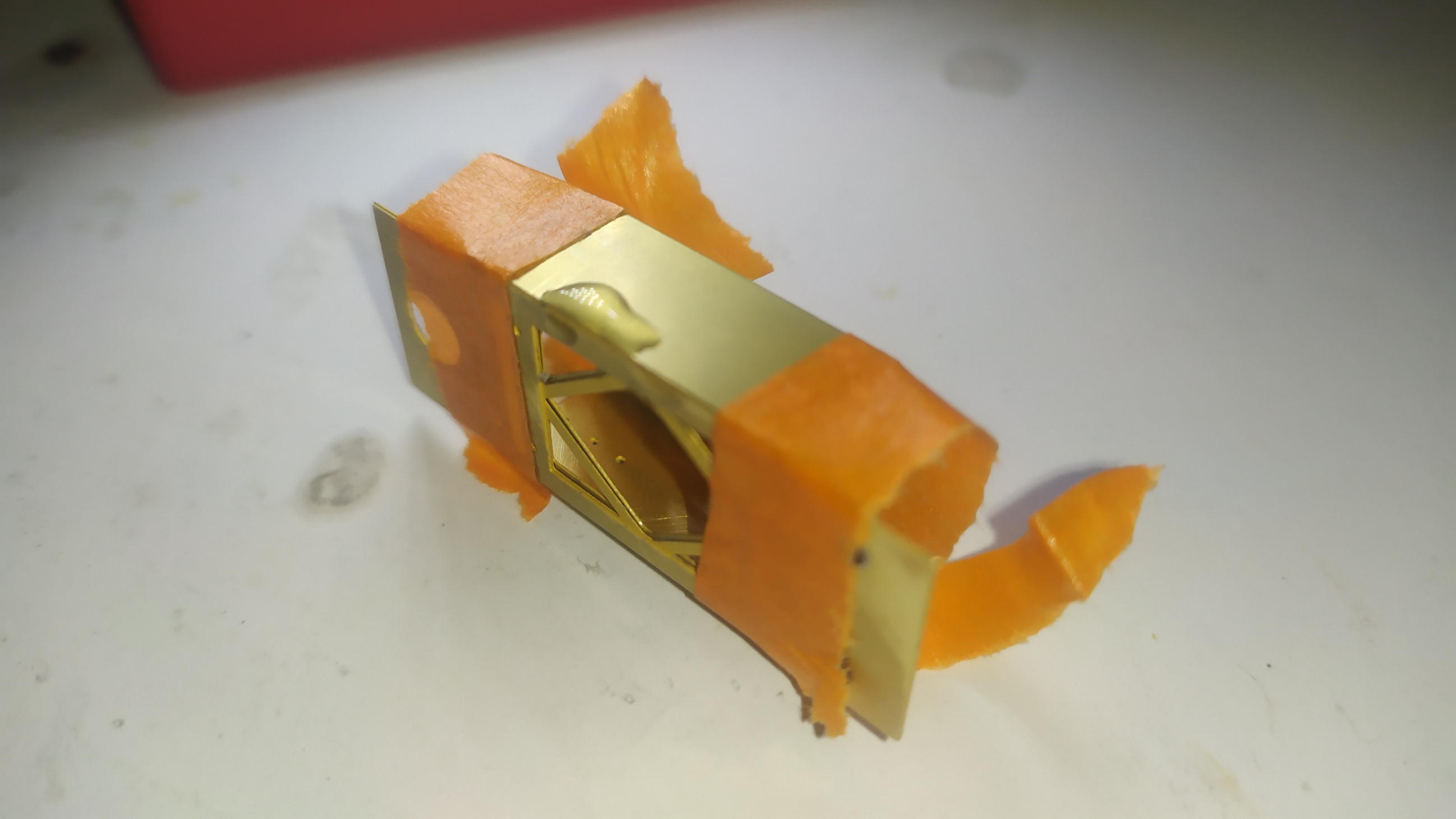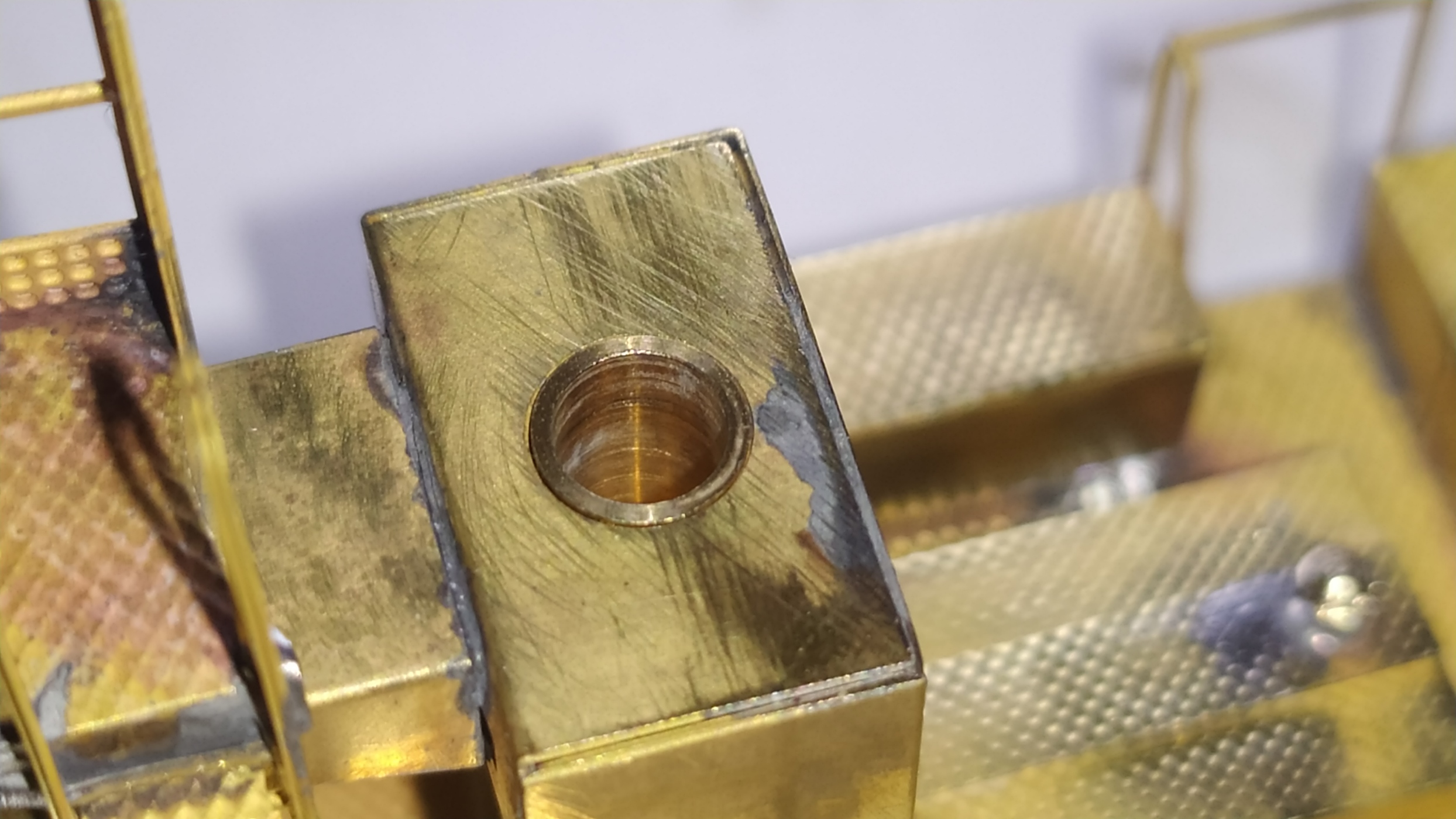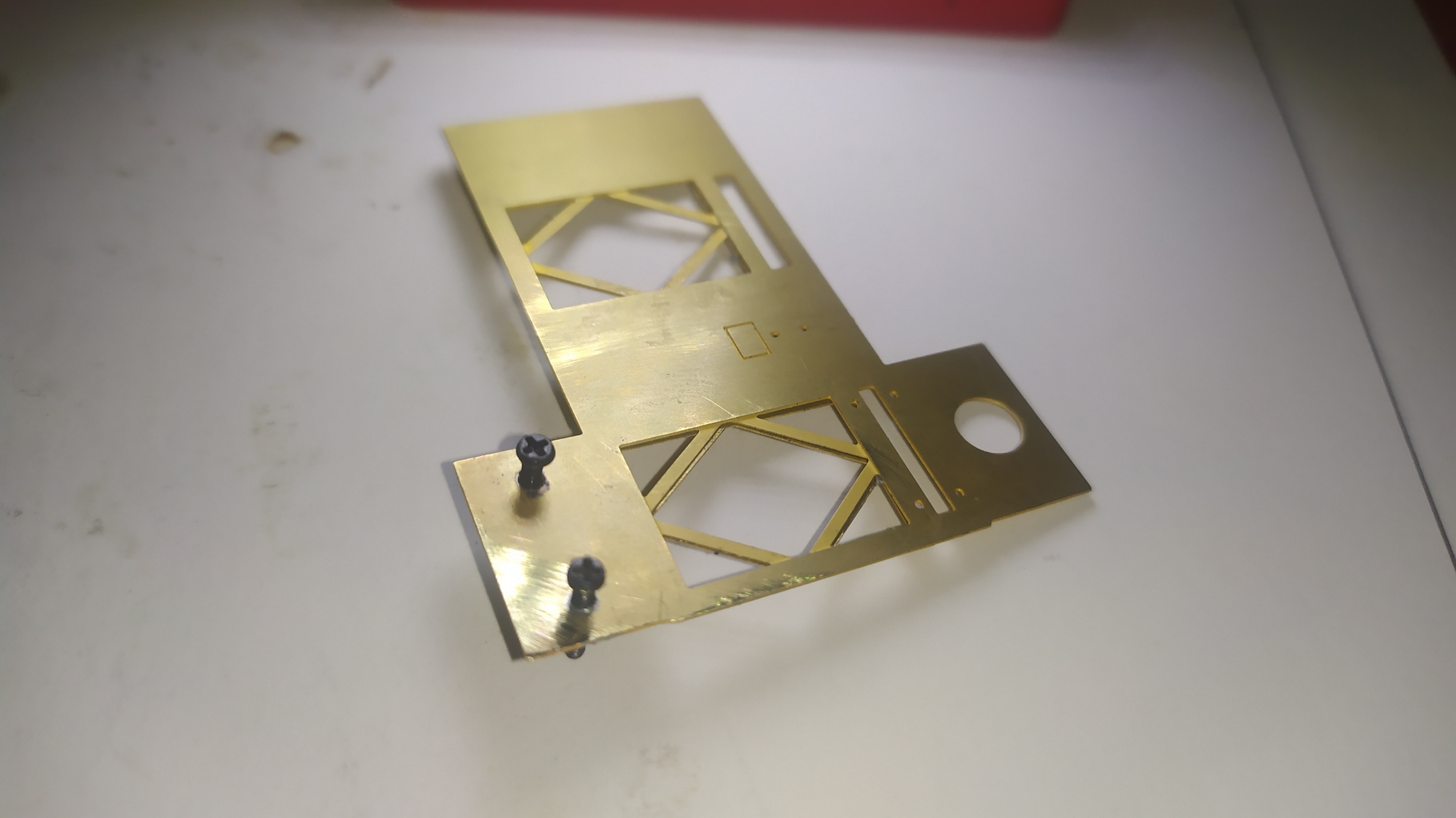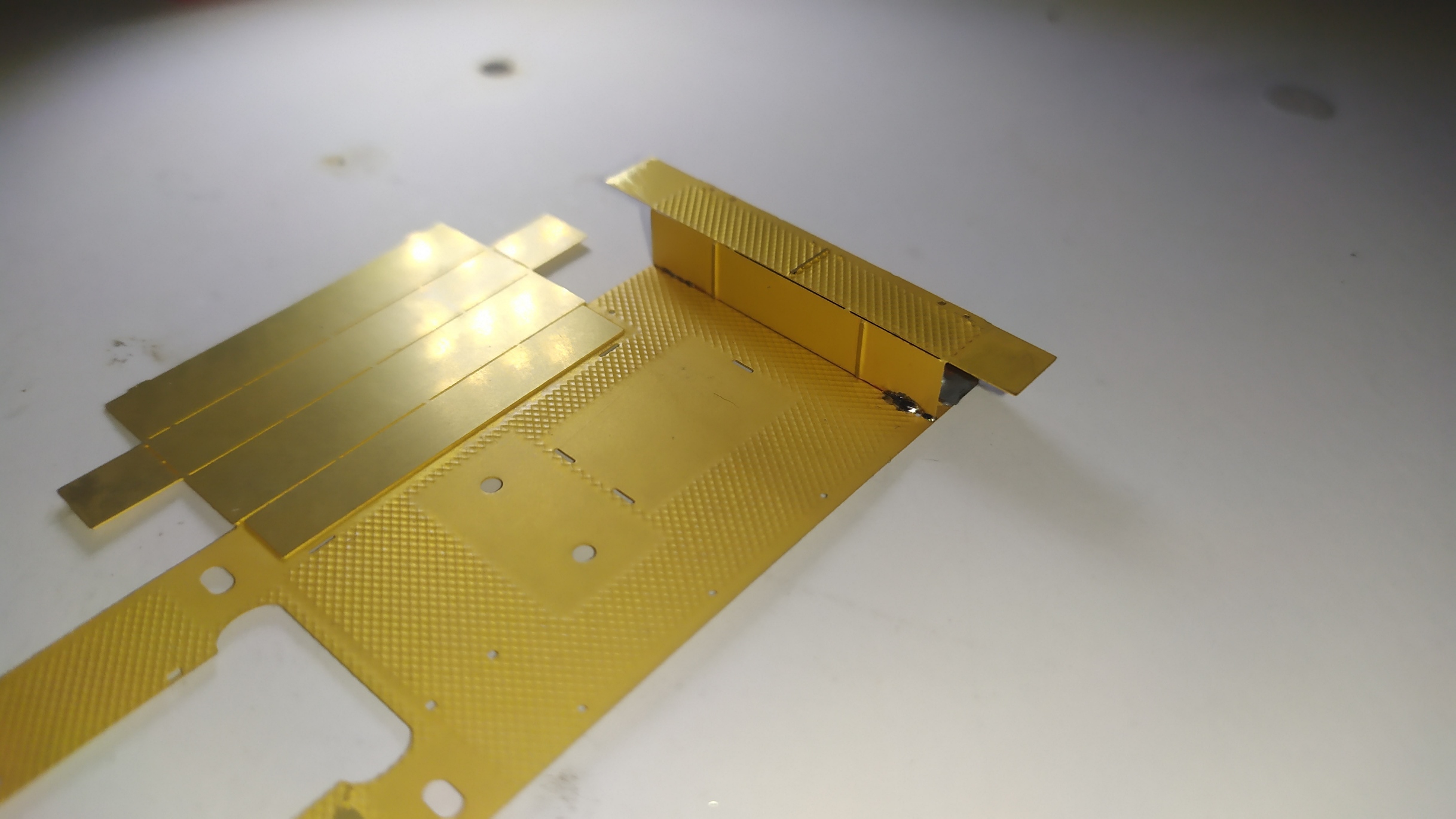 In questo caso ho risolto passando semplicemente le viti un paio di volte. Una volta saldati i dadi possiamo chiudere il supporto dell'elevatore sui 4 lati aiutandoci con del nastro carta. Altri particolari vengono piegati e montati sull'elevatore. Ringhiera elevatore. Prima prova di montaggio. Peparazione della scaletta. Questa operazione è molto delicata.