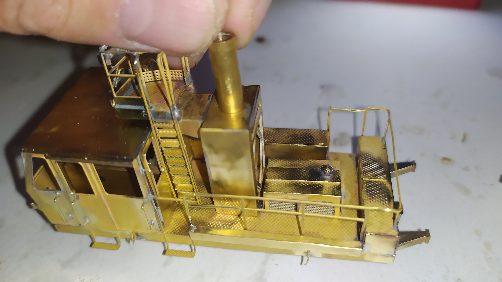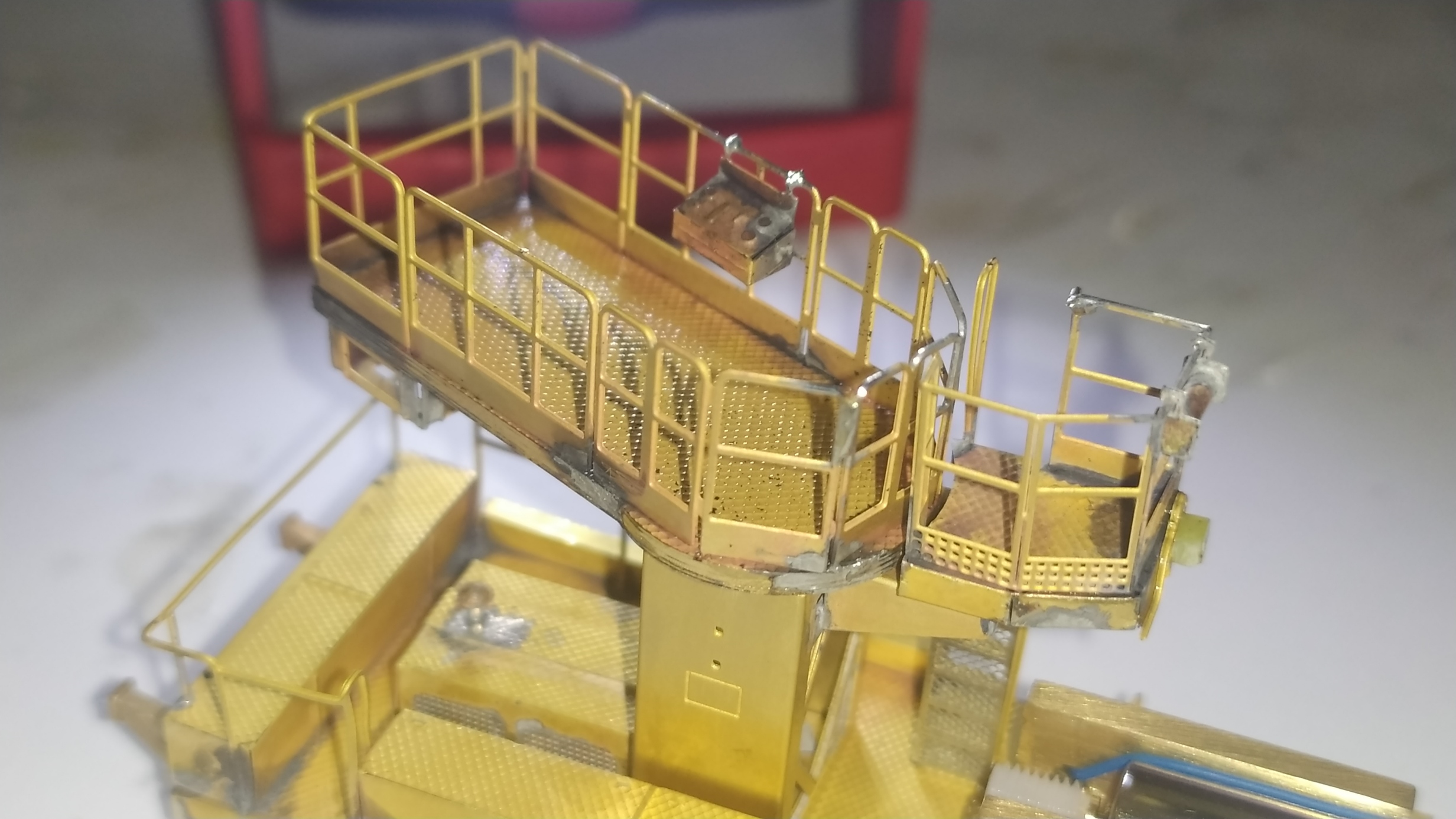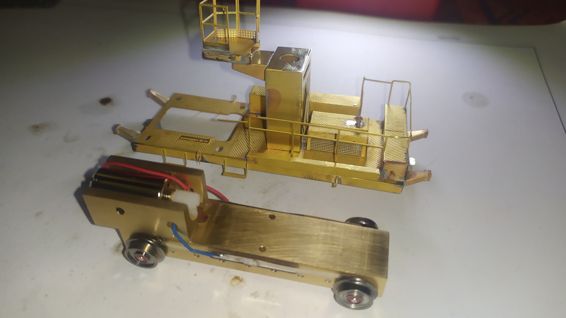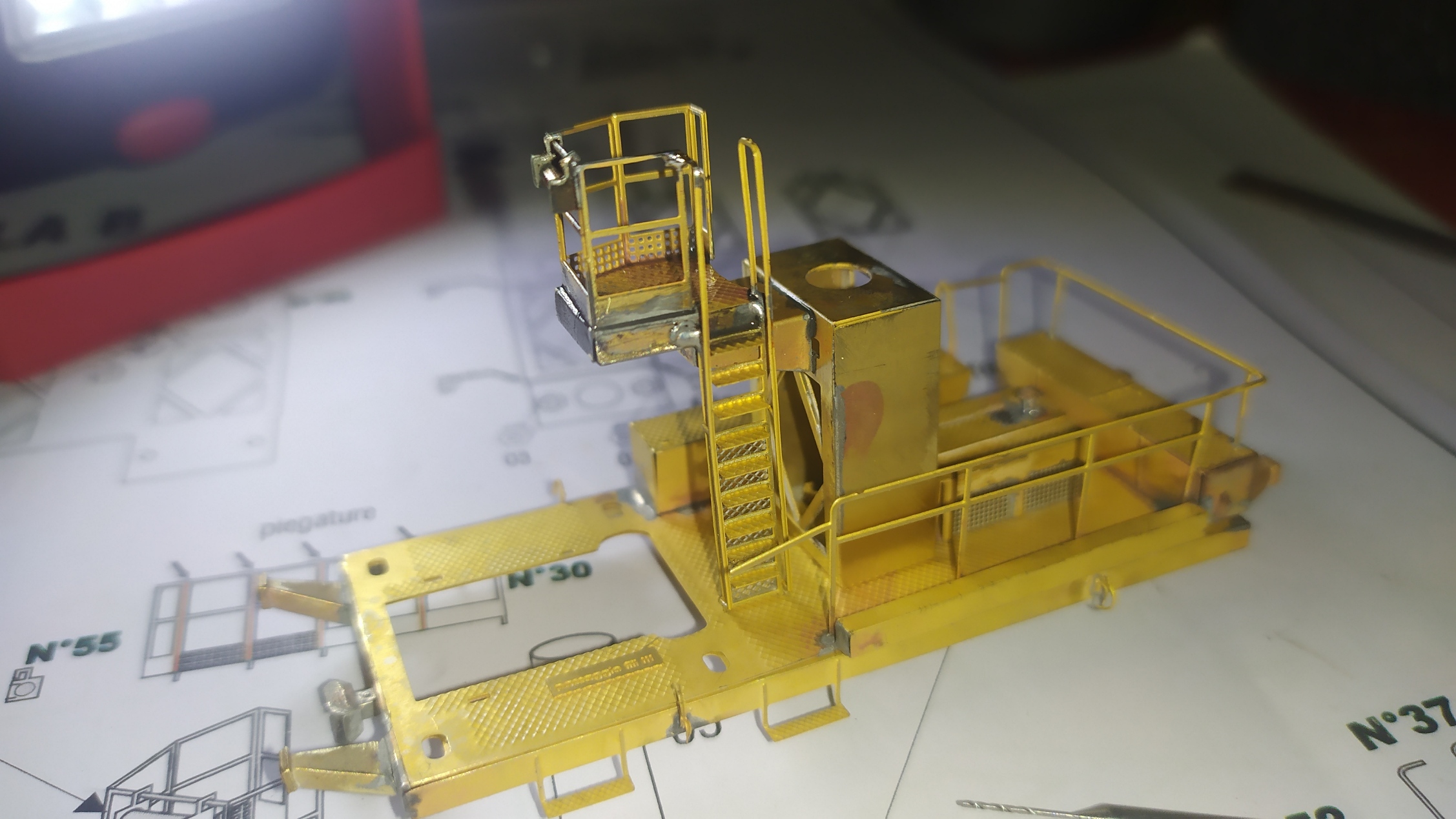 Incollaggio con cianoacrilico del retro della scaletta in alpacca. Montaggio e saldatura della scaletta sull'elevatore e relativi particolari. Prova finale con telaio motore: Manca ancora un particolare da inserire nei due forellini visibili nell'ultima foto ed anche questa fase dell'assemblaggio è completata.