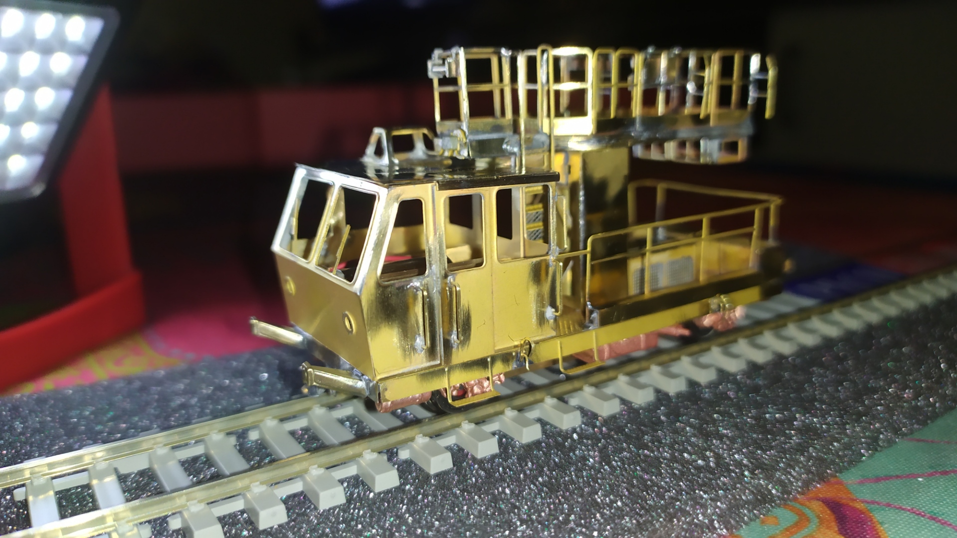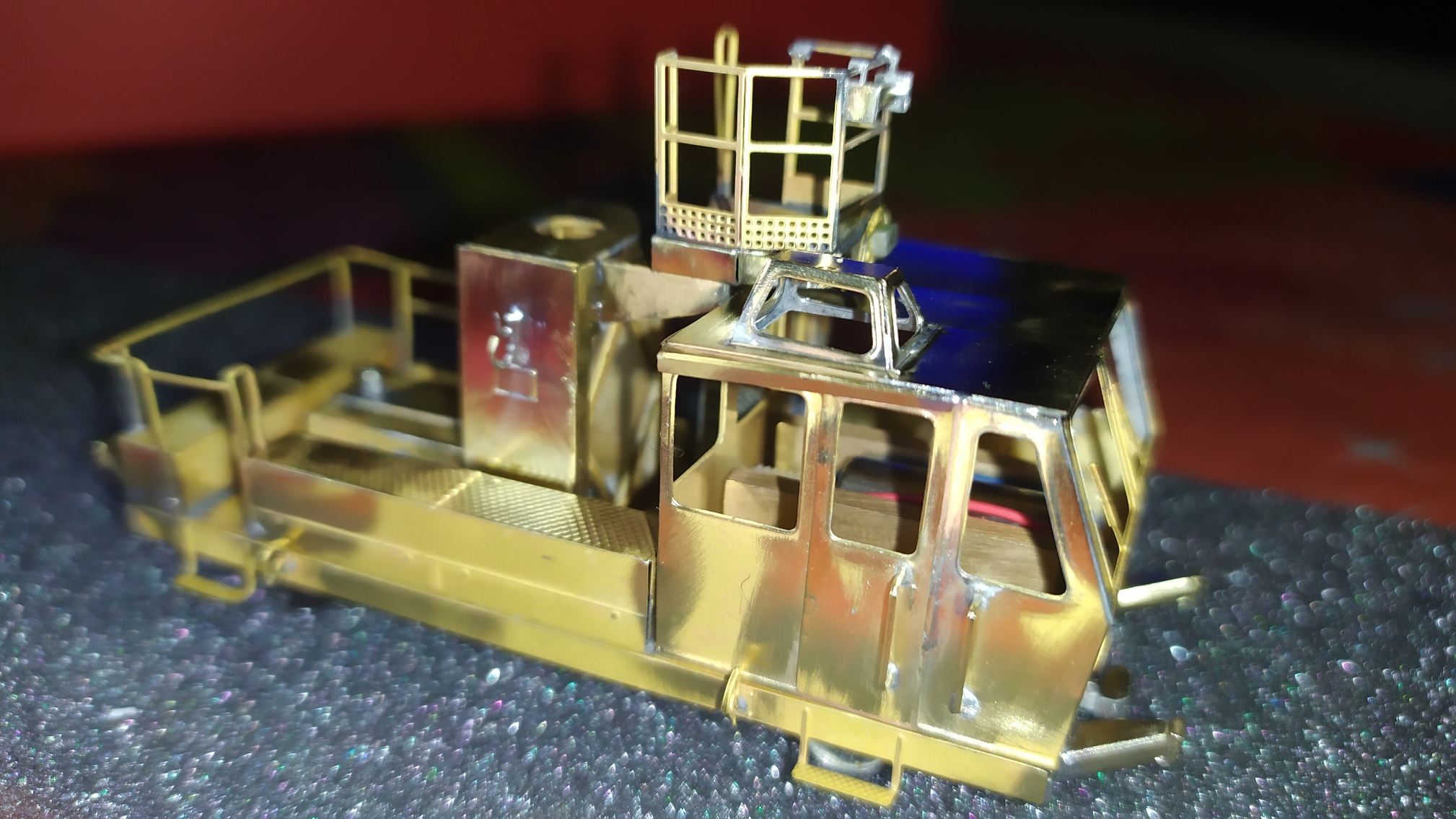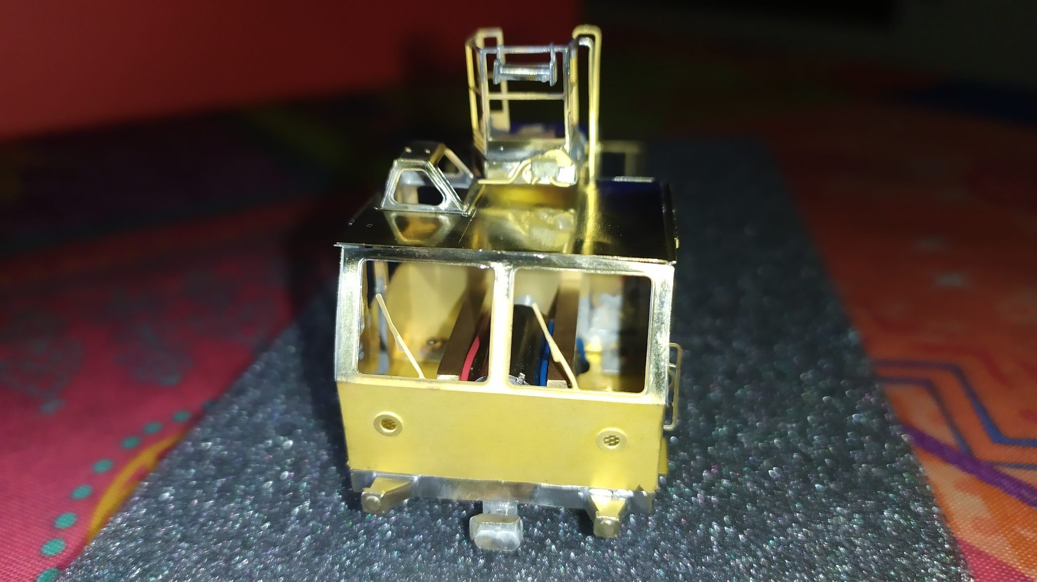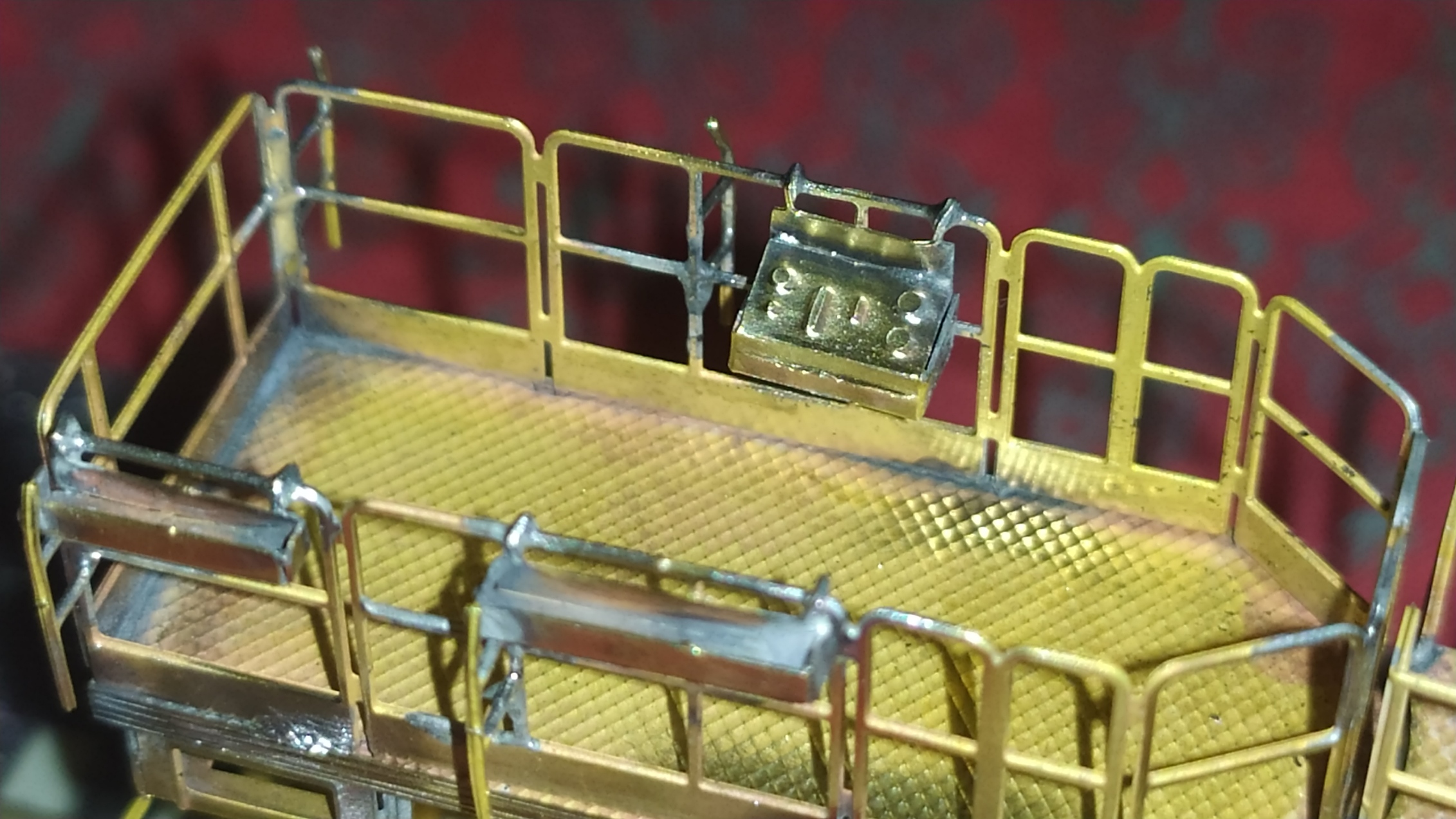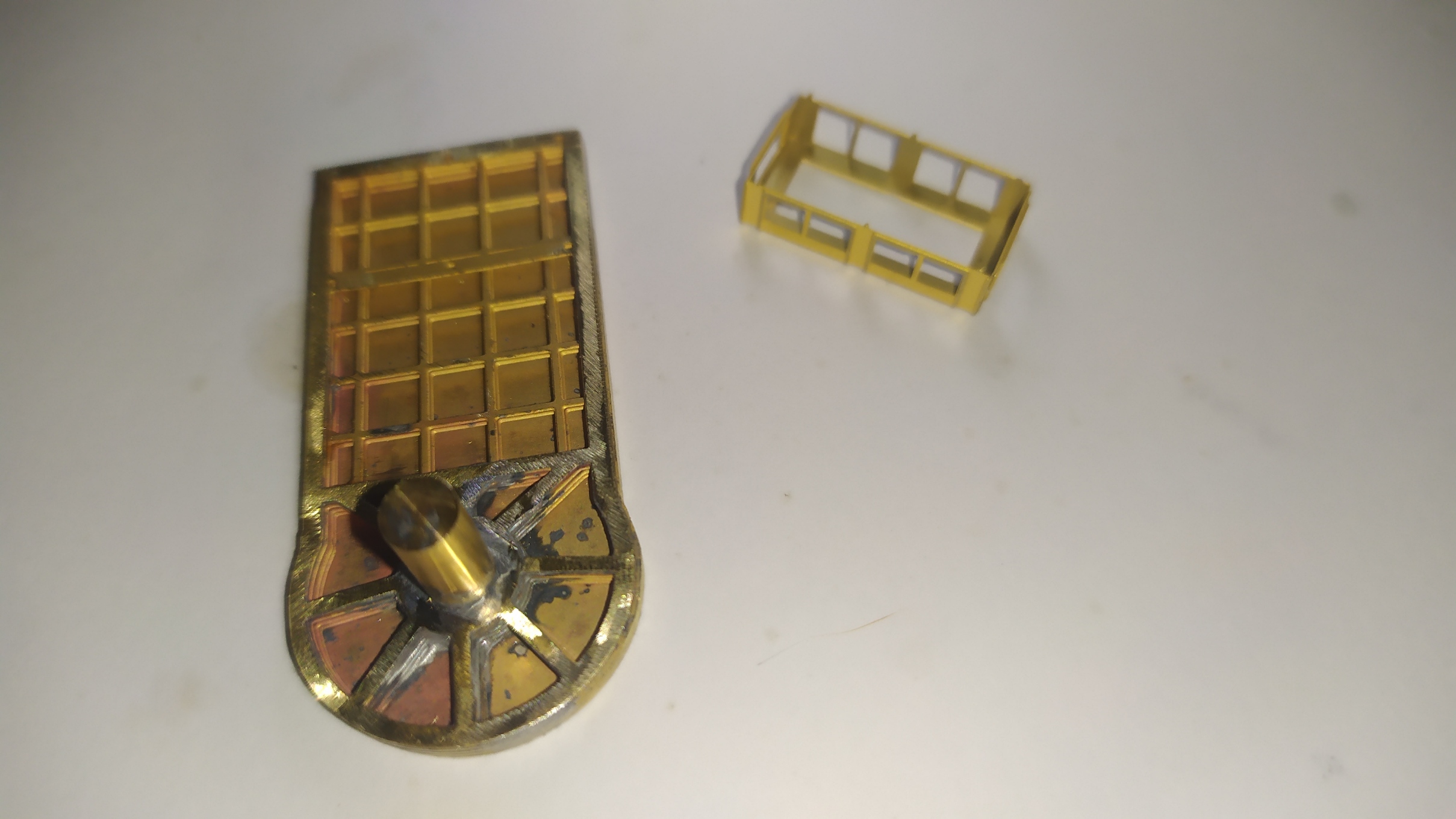 Incollaggio con cianoacrilico del retro della scaletta in alpacca. Montaggio e saldatura della scaletta sull'elevatore e relativi particolari. Prova finale con telaio motore: Manca ancora un particolare da inserire nei due forellini visibili nell'ultima foto ed anche questa fase dell'assemblaggio è completata.