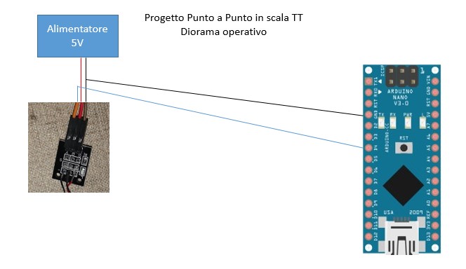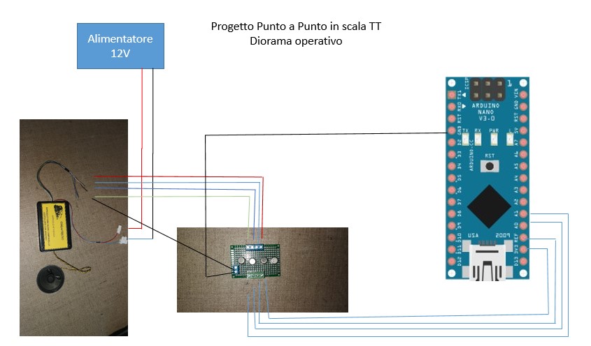 Con l'uscita a 14V AC attraverso una sceda autocostruita, trasformo in 12V CC ed alimento Arduino, il modulo suoni, i relè 12V, i segnali, le luci varie della stazione e cittadella e attraverso una scheda commerciale trasformo la 12V in 5V ed alimento i dispositivi a 5V relè e sensori.