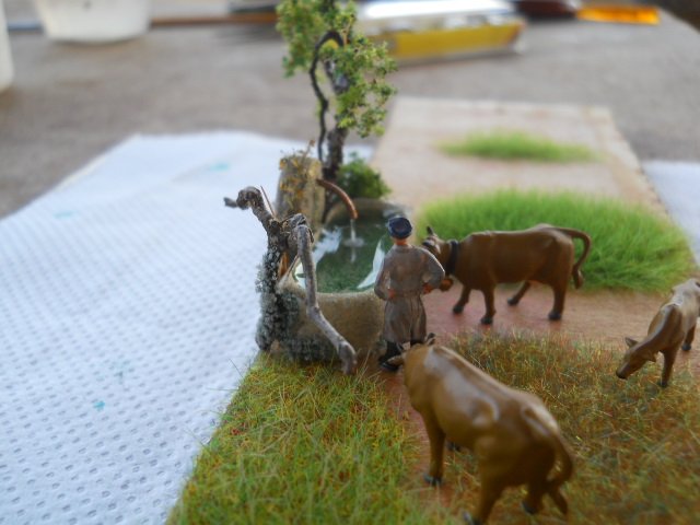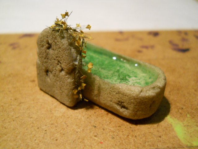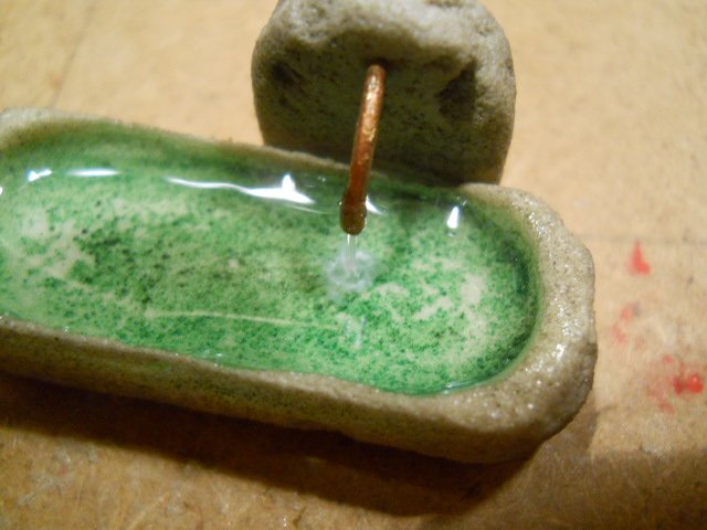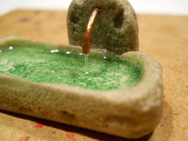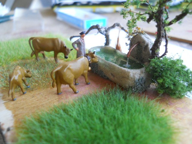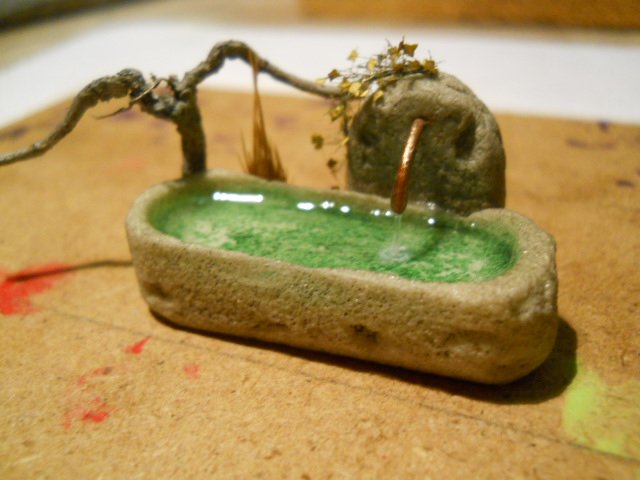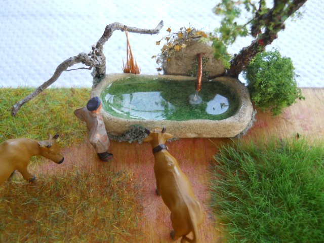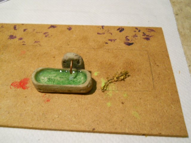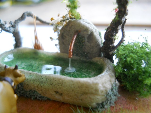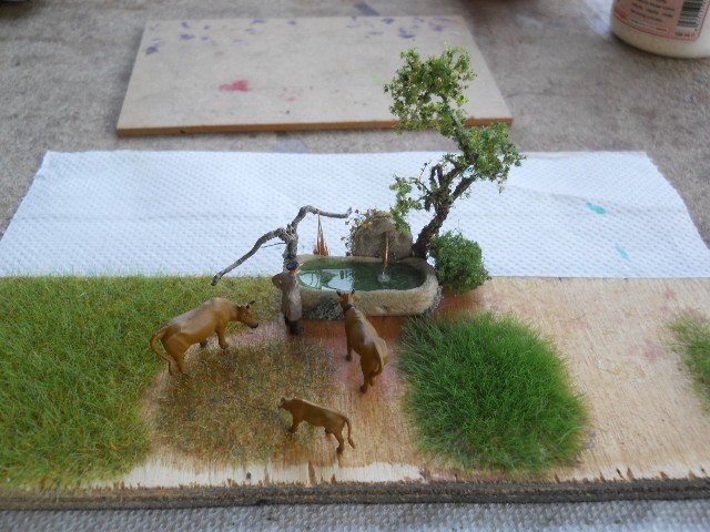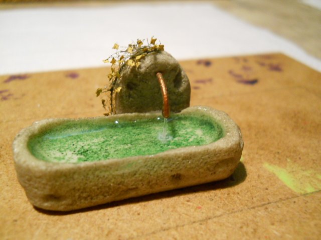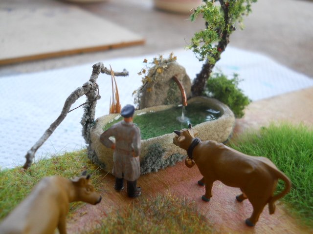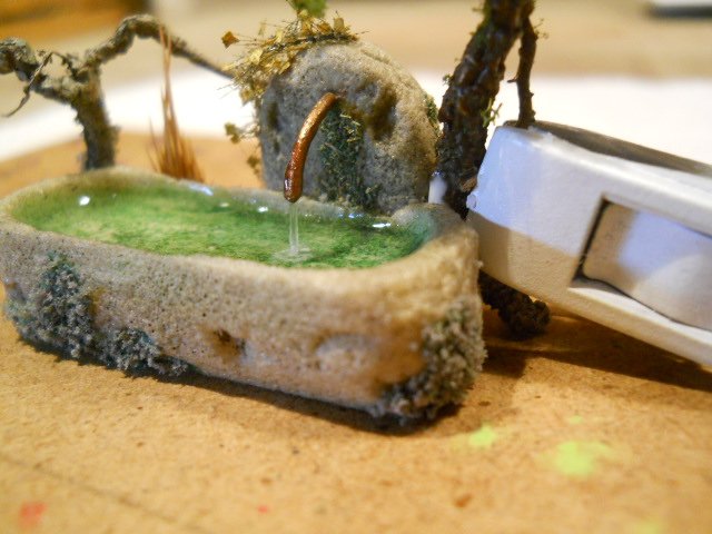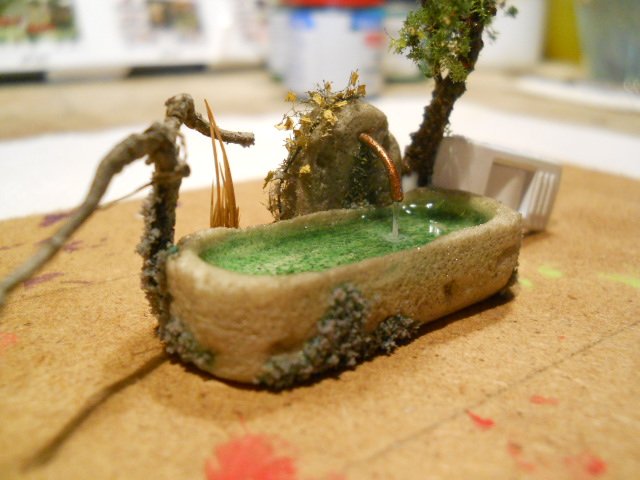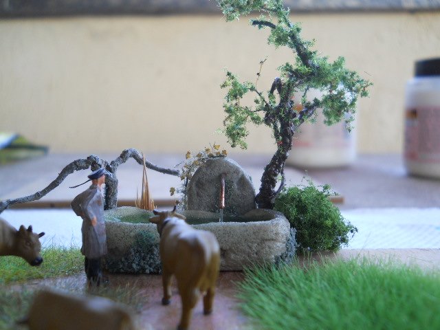 ciao, finita la fontana abbeveratoio, incollata la pianta e ritoccato con gel acrilico opaco il getto dell'acqua, fatta scenetta al volo giusto per due foto,,,,😊