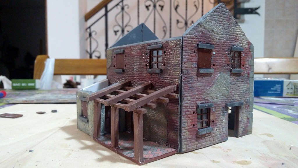 Quindi ho scollato e rimontato il tetto del loggiato in maniera corretta, stuccato i tagli e gli angoli per avere una struttura uniforme dove non si notano gli attacchi, inizialmente volevo togliere le riproduzione delle pietre ad angolo in quanto alcune erano rimaste, alte erano state rimosse durante il ridimensionamento, ma poi con la stuccatura è nato quell'effetto po' si vede un po' no come se fossero pietre di sostegno e mi è piaciuta e l'ho lasciata. :)