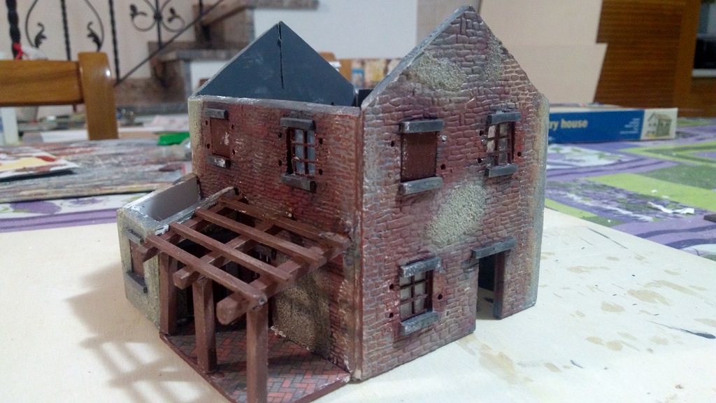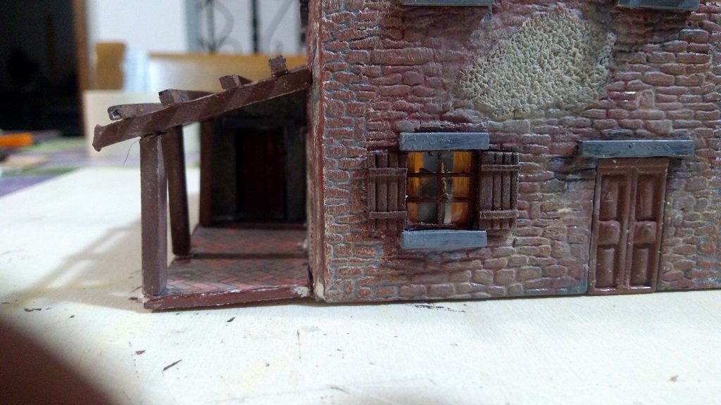 Avevo parlato di elaborazione, infatti su un lato della casa ho realizzato un esenzione della stessa realizzando con una piccola stanza e un loggiato, Con il Forex da a 5mm ho realizzato la stanza mentre il loggiato e stato realizzato con listelli di legno da 2x5mm e 2x2mm, il pavimento del loggiato è una stampa di un pavimento in cotto trovato in rete e ridimensionato in scala.