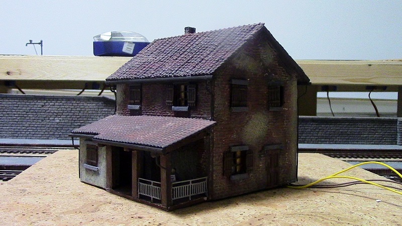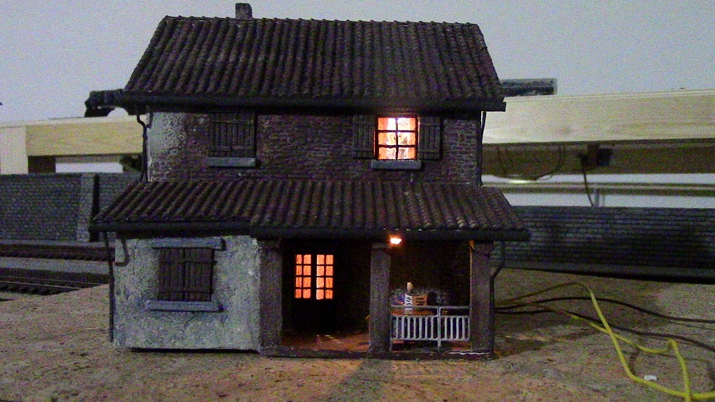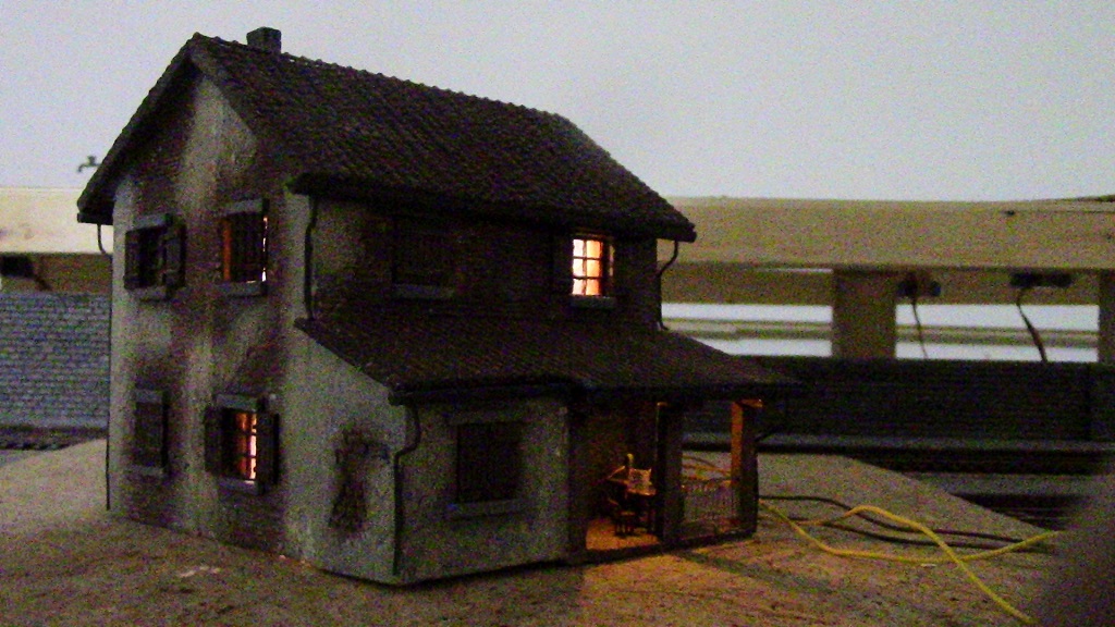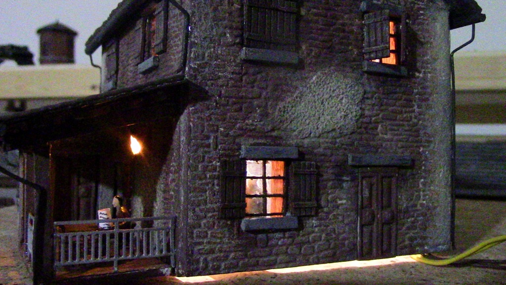 Siamo arrivati quindi agli ultimi passaggi, ho realizzato con una lastrina a coppi commerciale il tetto della esenzione della casa, colorato seguendo le tonalità dell'altro, inserito sotto la loggia un tavolo e 4 sedie(kit presier che è stato colorato color legno) ed un omino che legge il giornale oltre la ringhiera 3D colorata color zinco made in Salvatore, inizialmente non avevo previsto l'illuminazione della loggia ma poi ho notato che la loggia al buio non mi piaceva, quindi ho forato la plastica e passato da dentro un led da 3mm, poi con un po' di carta tagliata a misura e colorata in nero ho realizzato il rivestito per simulare un applique esterno.