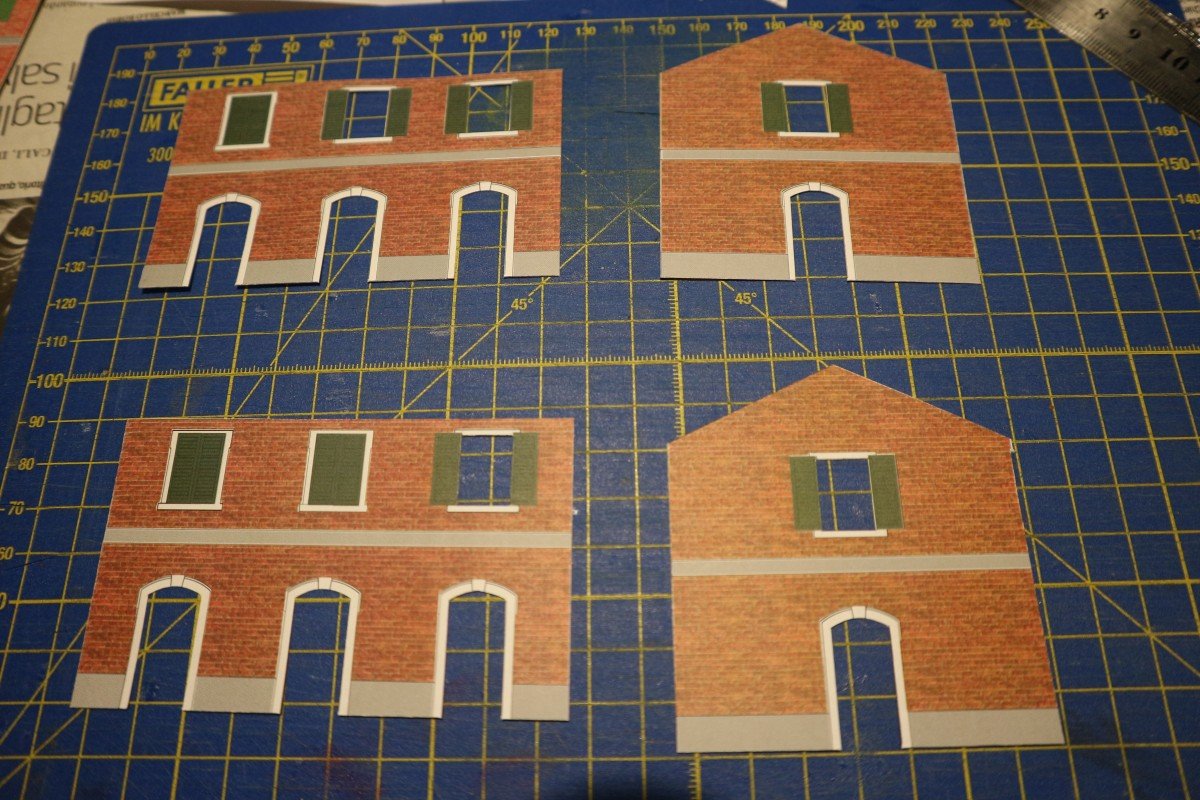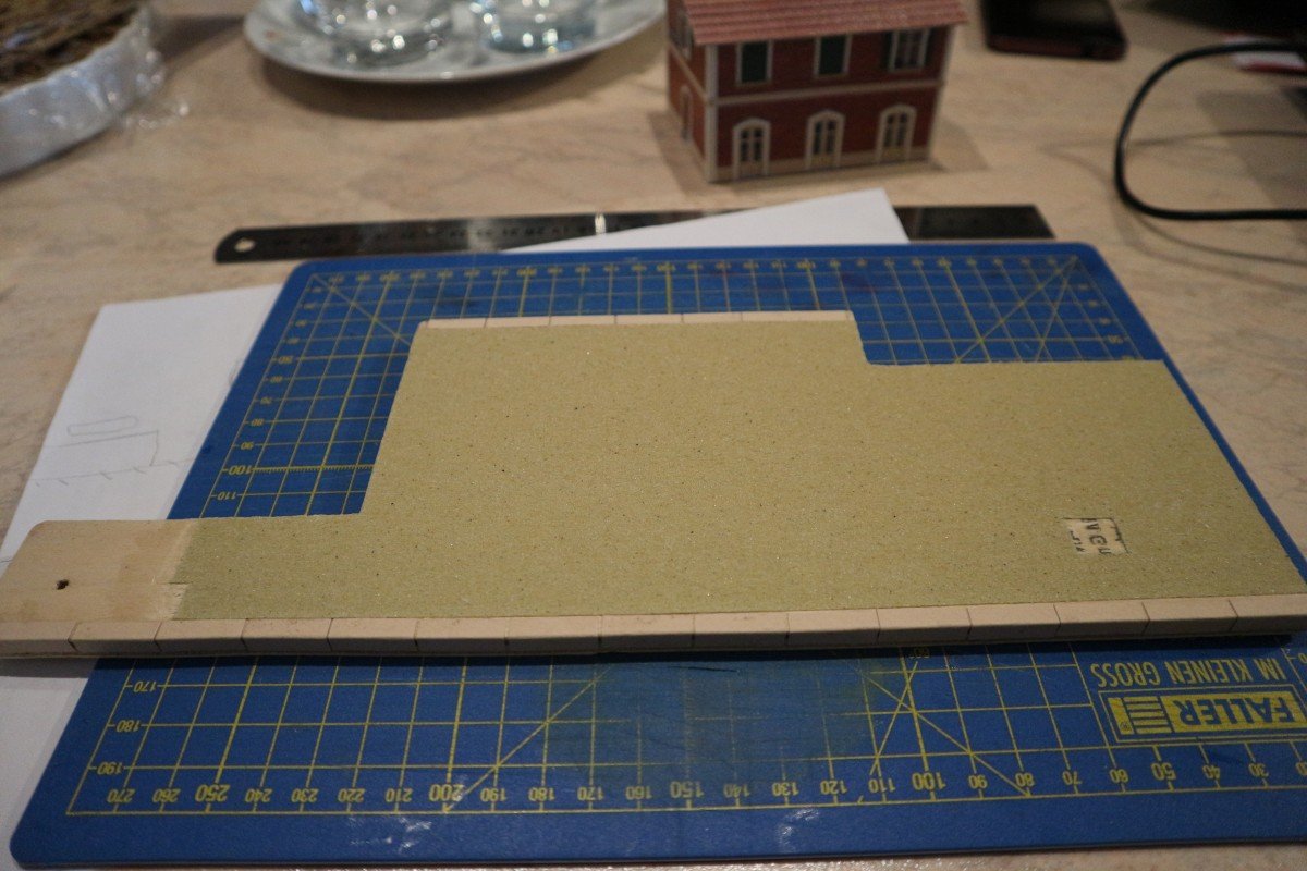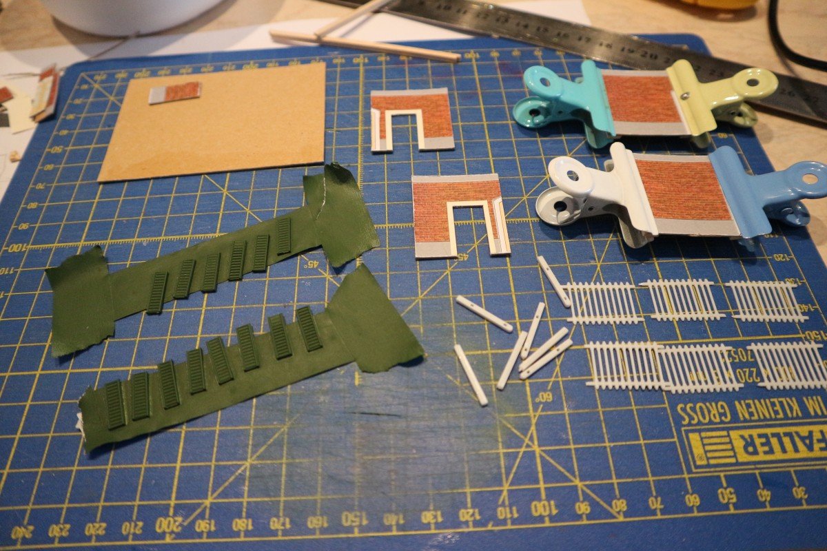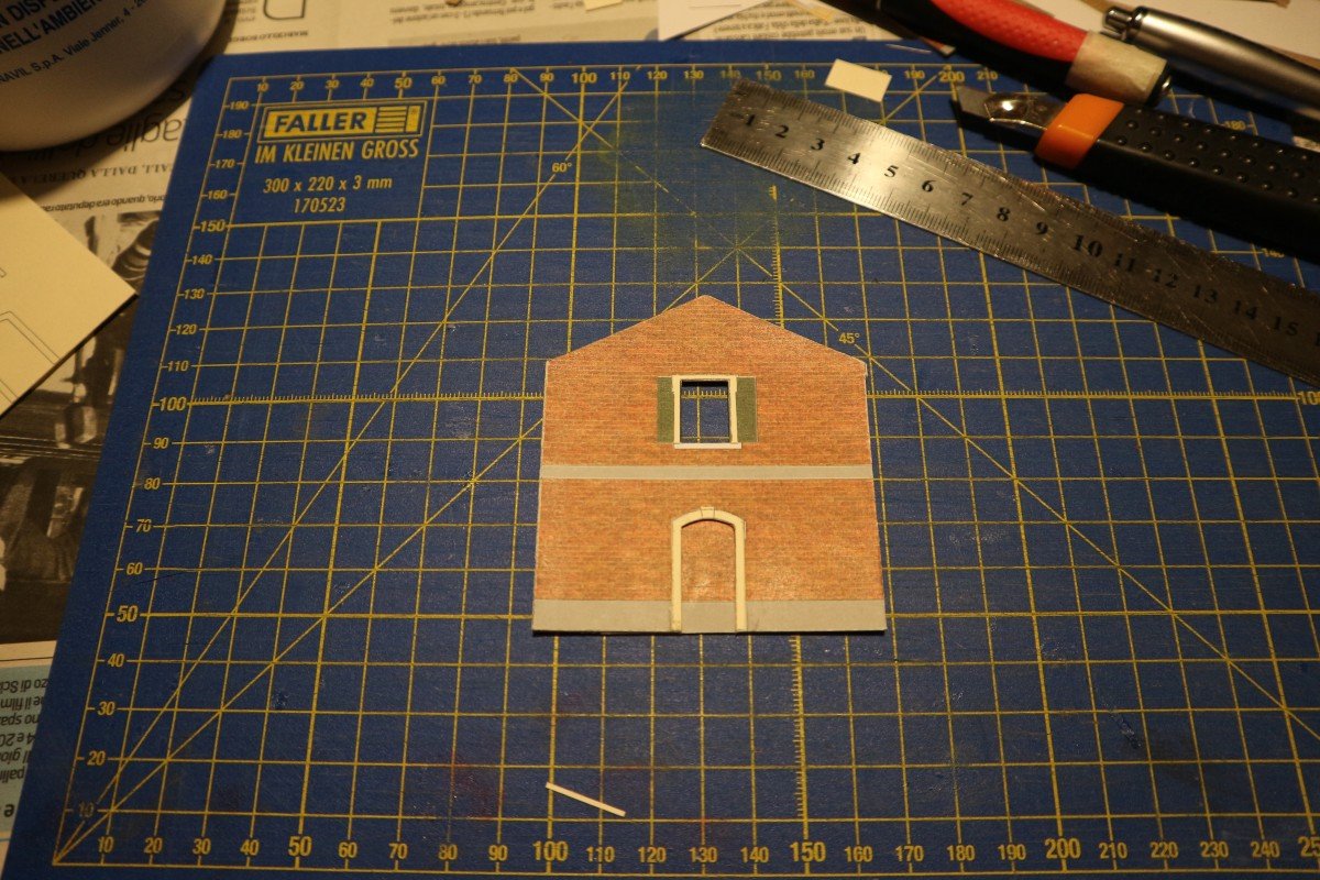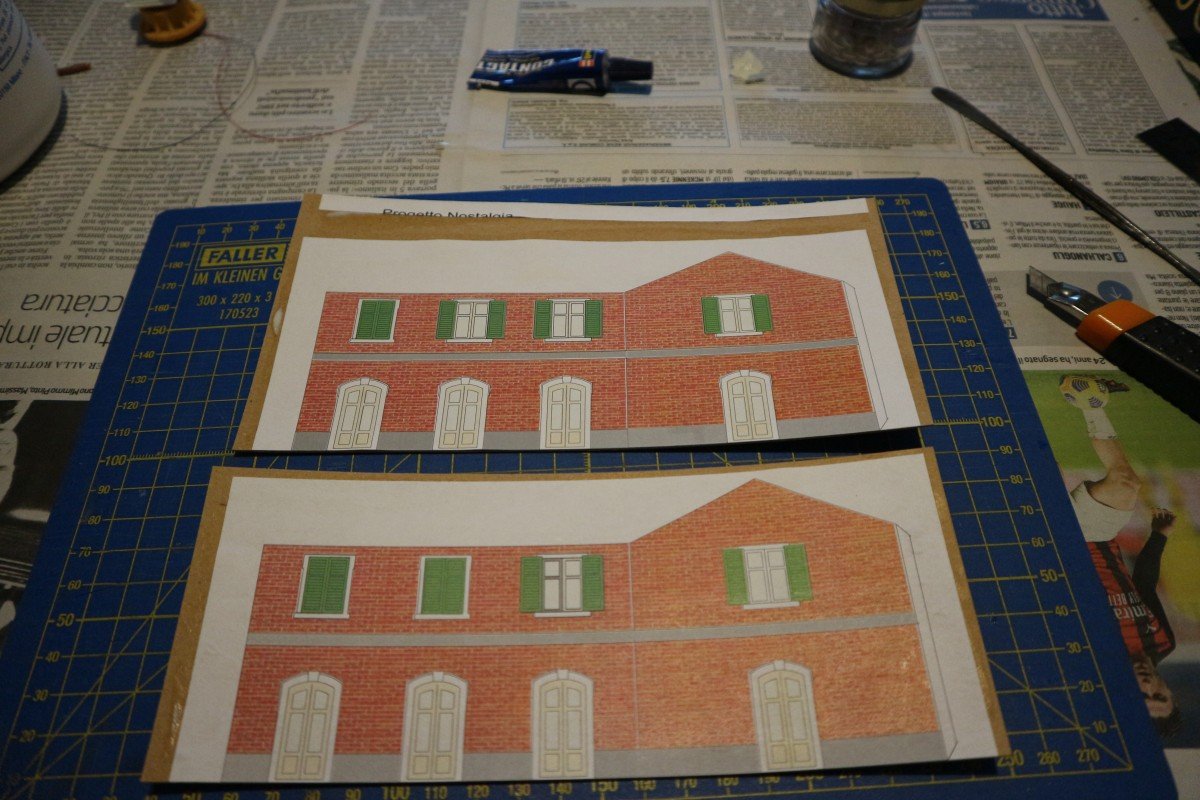 Base cartoncino "amazon" su cui ho incollato le stampe della stazione Per dare più movimento ho riprodotto le cornici delle porte e le ho stampate su cartoncino Carson La base di compensato ricoperta con carta vetrata Per le persiane le solite fascette da elettricista e un po' di staccionata FS.