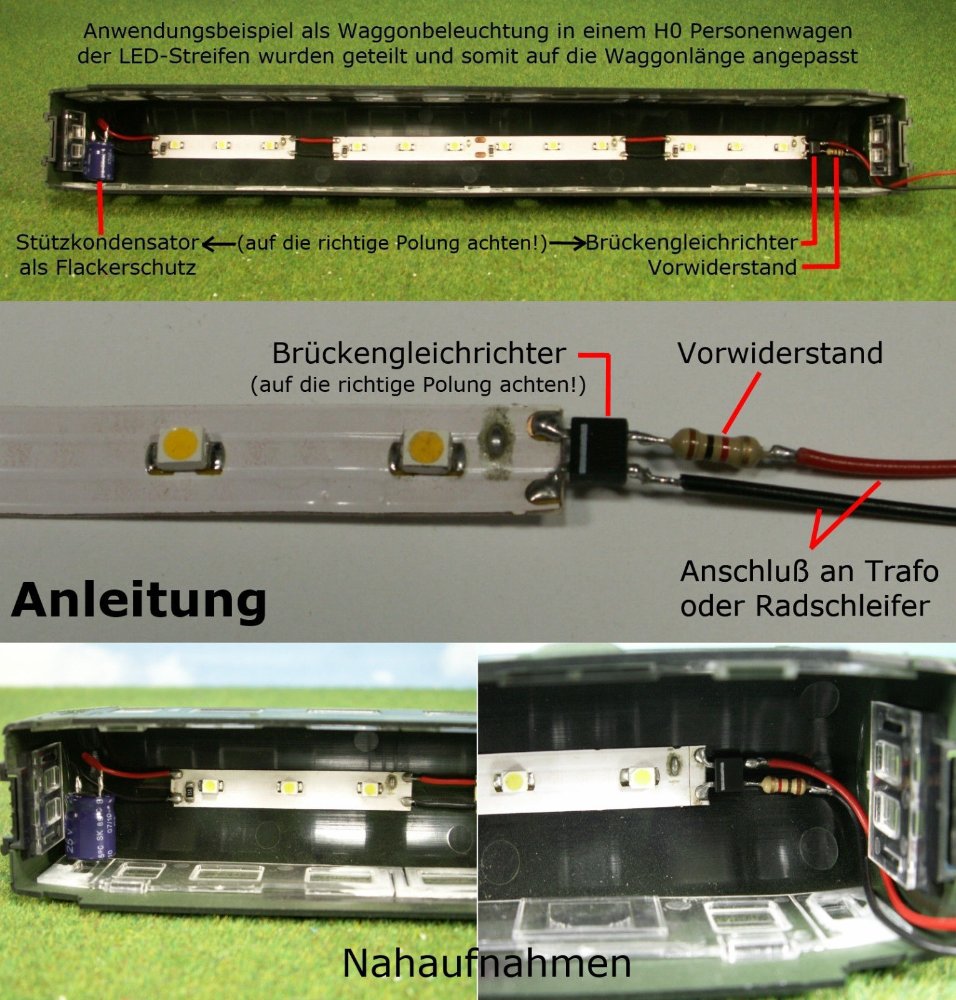 - la resistenza si può/deve installare ugualmente, come in foto, per "dimmerare" la striscia di led che generalmente è troppo luminosa e genera un effetto sala operatoria all'interno della carrozza.