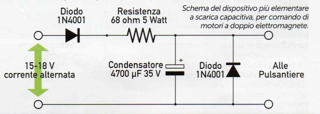 Veniamo a noi, agli scambi elettromagnetici serve un'alta quantità di corrente in poco tempo e le strade per realizzare ciò sono due: o si dispone di grossi alimentatori capaci si erogare forti correnti (come se in casa avessimo rubinetti capaci di erogare grosse quantità d'acqua in poco tempo) oppure usiamo alimentatori più piccoli che caricano uno o più condensatori che avranno la capacità di erogare grosse correnti in poco tempo... proprio come lo sciacquone! il circuito a scarica capacitiva non fa altro che caricare un condensatore e scaricarlo all' occorrenza sulla bobina dello scambio, e occorrerà un pò di tempo prima di avere la possibilità di azionare nuovamente lo scambio, ovvero il tempo della ricarica del condensatore.