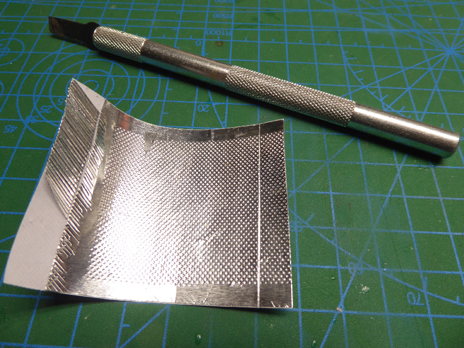 Il suggerimento economico e facilissimo che qui voglio lasciare, riguarda la realizzazione del problema per i rotabili , in particolare le locomotive , che presentano i praticabili antiscivolo zigrinati ; non le ho mai viste ma sicuramente in commercio esistono costose fotoincisioni per dettagliare meglio i modelli ; io penso che si possa evitare rapidamente tale scelta in questo modo : avete visto che faccio uso del nastro adesivo di alluminio per idraulica, con un alto potere aderente ...tutti noi possediamo comunemente però un tagliabalsa o bisturi che usiamo continuamente, se lo osserviamo ha il manichetto zigrinato ( viene realizzato in se industrialmente al tornio con un utensile , il " goffratore ", il mio tornio non me lo permette ) . Se lo premiamo a forza sul nastro di alluminio sul tavolo, meglio se su classico tappettino verde da modellista o superficie non troppo dura e lo facciamo riotolare con un piano di ferro , ne otteniamo il ricalco a volontà del manichetto, quindi zero spesa ottima resa, e ne lascio un esempio su di un praticabile di una mia locomotiva ora in costruzione ( non vi dico quale, la foto l'ho rovinata appositamente , :D , scusatemi, lo vedrete..) quindi otterremo piccole porzioni da ritagliare a misura secondo nostra necessità ; troviamo al vero lamiere zigrinate anche su tombini, piccoli gradini di rotabili , marciapiedi o altro calpestabile ; ribadisco l'utilità grandissima di questo nastro, utilissimo in mille occasioni, vi toglie dagli inconvenienti e fastidiose difficoltà rapidamente e soprattutto invisibili a modello completato, oltre la possibilità di rivettare un modello o creare grigie di aerazione sempre difficilissme altrimenti, basta tracciare con precisione senza calcare troppo, perchè attenzione, se premiamo oltre un certo limite , il nastro si taglierà , per questo evitiamo punte troppo appuntite e mai tenute in senso verticale ! Poi anche possiamo anche rimediare alle fastidiose fessure . :D